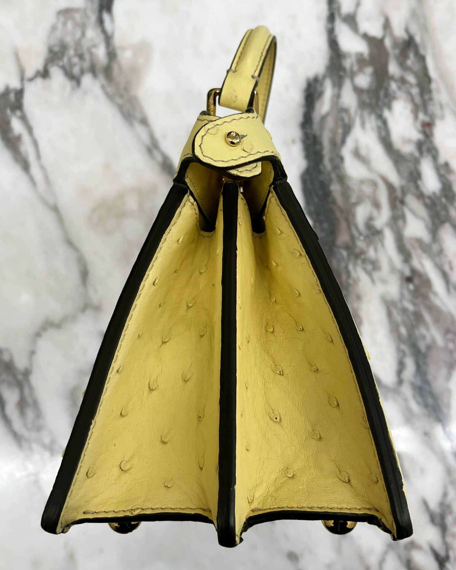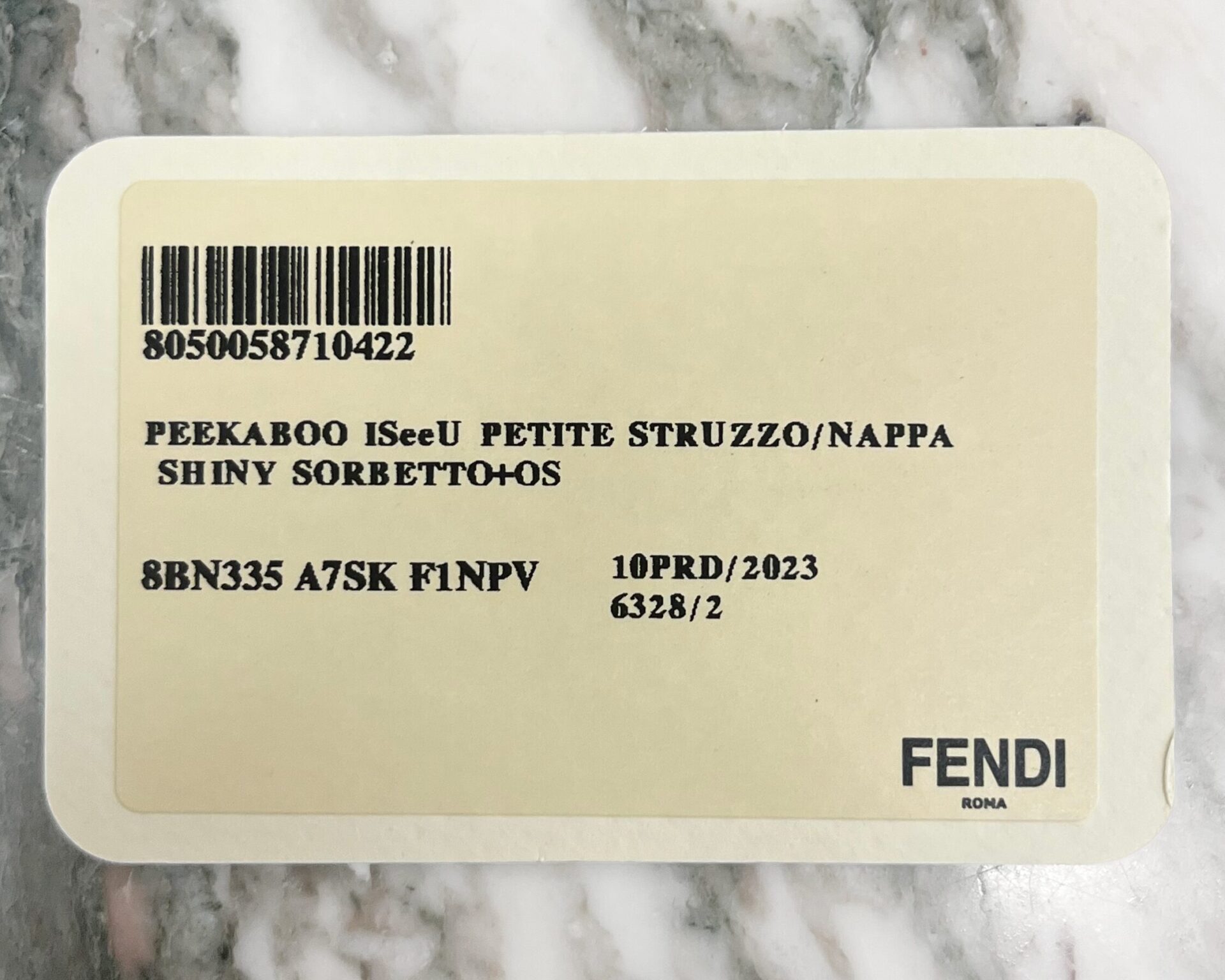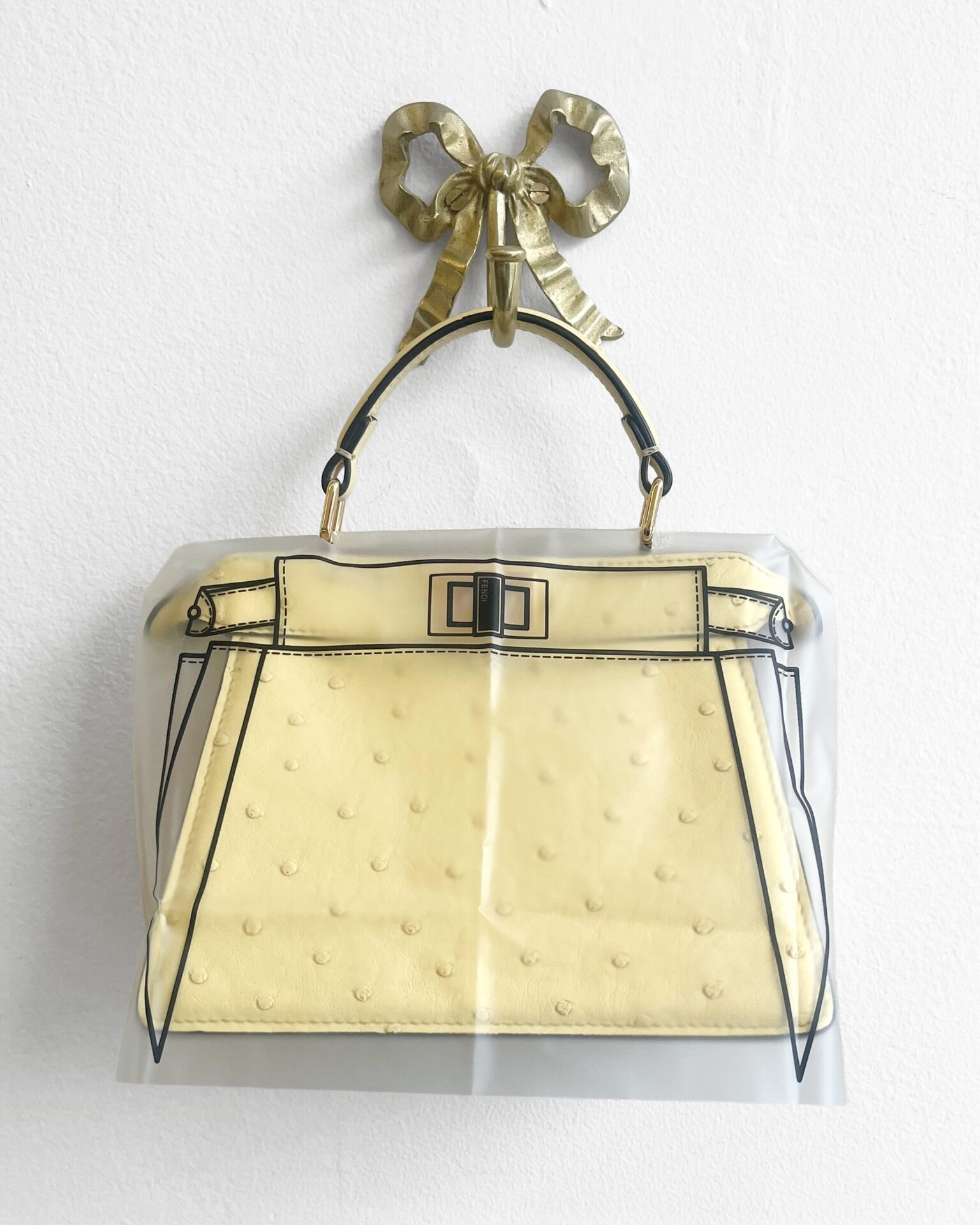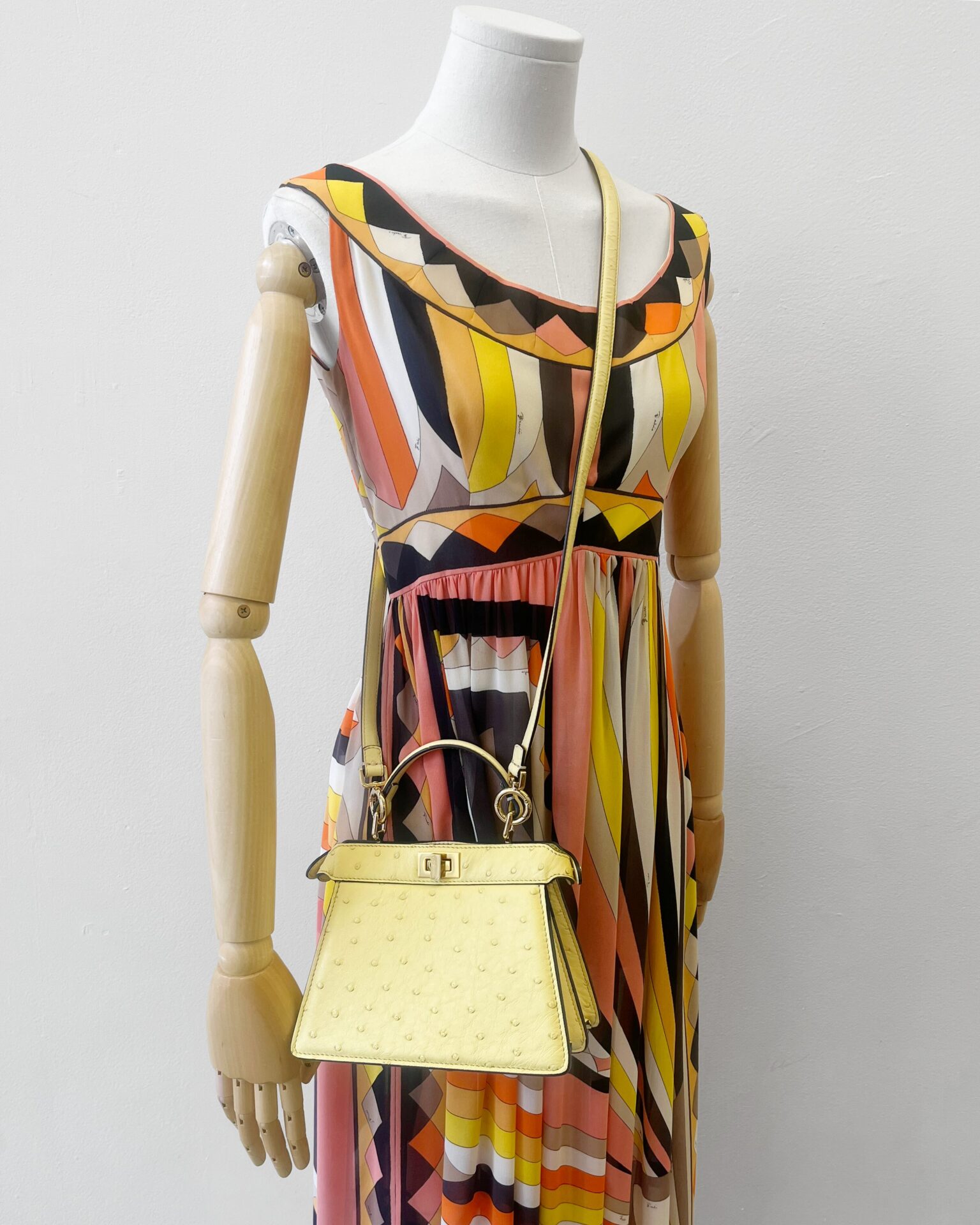 Pale yellow ostritch leather Fendi Peekaboo ISeeU petite bag, featuring gold coloured metal hardware, ‘FF’ logos engraved onto hardware on the bottom of the bag, adjustable shoulder strap, identification card, dustbag, and a waterproof rain cover.