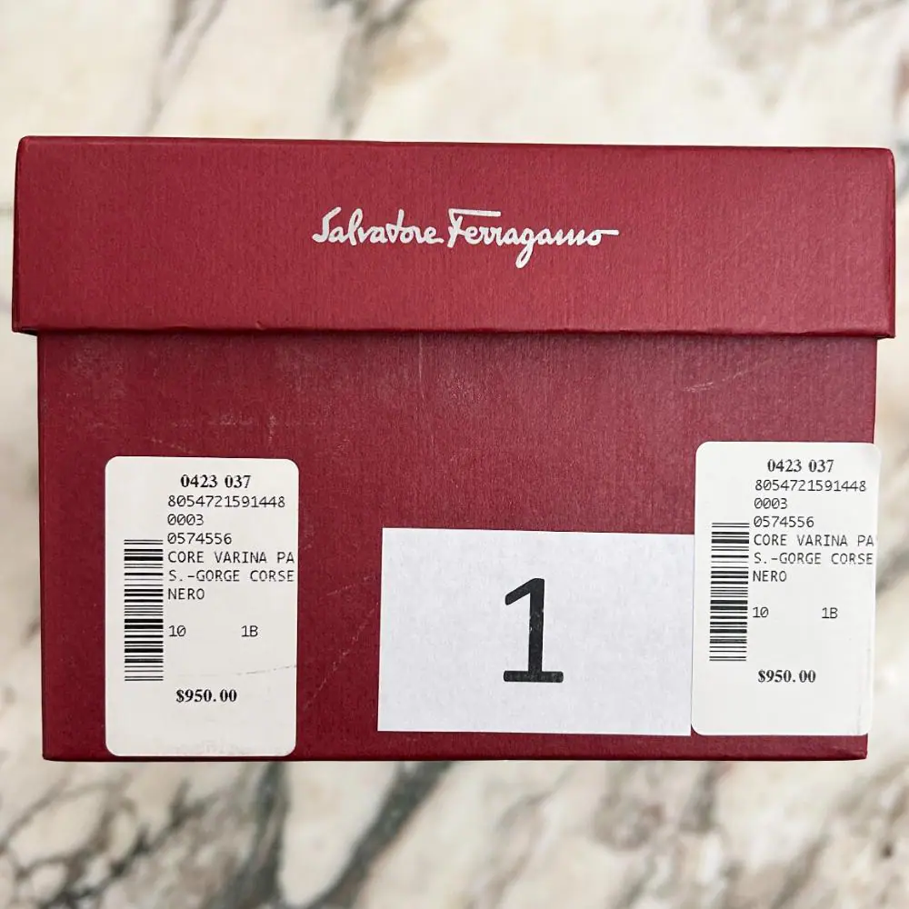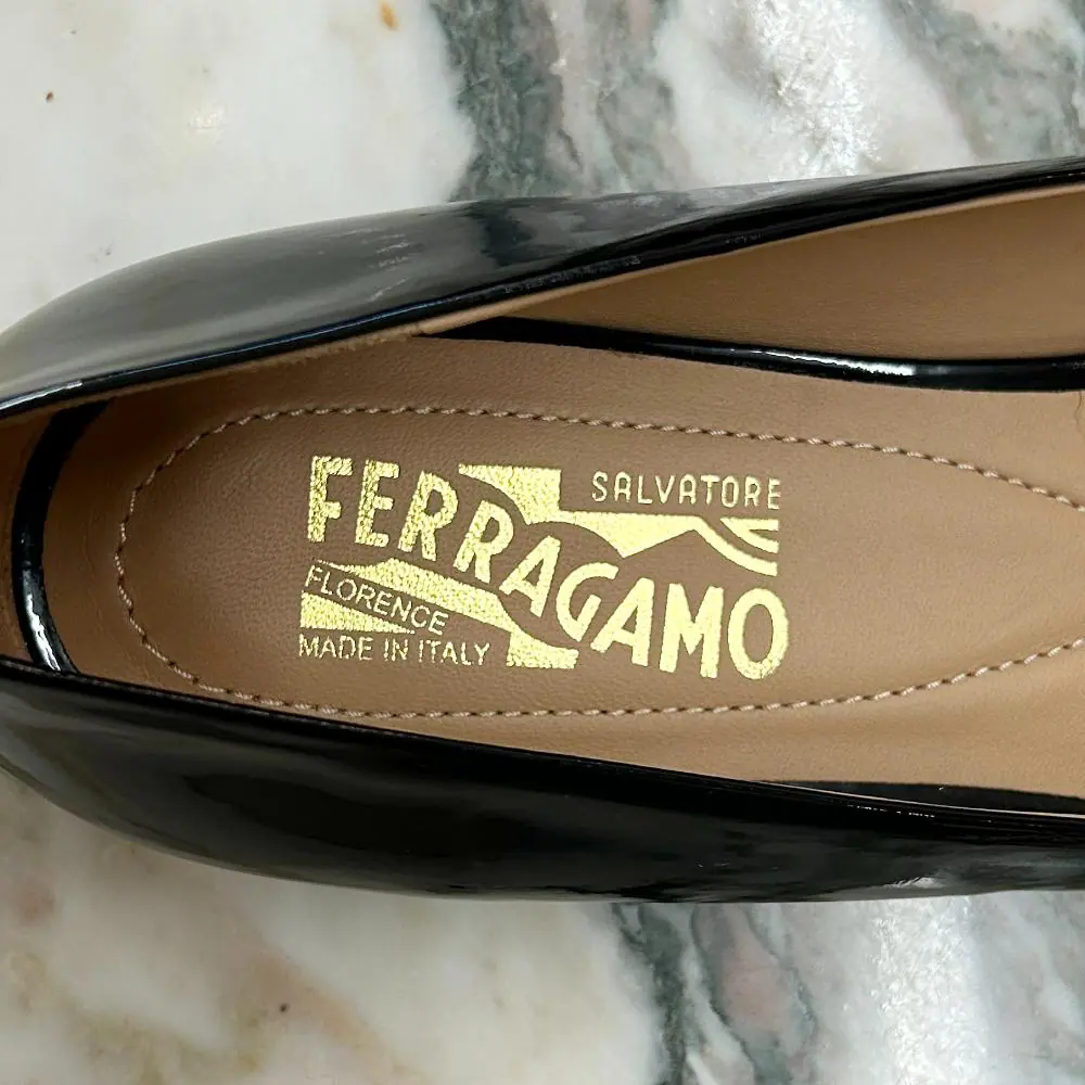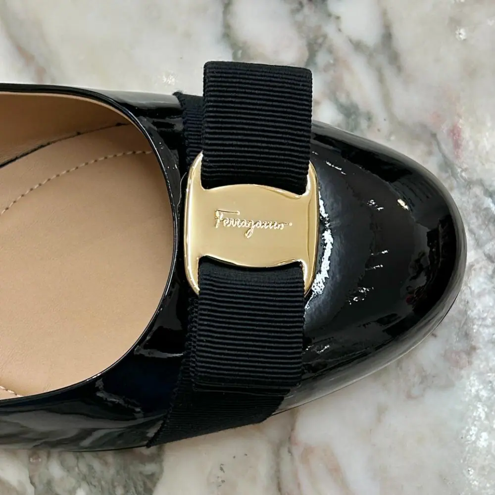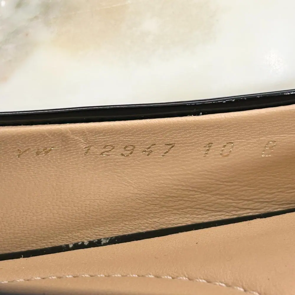 Black patent leather flats with a black grosgrain ribbon bow and gold metal buckle. The flats are lined in tan leather, and have a rubber heel. Size 10. Comes with their original box and dust bag. Condition: Purrrfect. No flaws.