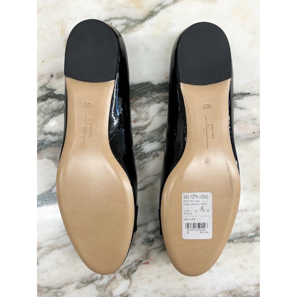 Black patent leather flats with a black grosgrain ribbon bow and gold metal buckle. The flats are lined in tan leather, and have a rubber heel. Size 10. Comes with their original box and dust bag. Condition: Purrrfect. No flaws.