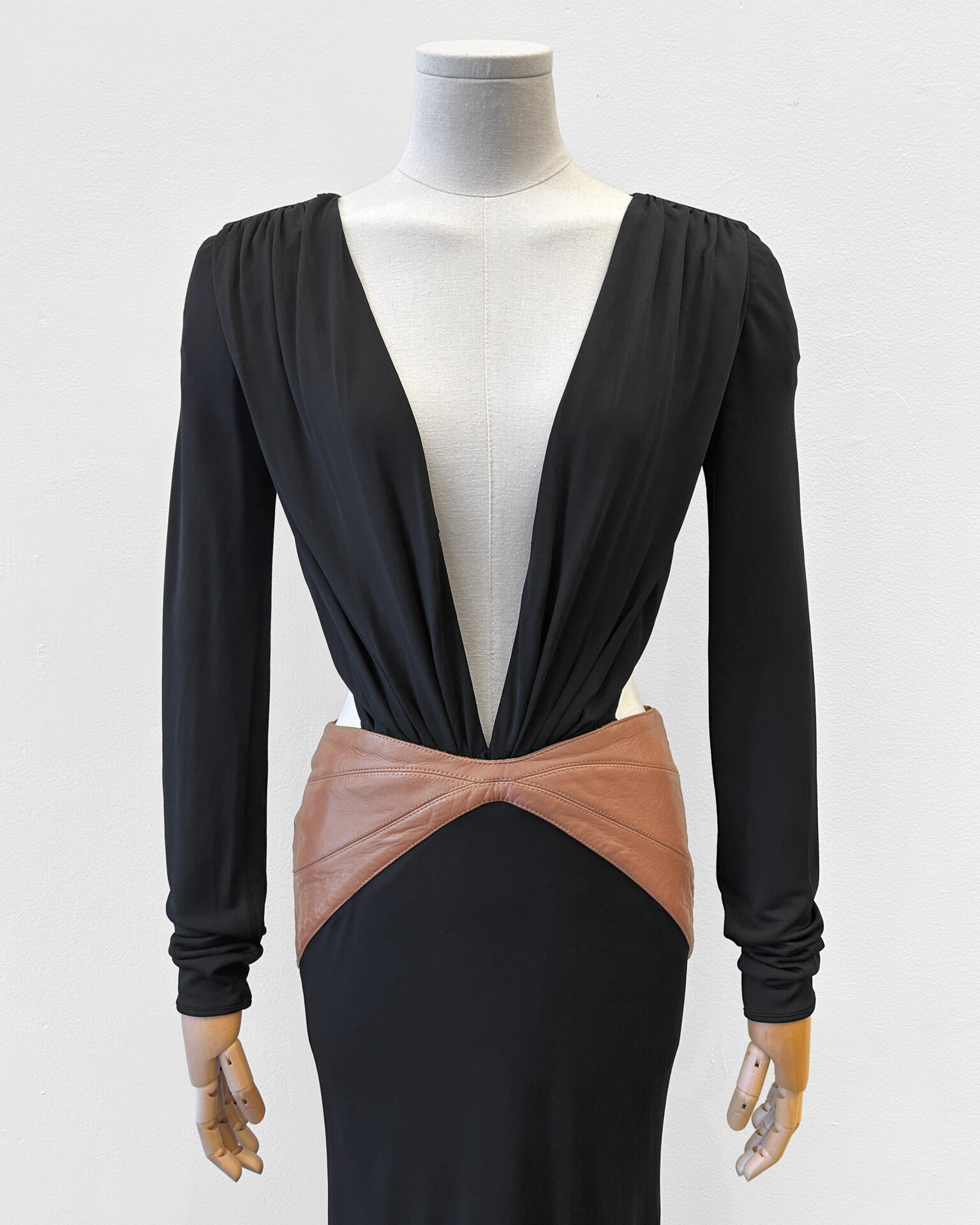 Archive 2001 Versace gown, made from black stretch jersey with a brown leather panel at the hips. The gown has long sleeves, a plunge neckline, side cutouts, a back cutout, and flounce hemline. Worn by Bella Hadid in 2022 (see last image).