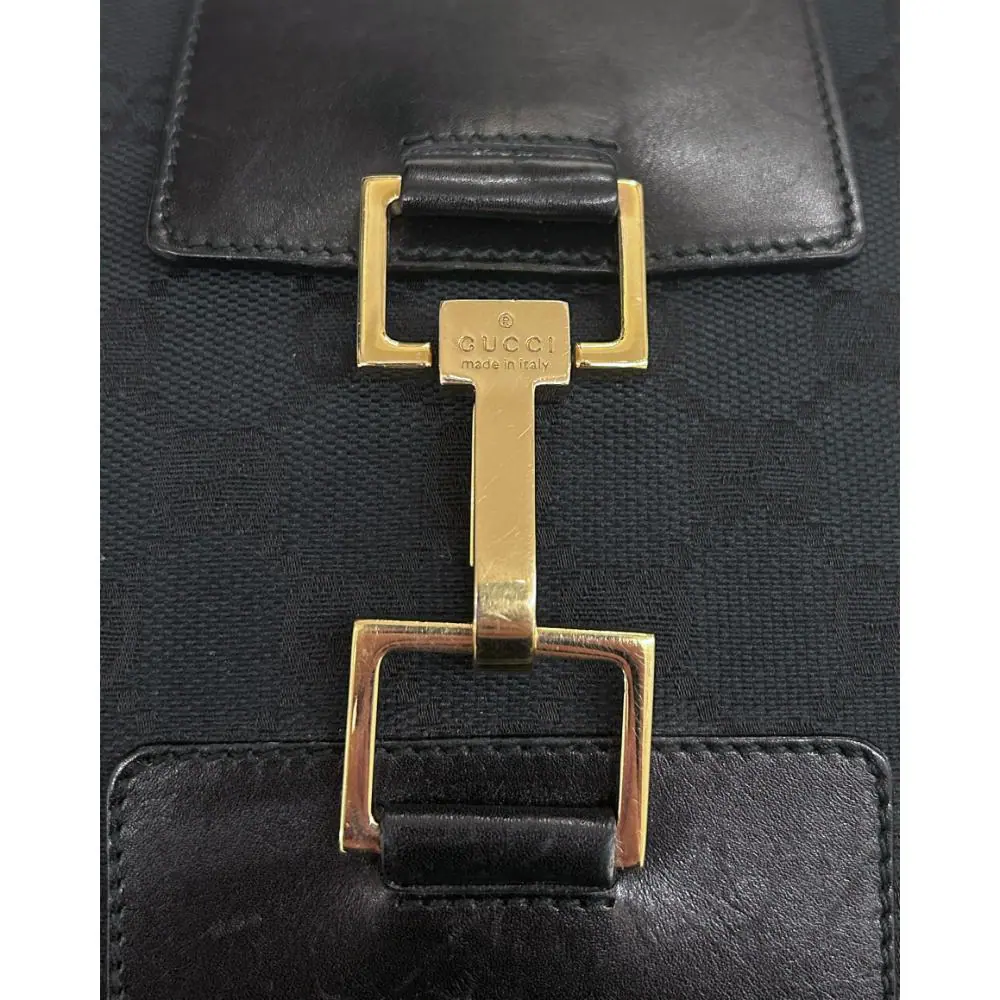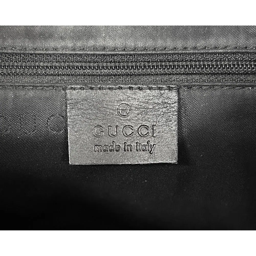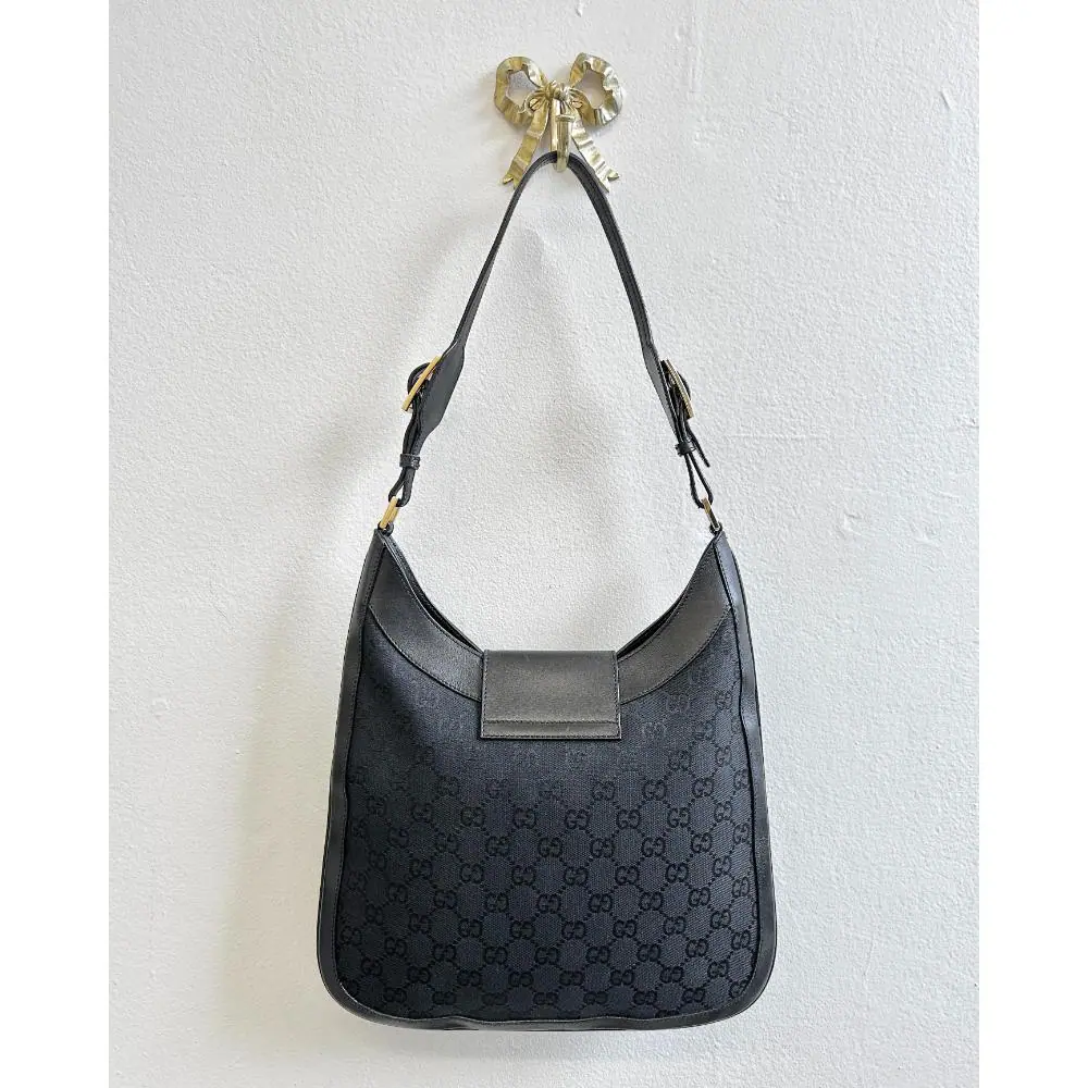 Black GG canvas shoulder bag with black leather trim and gold tone hardware. The shoulder strap has buckle detailing and the bag opens with a clipped leather flap. The bag is lined in logo print black fabric and has a zippered pocket inside. Comes with a dust bag. Bag dimensions: 11.5″ x 12″ x 2″ (W x H x D). Strap drop: 11.5″. Condition: Fairly good. The leather trim and hardware have some scratches, especially on the front. The rest of the bag is in good condition.