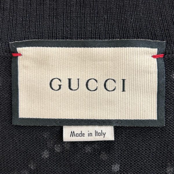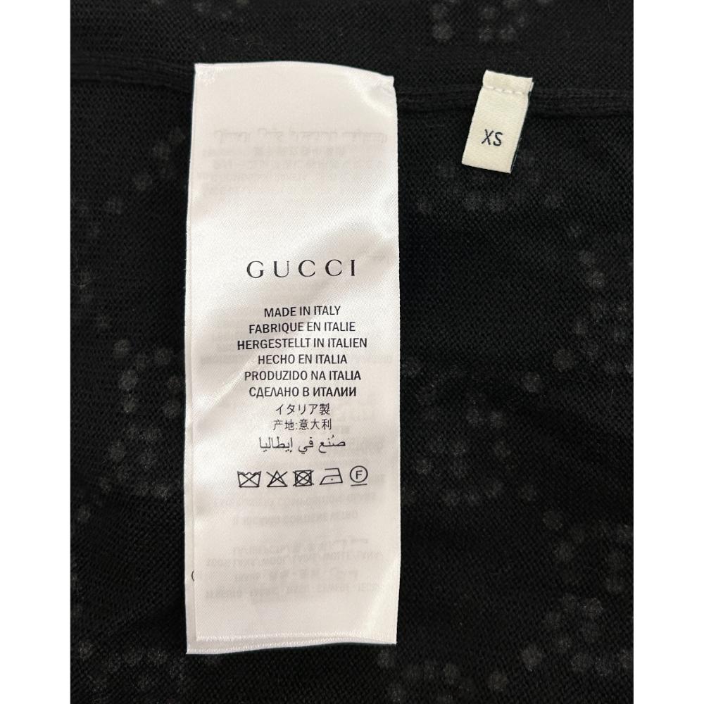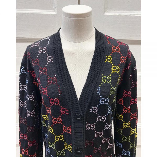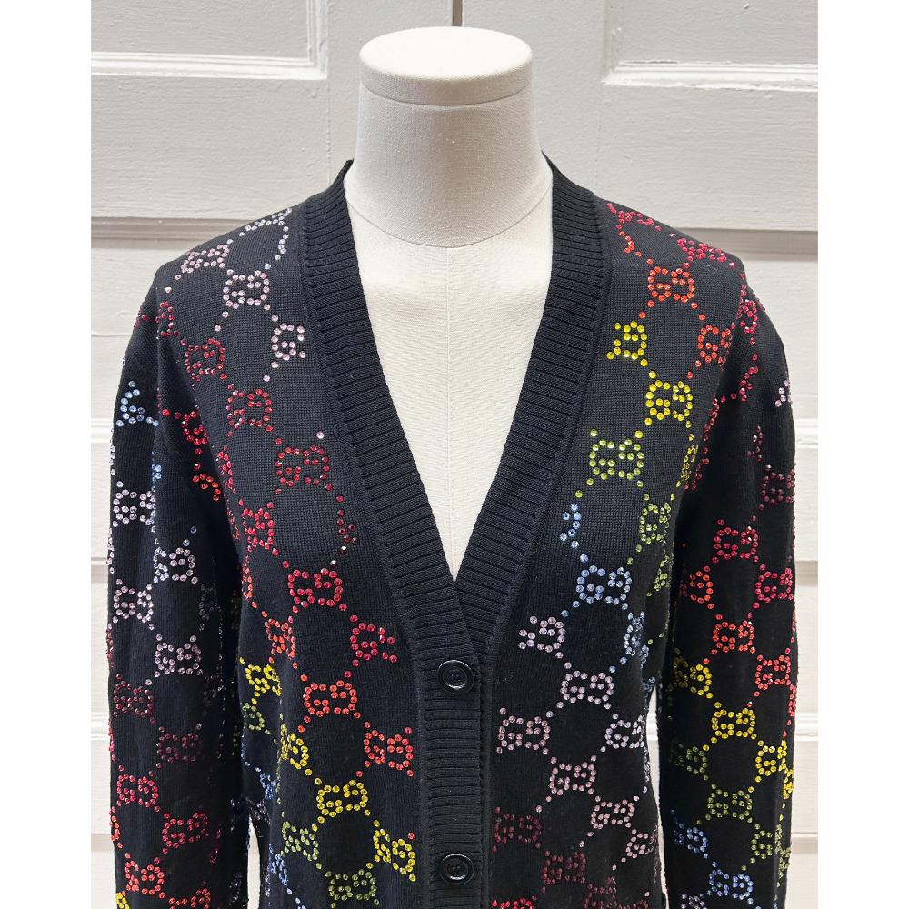 Black wool cardigan covered in a rainbow crystal GG monogram pattern. The cardigan also features two patch pockets, a button down front and V-neckline. Made from 100% wool. Condition: Good. There are a few repaired small holes in the knit. No crystals missing.