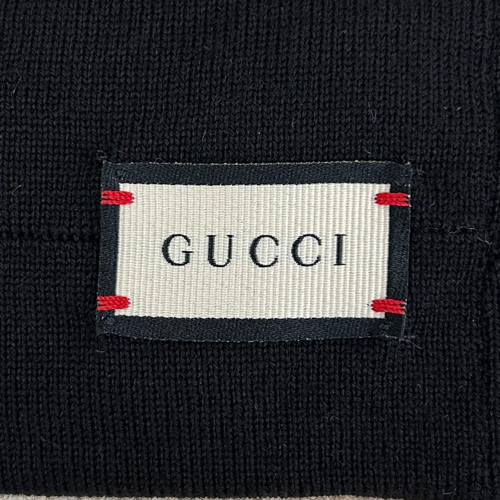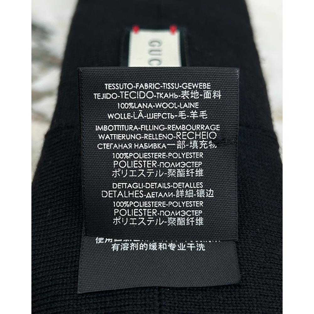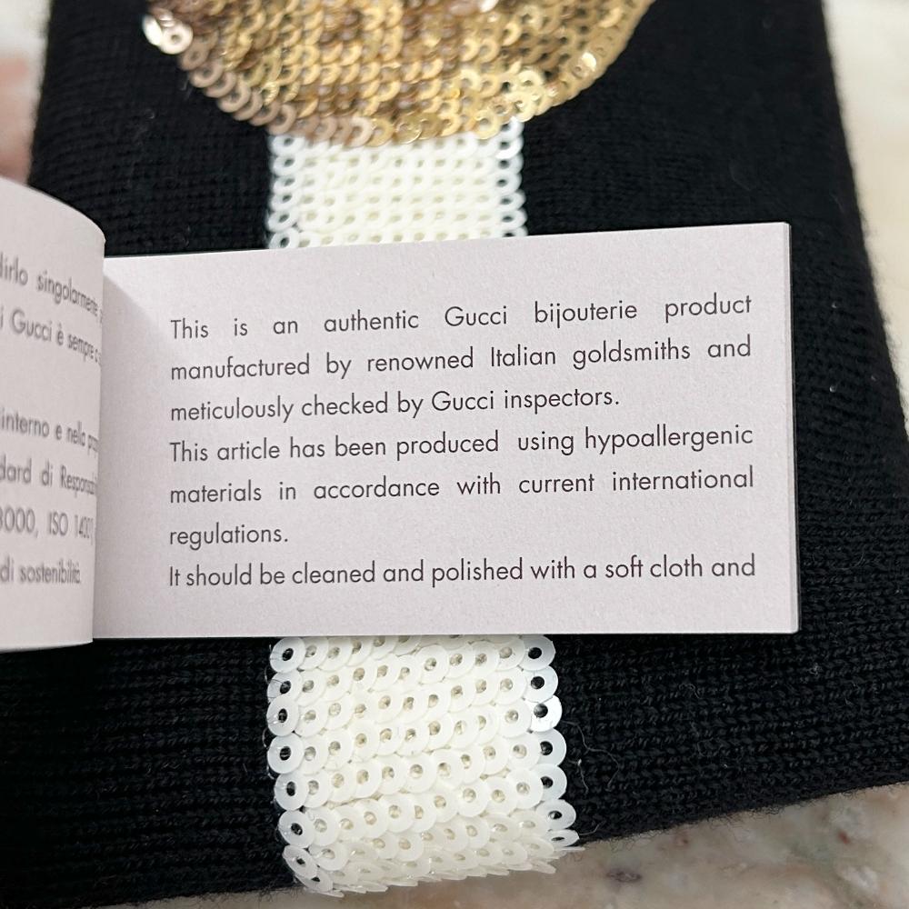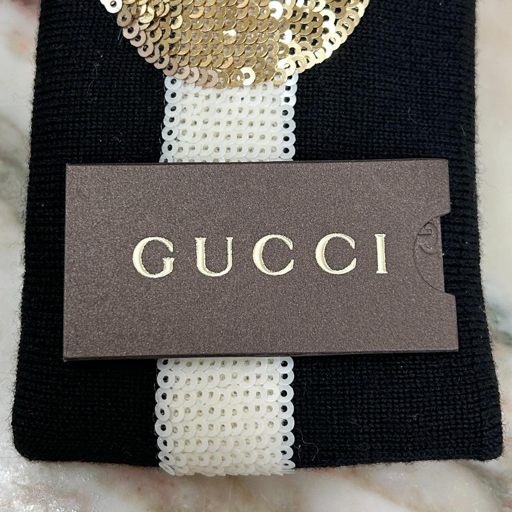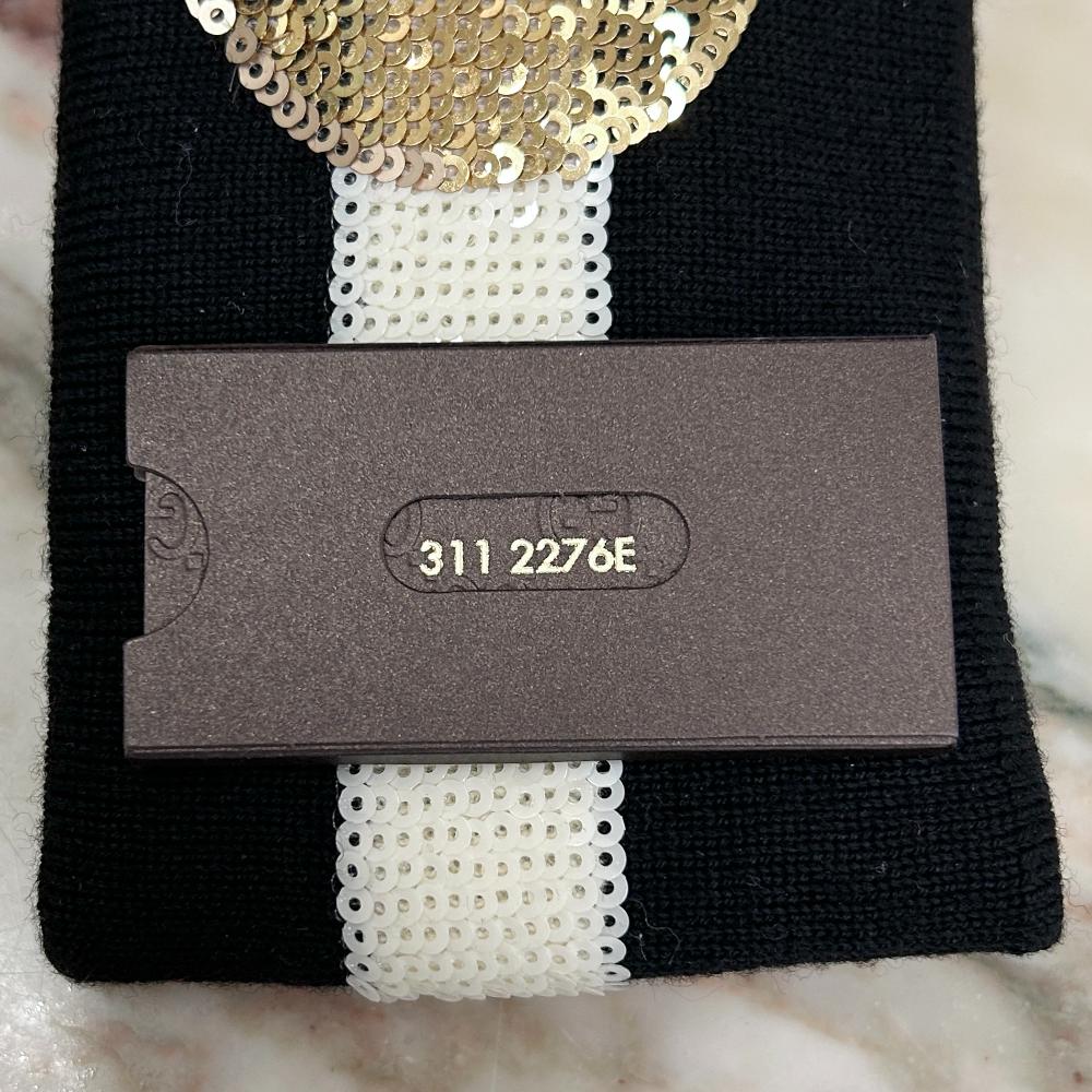 Black wool knit headband with a cream sequin band and gold sequin logo. 3″ wide, and a size M (fits a 20″- 24″ head circumference). Comes with its original box and authentication booklet. Condition: Purrrfect. No flaws.
