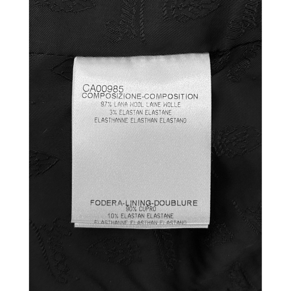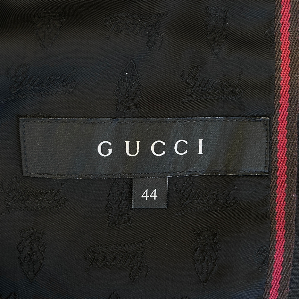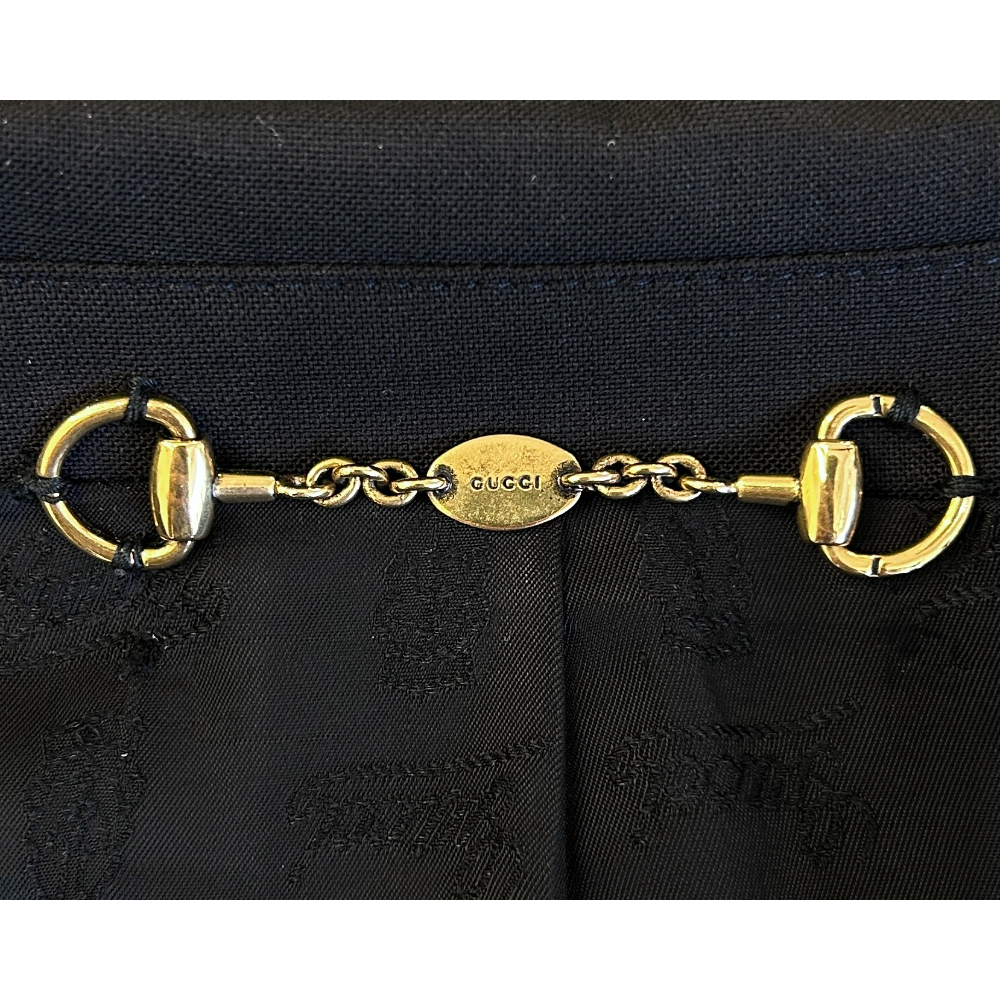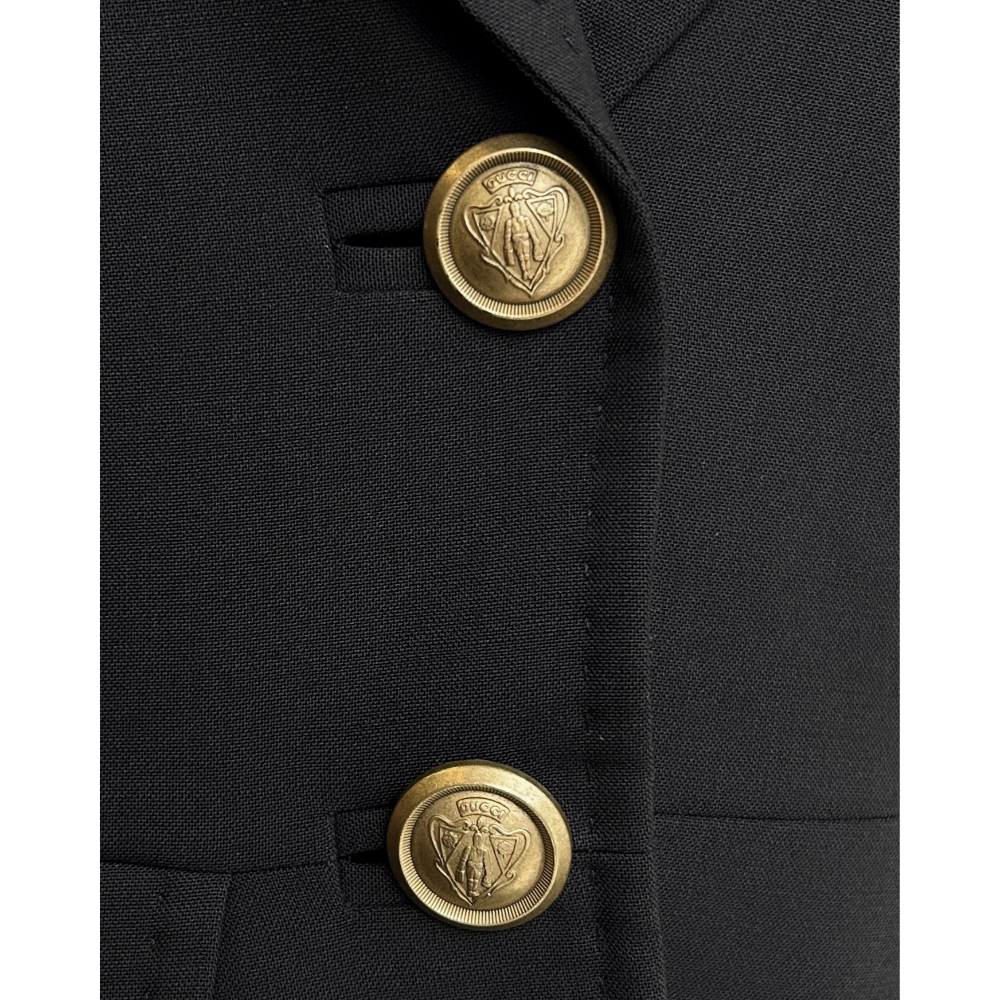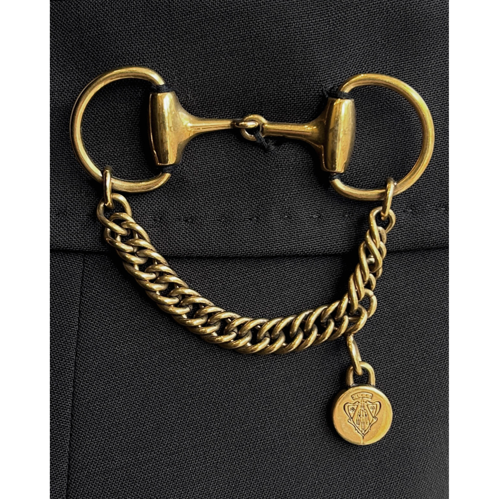 Black wool blazer with antique finish gold buttons, a gold horsebit and chain detail on the right pocket, a back vent, and logo print lining. See label image for material content of the jacket. Condition: Good. A bit of surface wear on each sleeve by the buttons near the hem. One spot of light wear on the lining by the back neck.