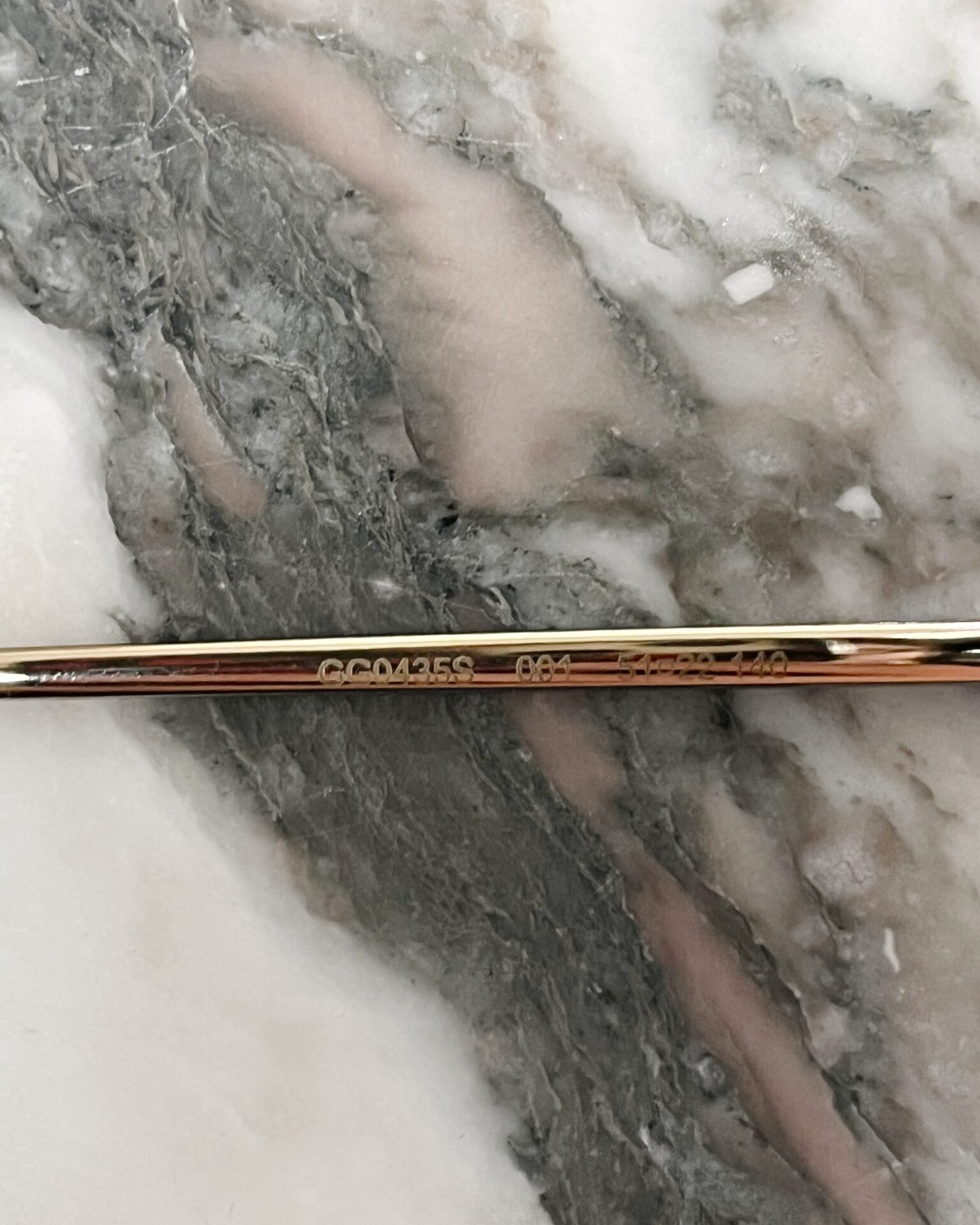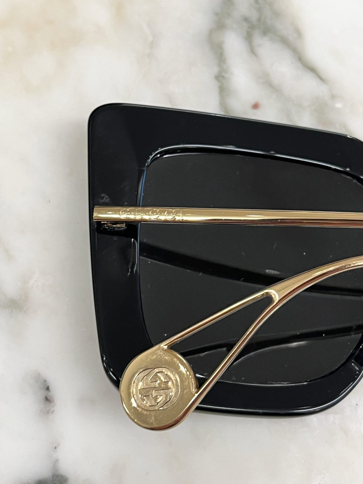 Large framed black Gucci sunglasses with gold coloured metal arms featuring large ‘GG’ logos. Includes case