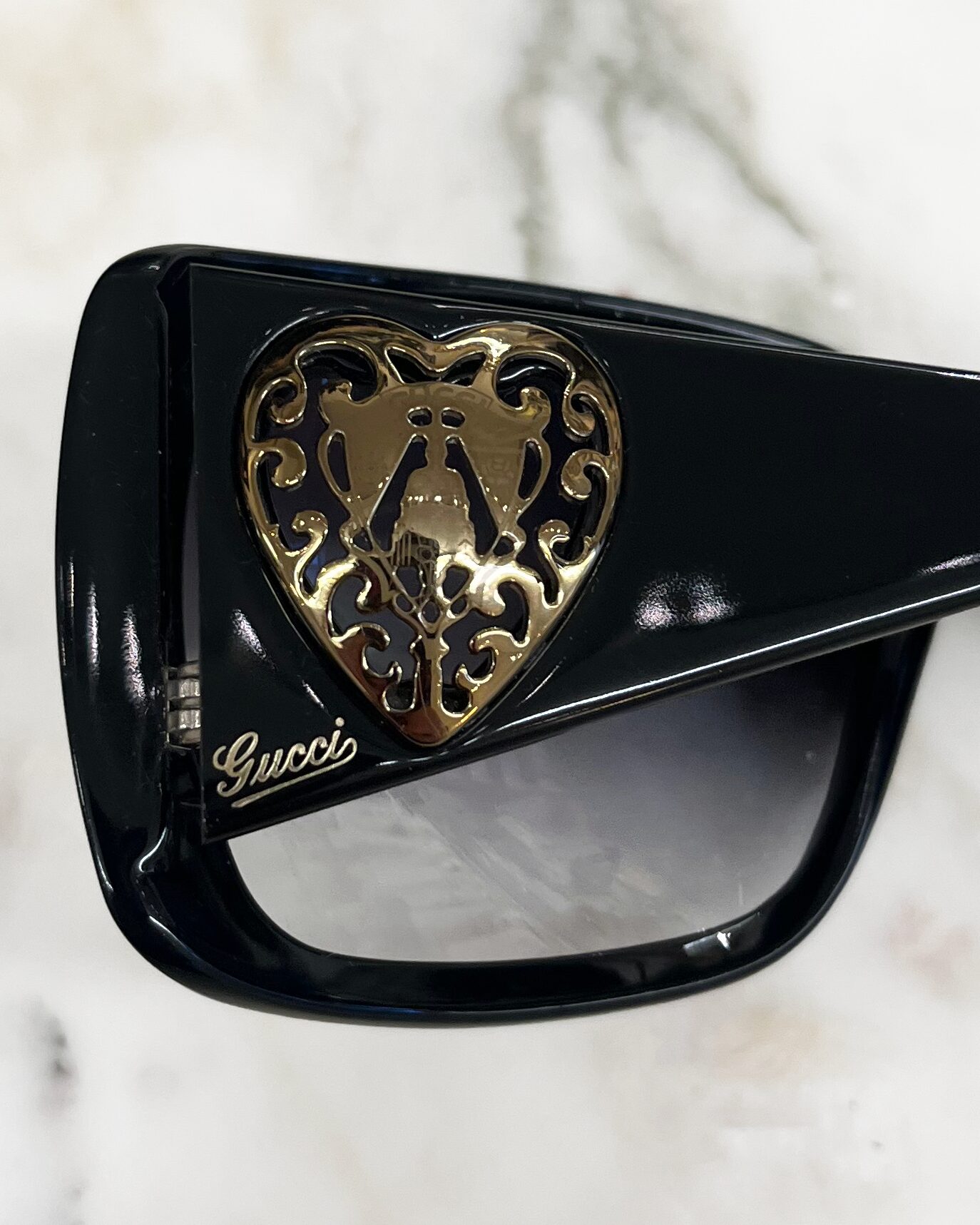 Black sunglasses that feature a metal heart with the Gucci crest on both arms, and a small Gucci spellout on one arm. Includes case.