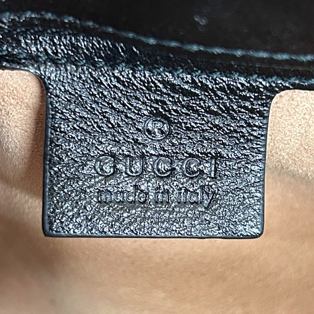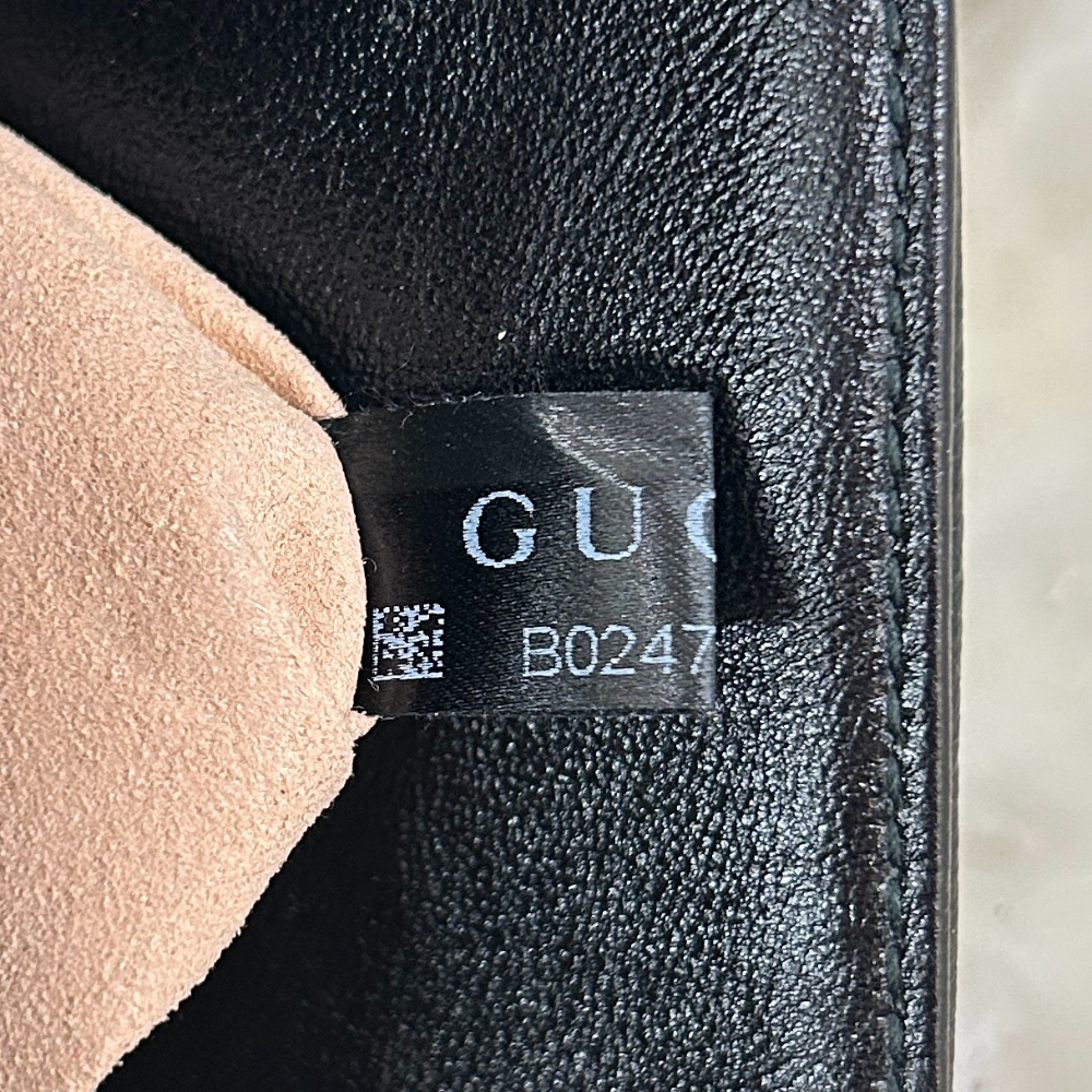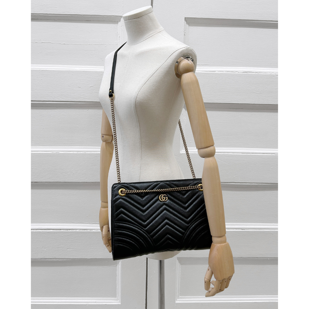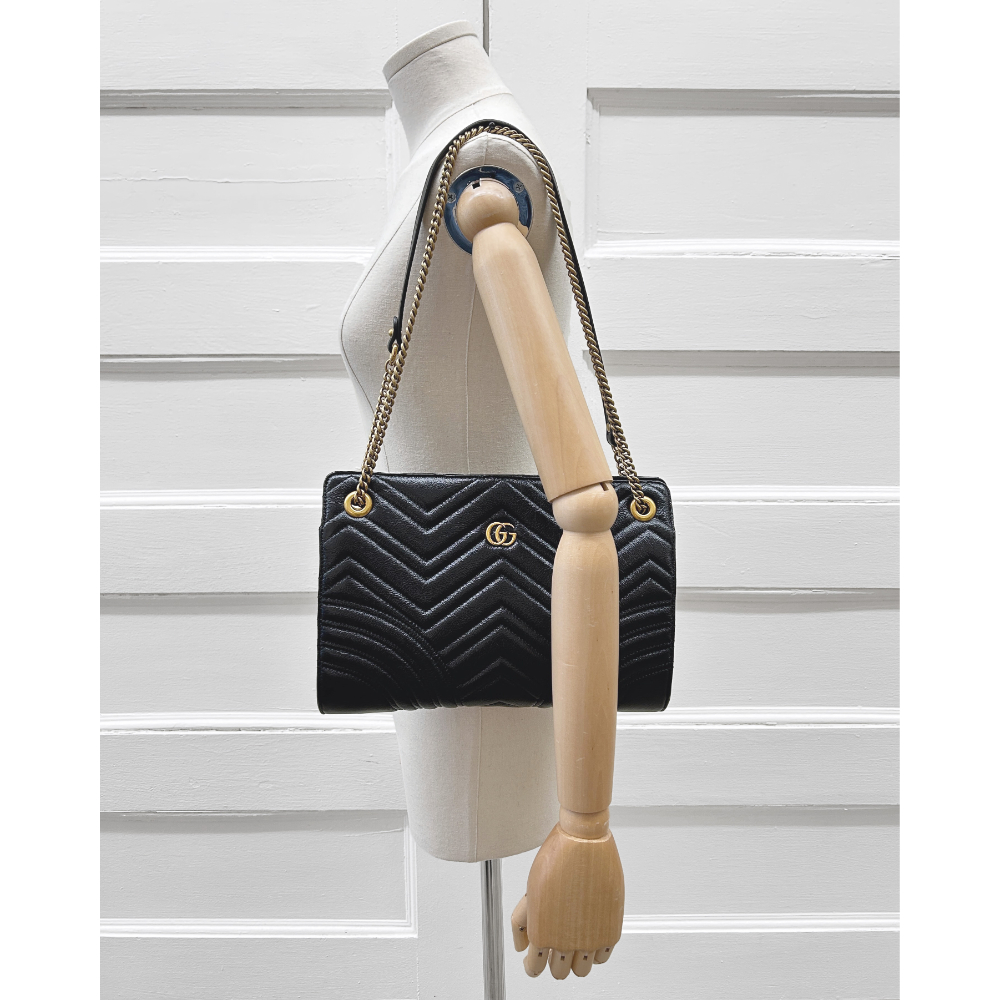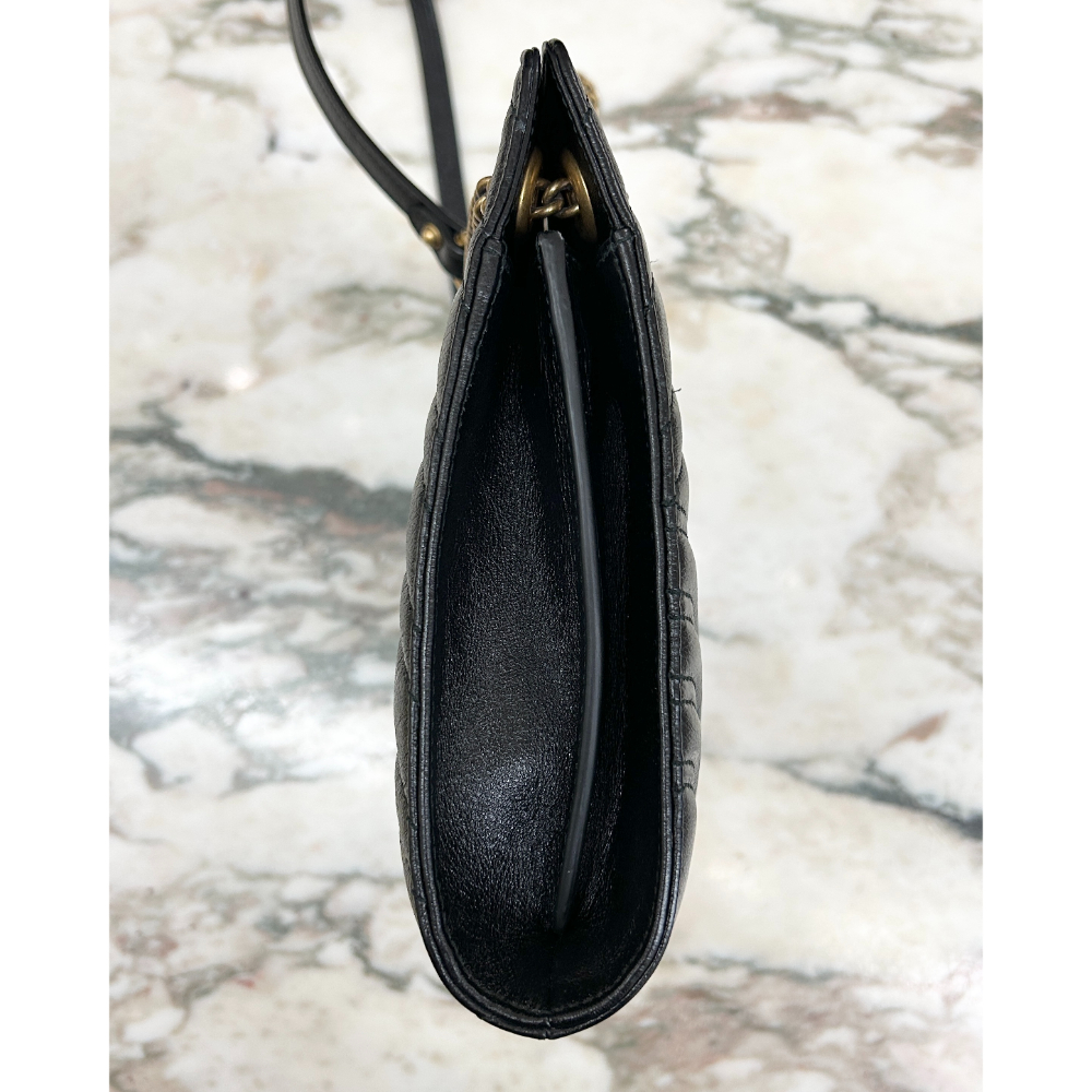 Black quilted leather bag with antique gold hardware and chain/leather straps. The bag opens with a magnetic top closure to a peachy beige suede interior, with two large compartments and two smaller pockets. Dimensions: 11″ x 7.5″ x 3″ (W x H x D). Strap drop (short & long): 9.75″ & 18.5″. Condition: Purrrfect. No flaws.