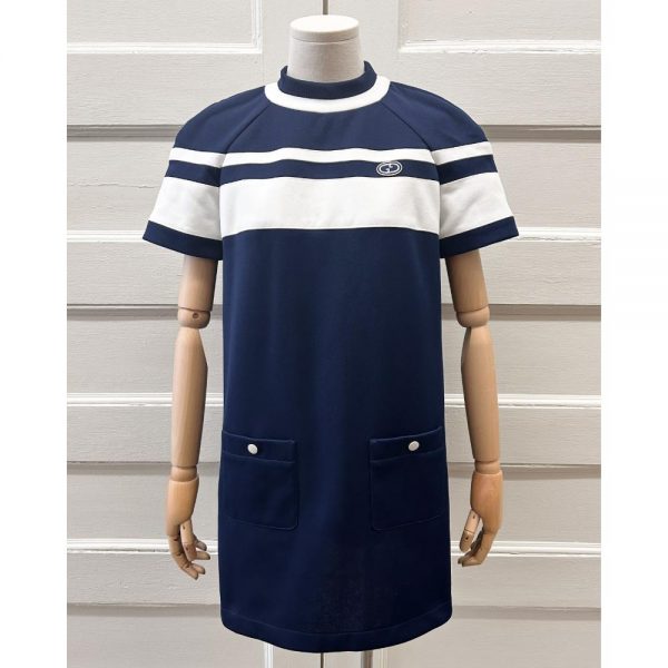 Navy mini dress with white stripes. It features short raglan sleeves, two patch pockets with logo snap buttons, an embroidered logo patch, and a ribbed knit collar. See label image for material content. Condition: Purrrfect. No flaws.