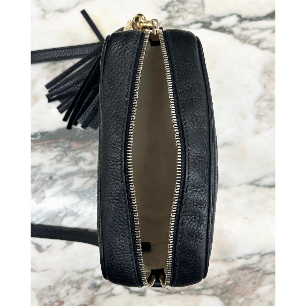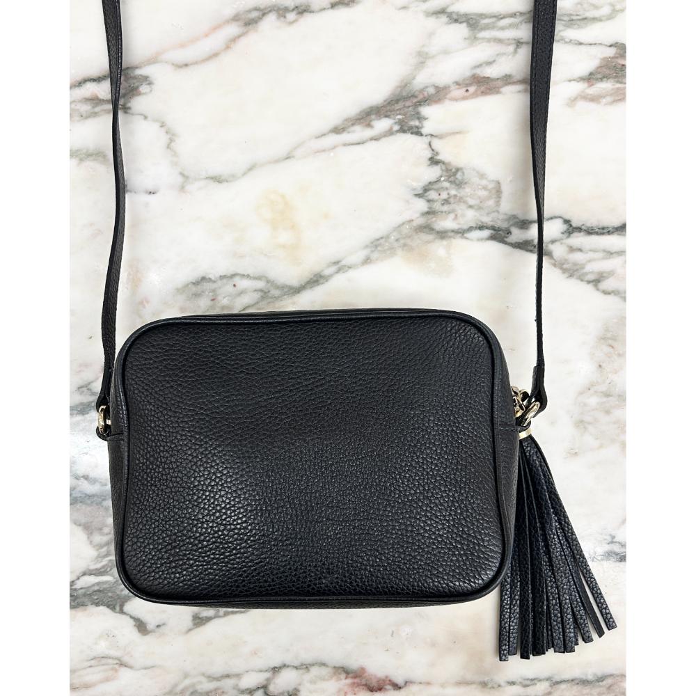 Pebbled leather bag, with a long adjustable leather strap, tassel detail, and large front logo. The bag zippers open to a canvas lined interior with two inner pockets. Comes with a dust bag. Bag dimensions: 8″ x 6″ x 3″ (W x H x D). Strap drop (adjustable): 21″ – 23.5″. Condition: Good. The slightest bit of wear on the bag trim and some light cracking on the strap’s edges. The lining also has some light staining.