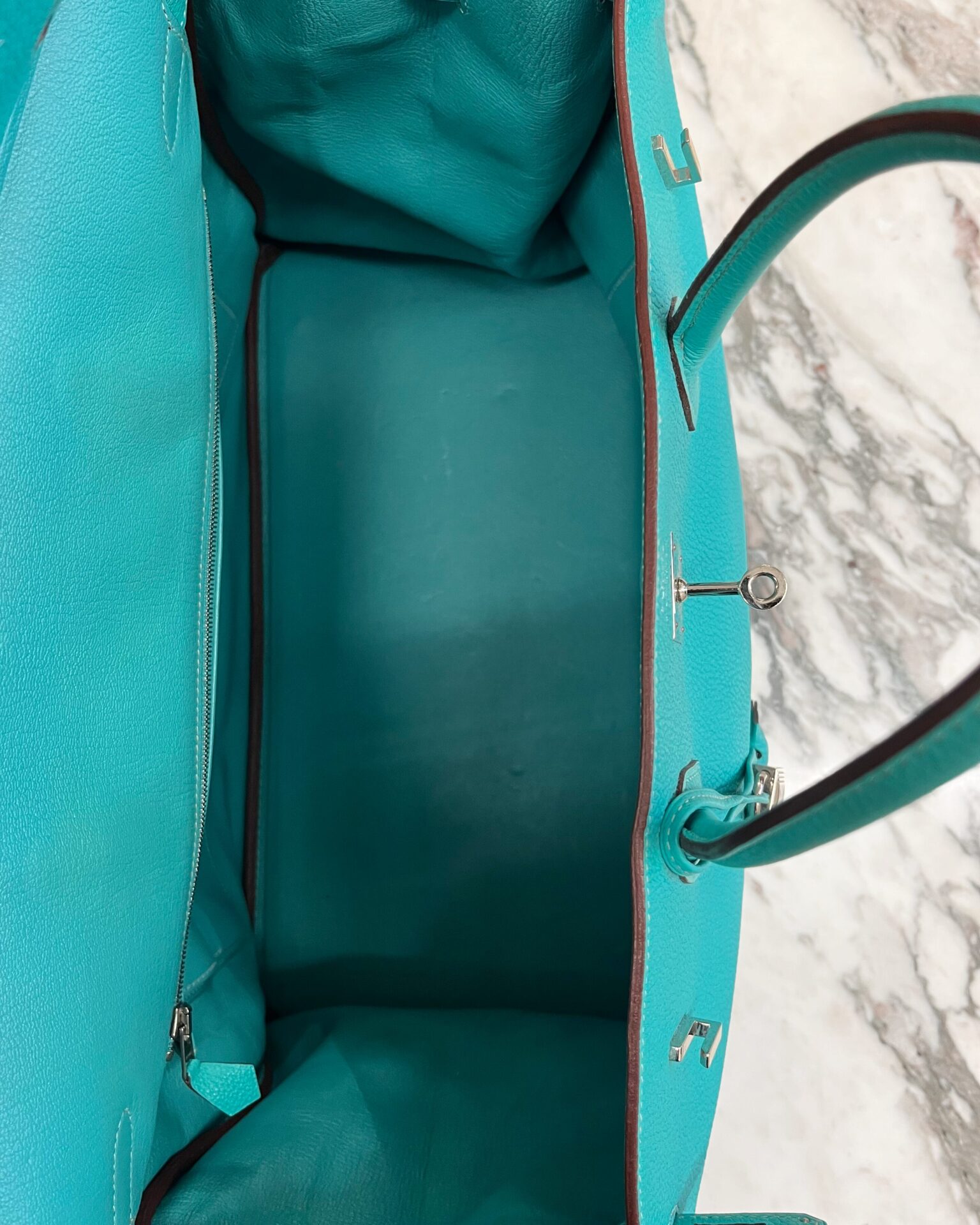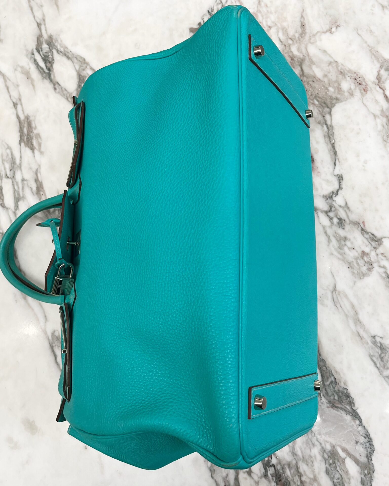 Check out this brilliant hued Hermès 2009 Birkin 40 Lagoon Togo leather with silver hardware. Large inside compartment – bag measures 16″ x 8″ x 12″. Comes with: tirette, keys, padlock, clochette, dustbag