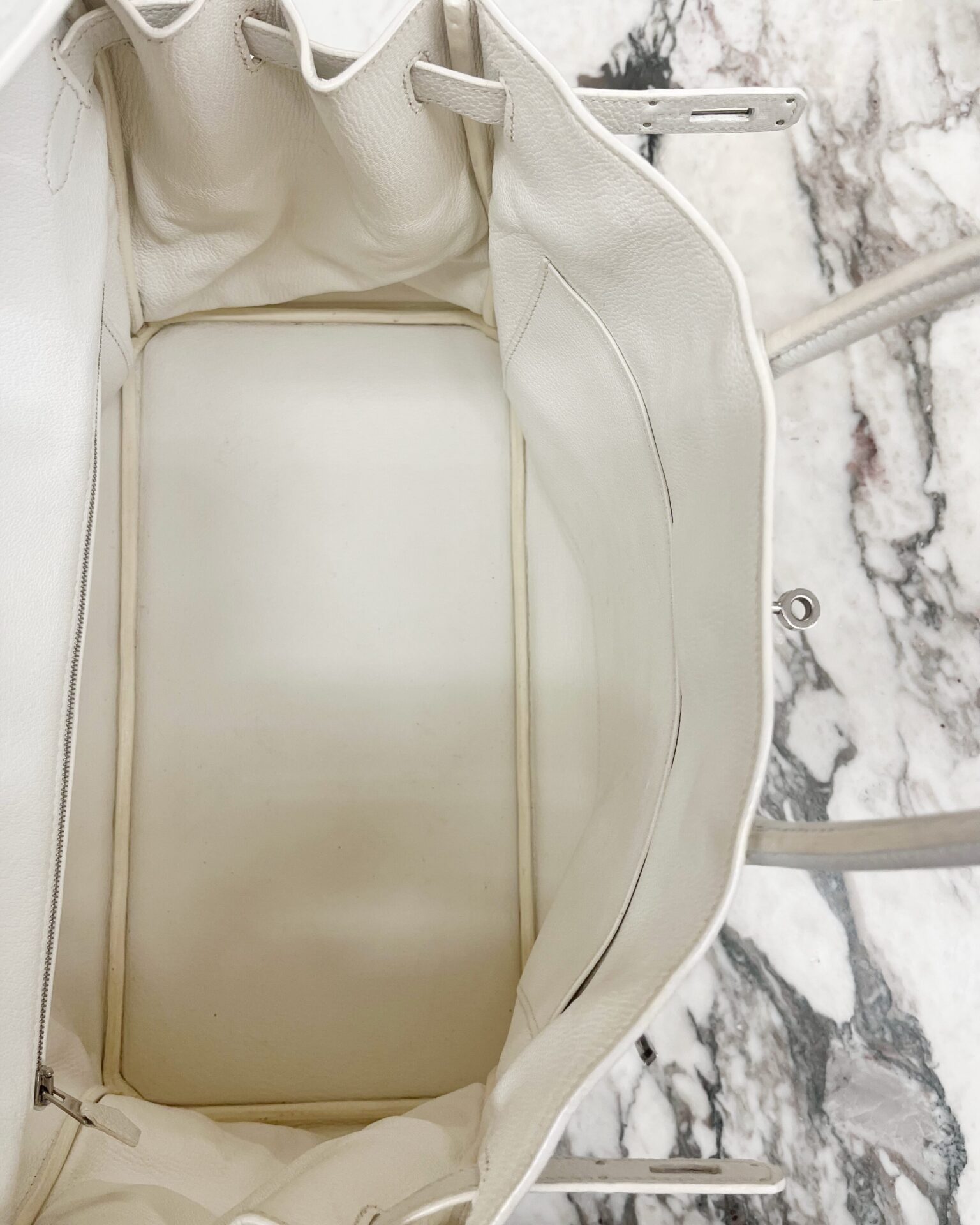 Hermès 2010 Birkin 40 in ivory clemence leather and silver hardware. This bag features two rolled leather handles and a flap top with a turnlock closure. The interior includes one zip pocket and one slip pocket. This bag includes a dustcover, two keys and a lock.