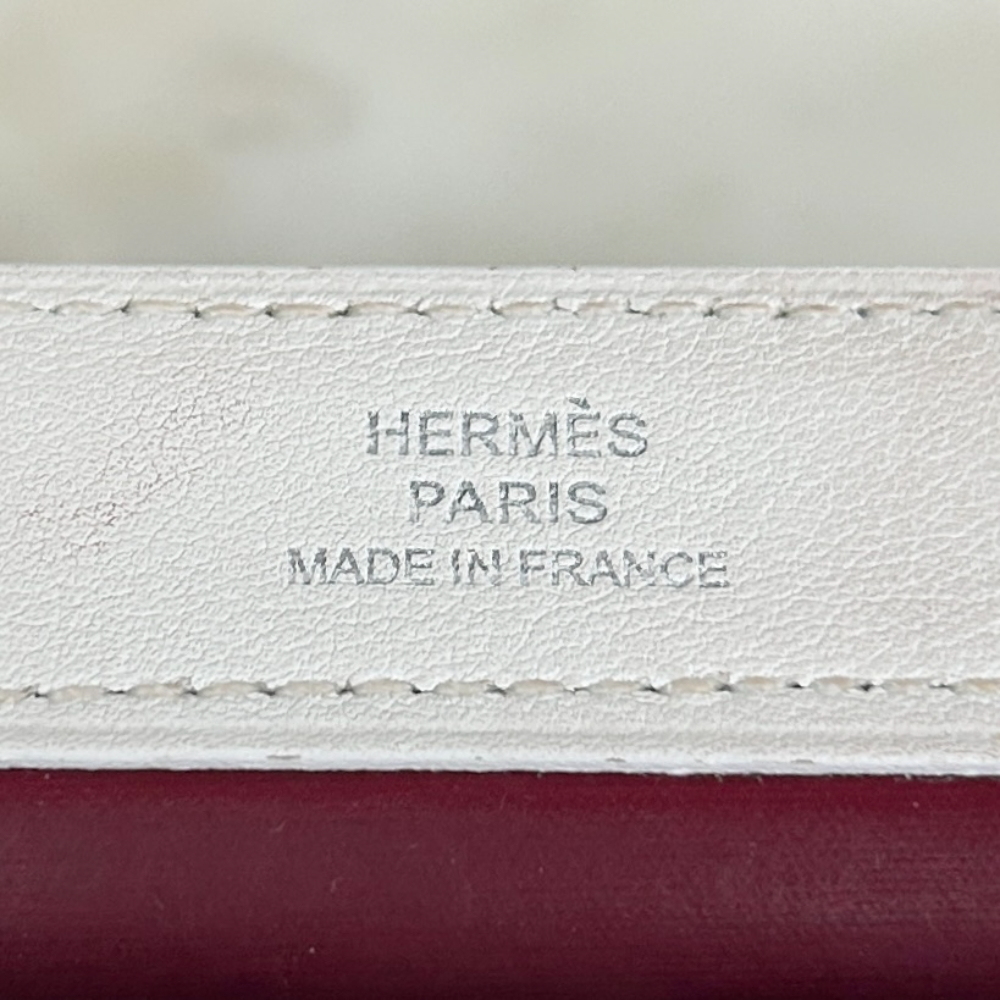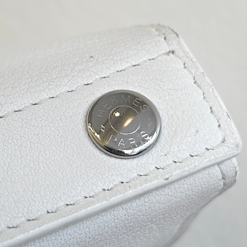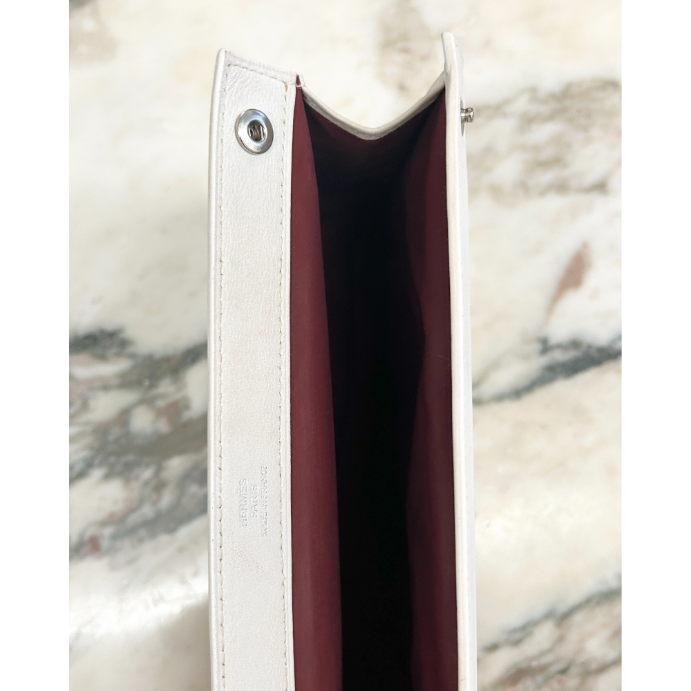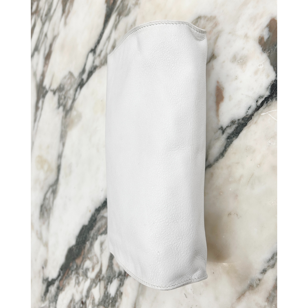 White leather clutch/pouch. Top snaps open the clutch to a burgundy coated canvas lined interior. Dimensions: 7.5″ x 4.5″ x 2″ (W x H x D). Condition: Fairly good. There is some cracking in the side trim around the pouch, and a couple very light marks of discolouration on the outer leather.