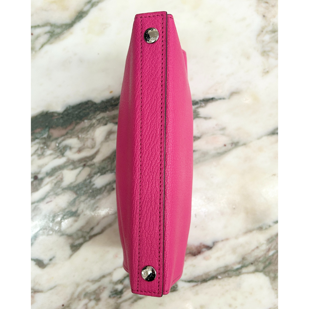 Pink pebbled leather pouch/clutch. The pouch snaps open to a burgundy coated canvas interior. Dimensions: 7.5″ x 4.5″ x 2″ (W x H x D). Condition: Near purrrfect. Slight bit of creasing in the leather on the bottom of the pouch.