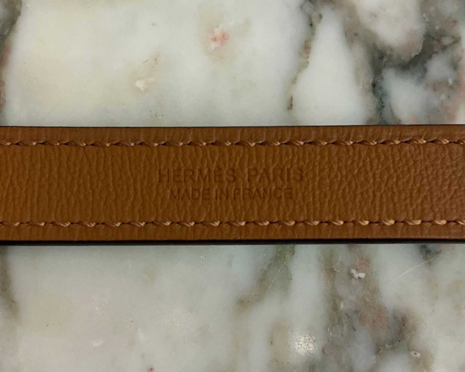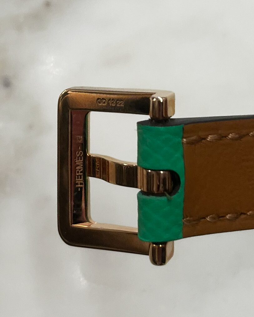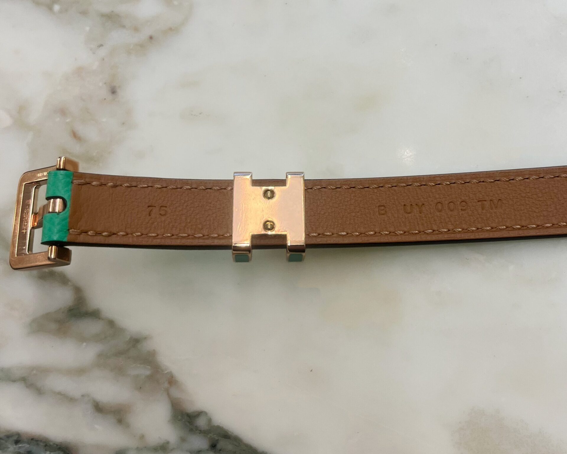 Hermes 2023 Pop H 15 belt in vert Epsom leather. Features 3 belt holes, gold/green metal hardware, and branding embossments on inside of the belt.
