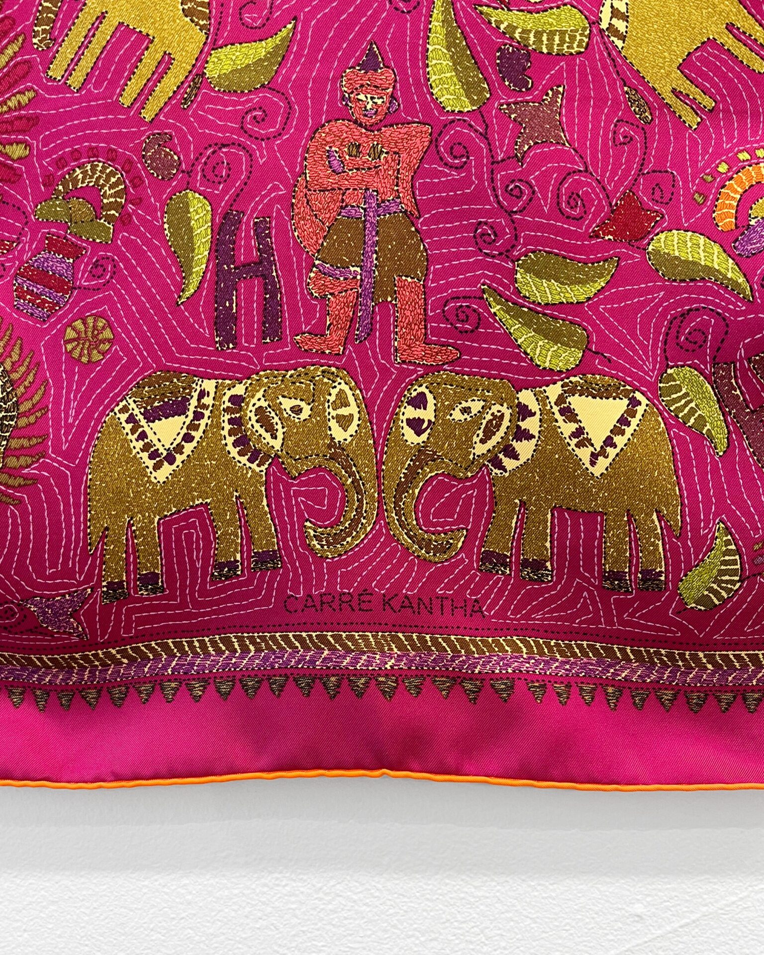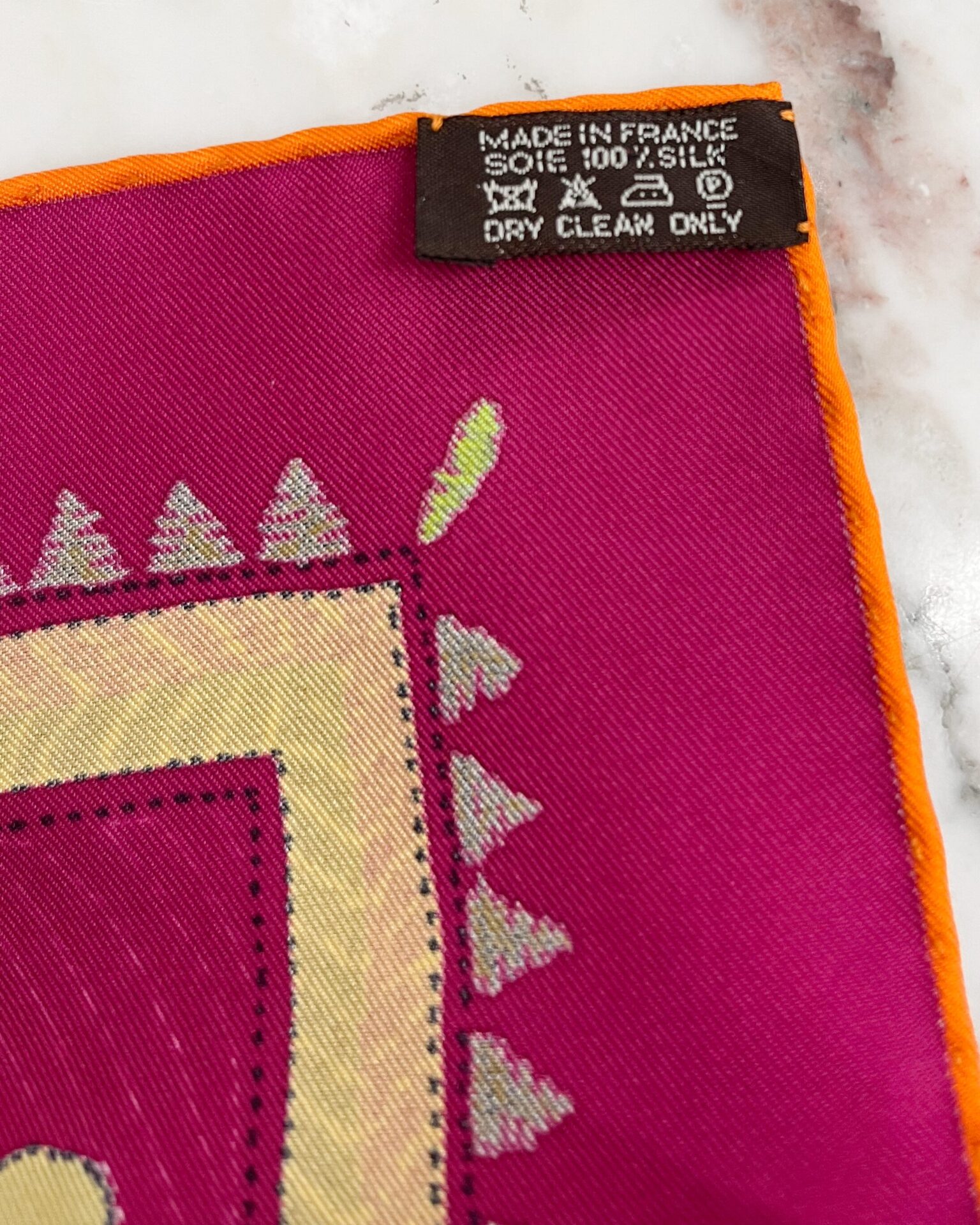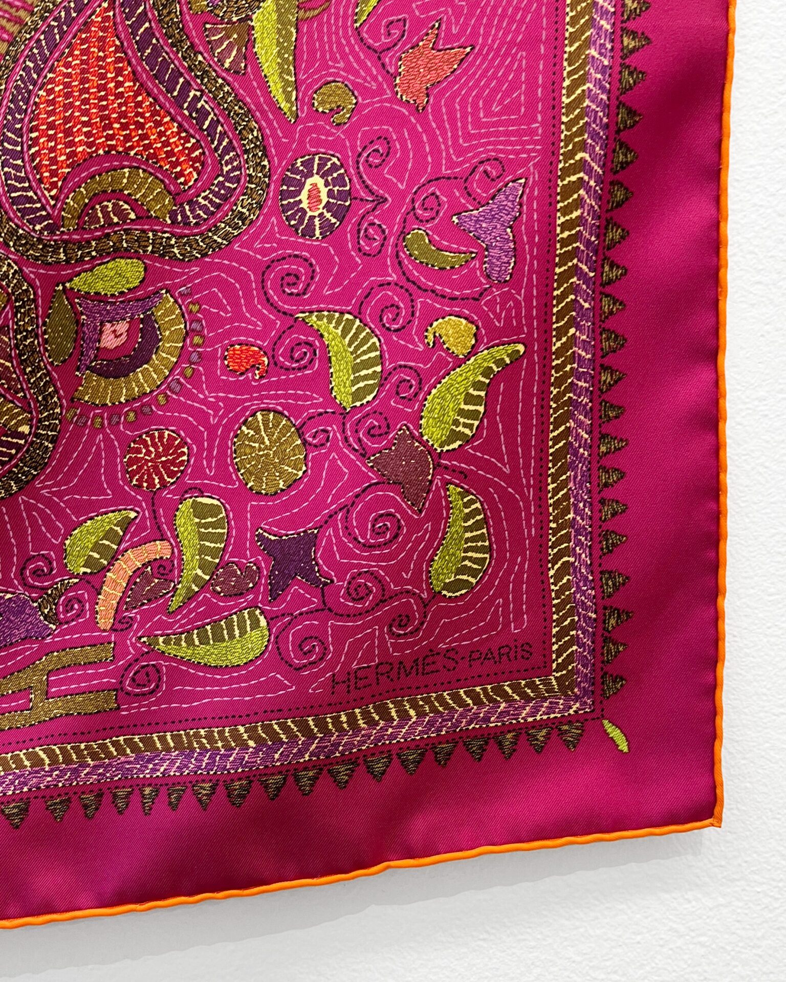 Classic 100% silk magenta Hermes scarf with embroidery style print of florals & animals. Includes box.