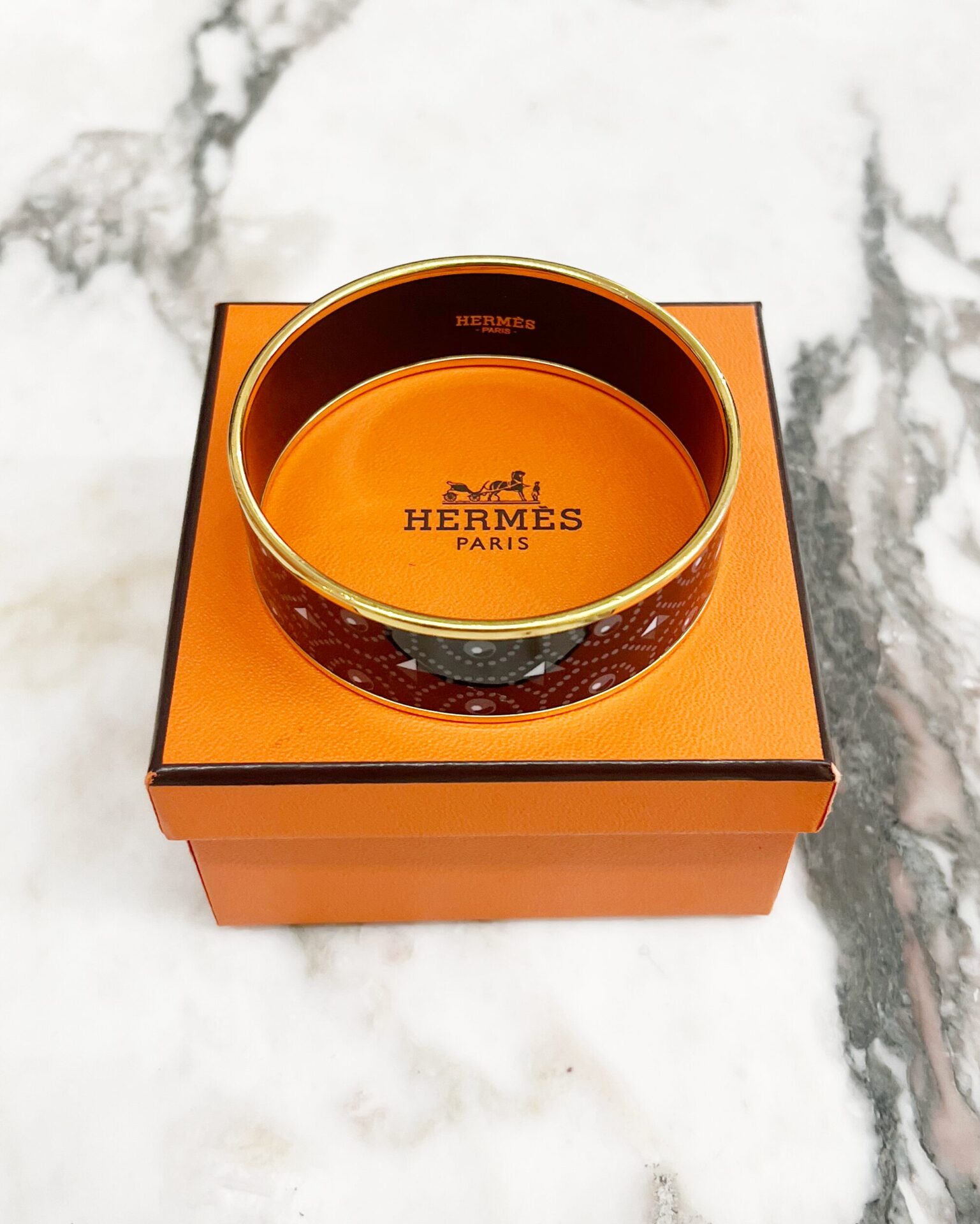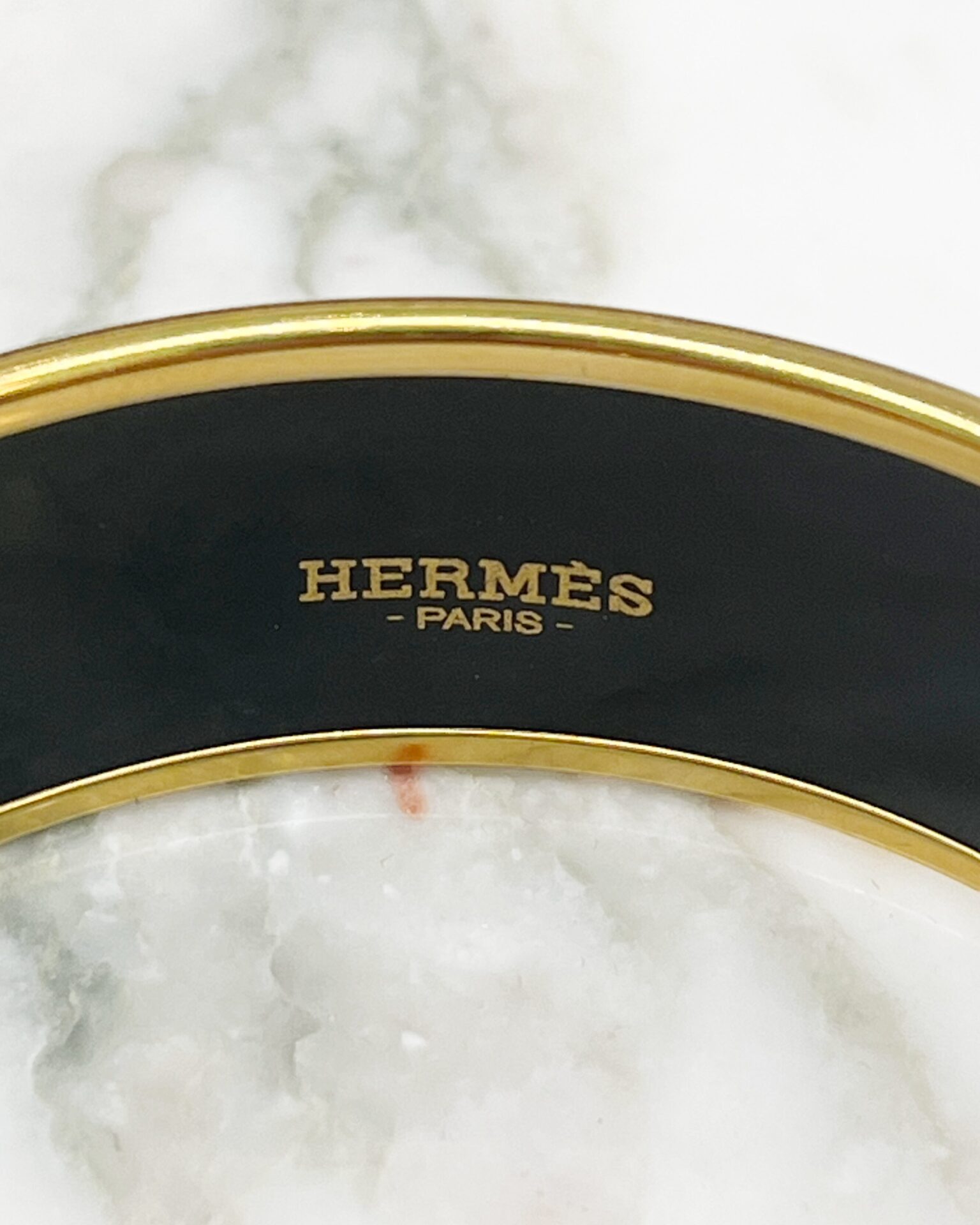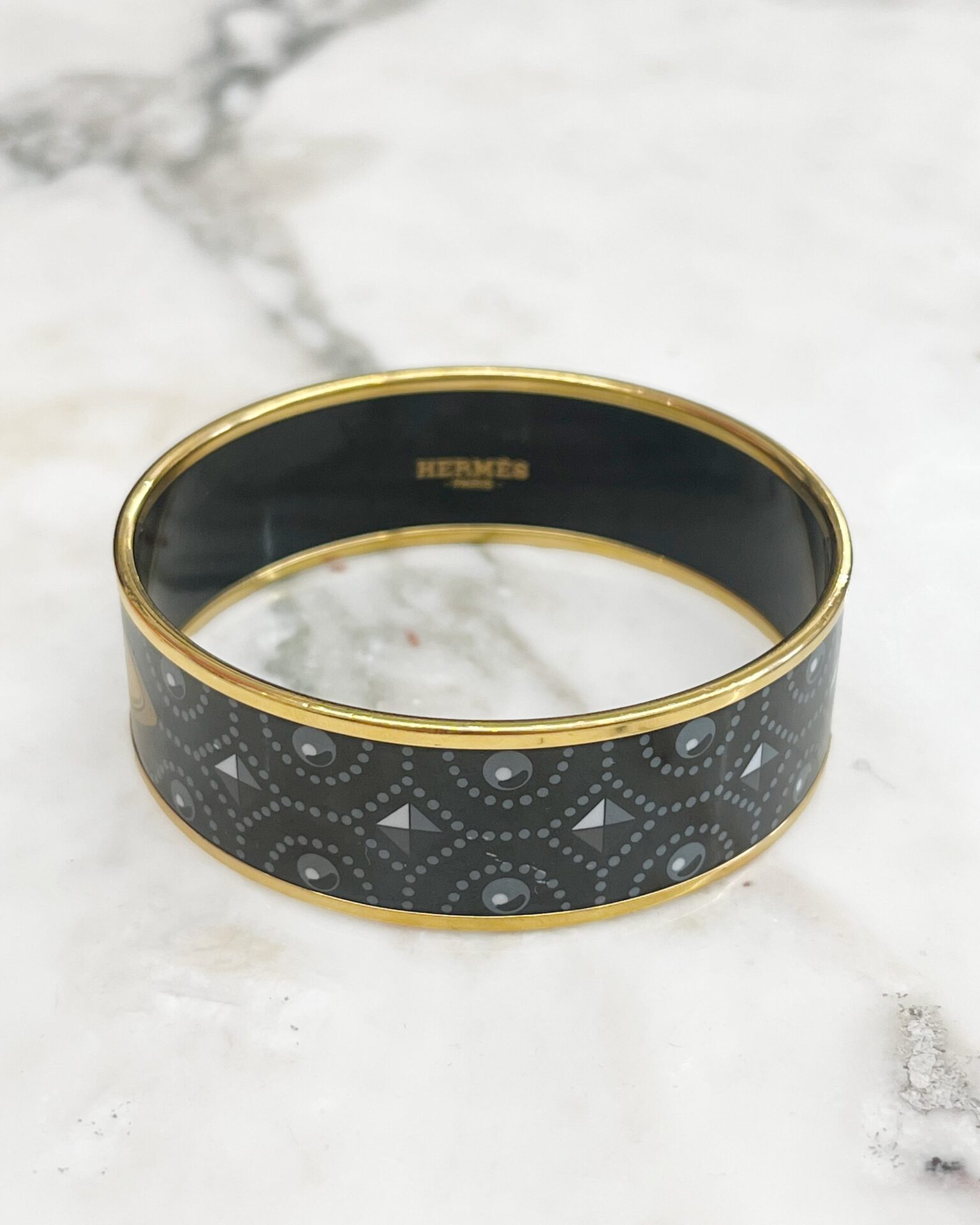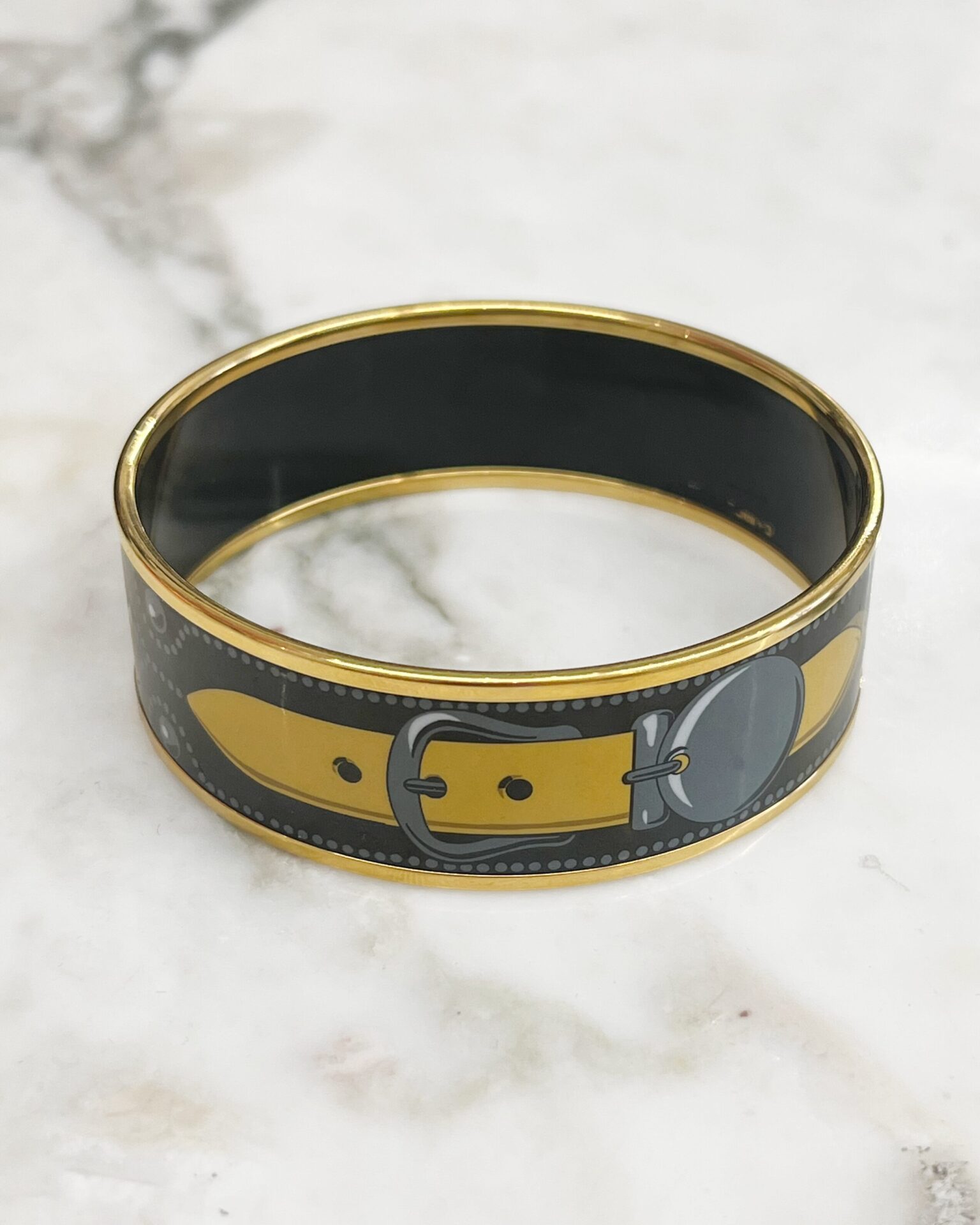 Classic Hermes gold plated black enamel bangle with buckle & geometric print. Does not include box.