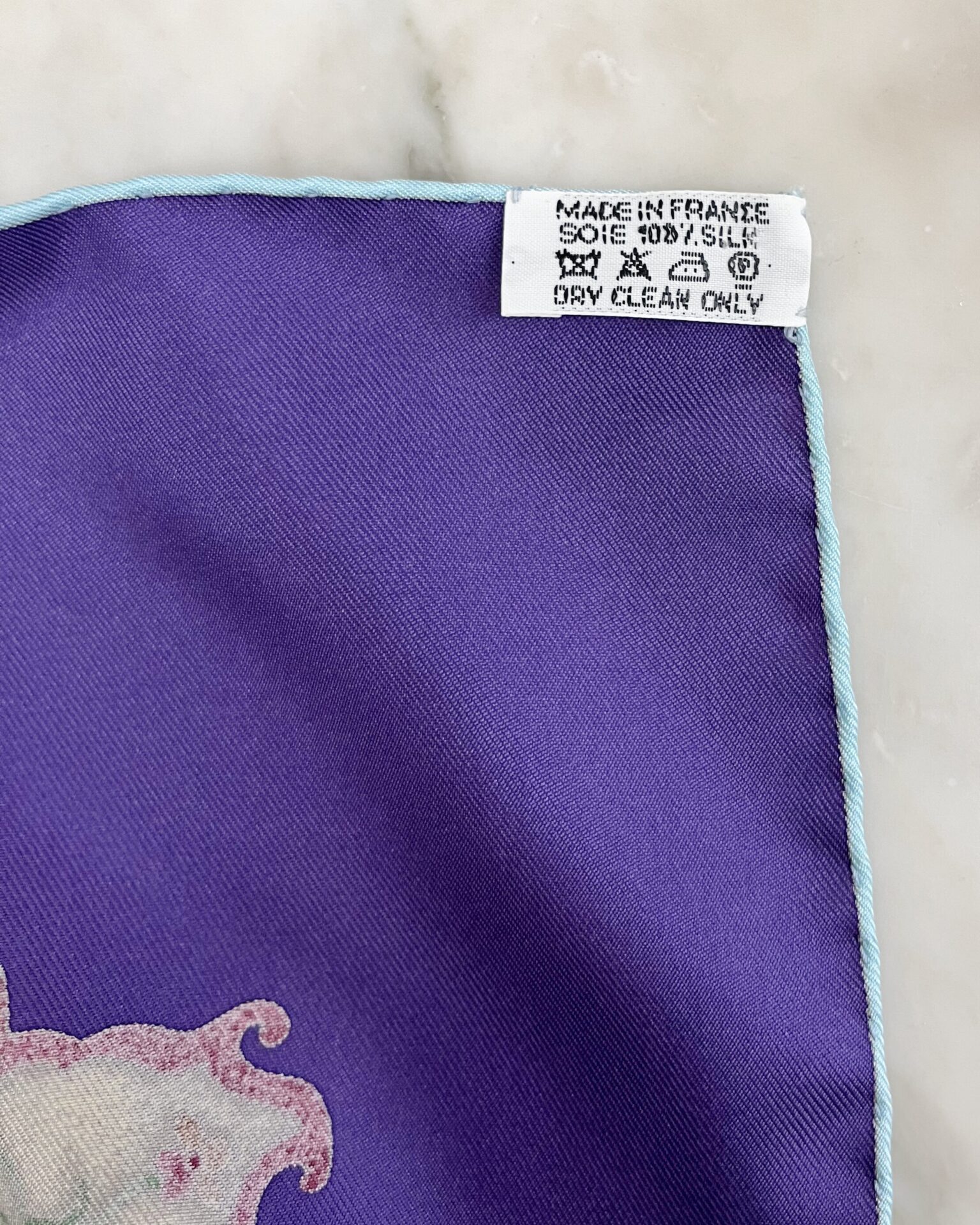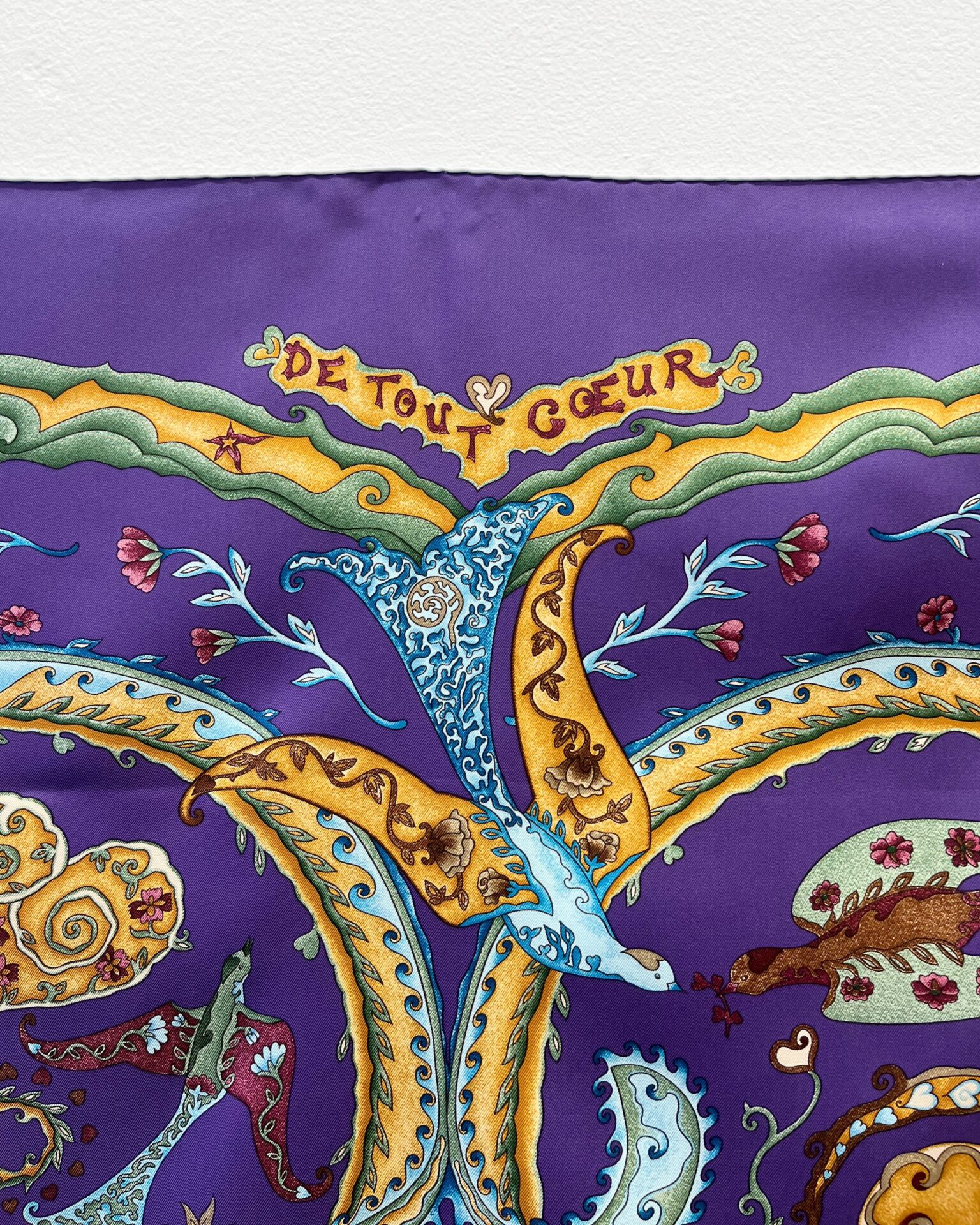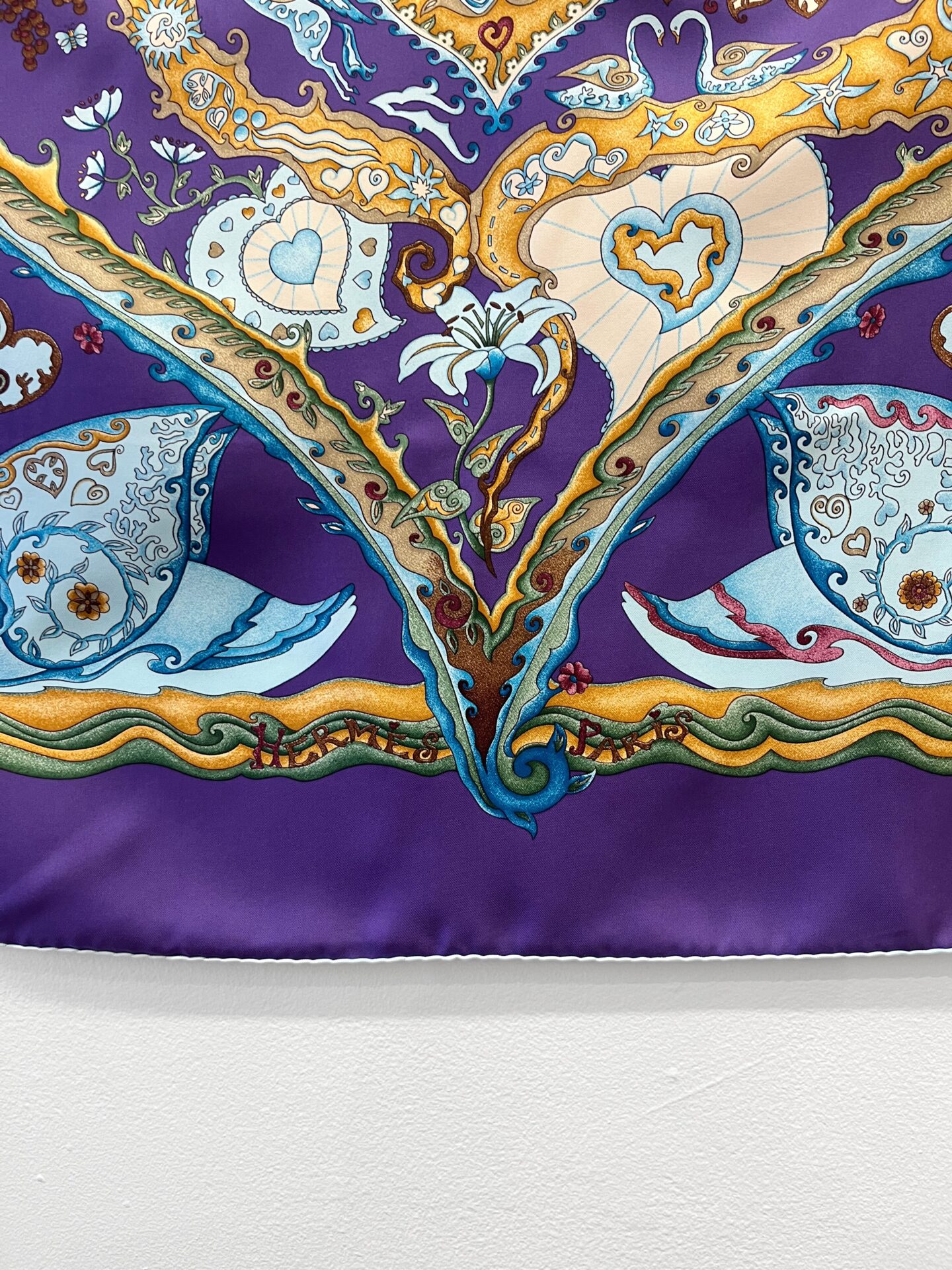 Classic 100% silk purple Hermes scarf with swan & heart print. Includes box.