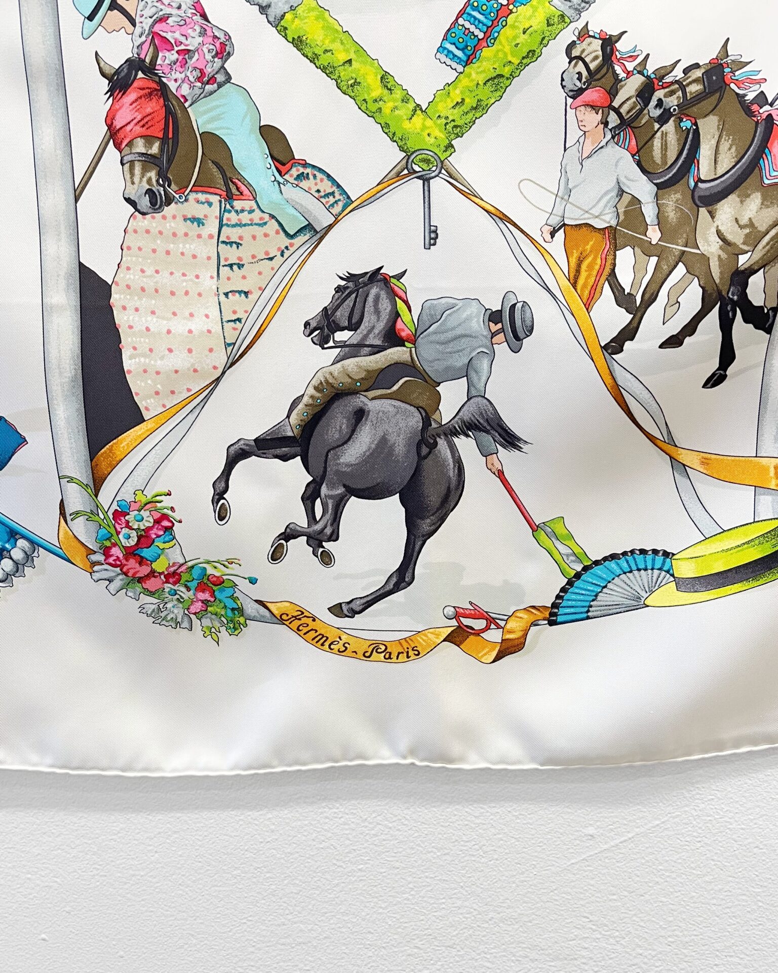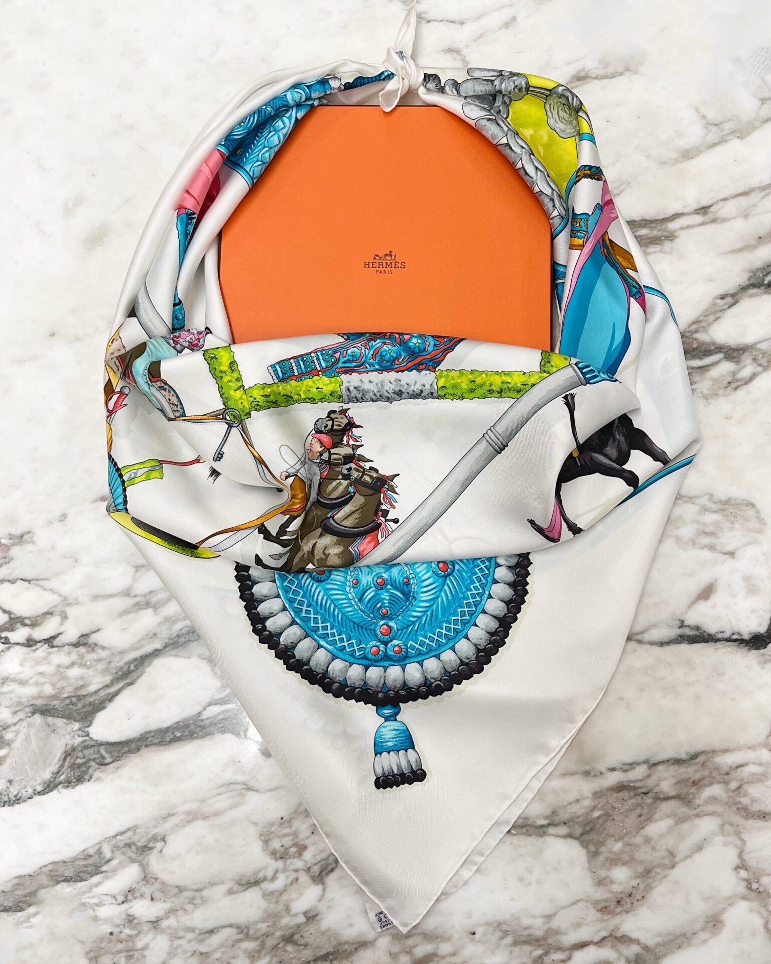 Classic 100% silk white Hermes scarf with Spanish matador bullfighter & horse rider print. Includes box.