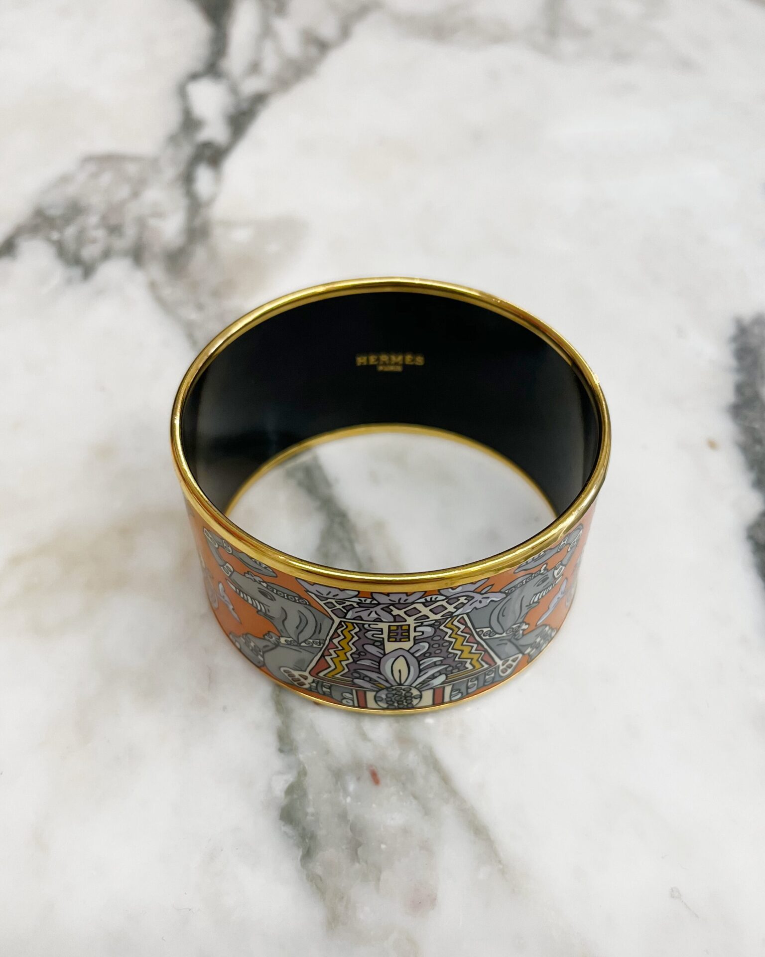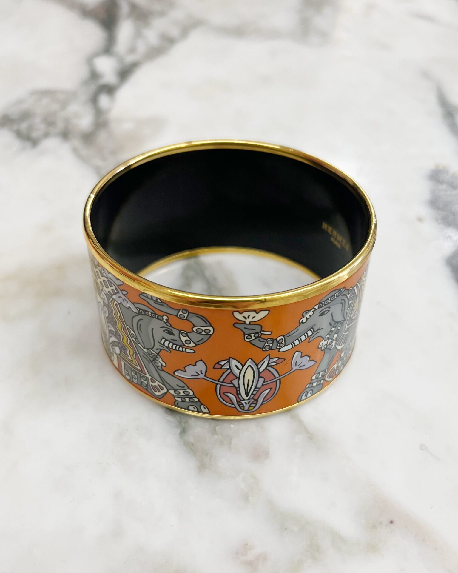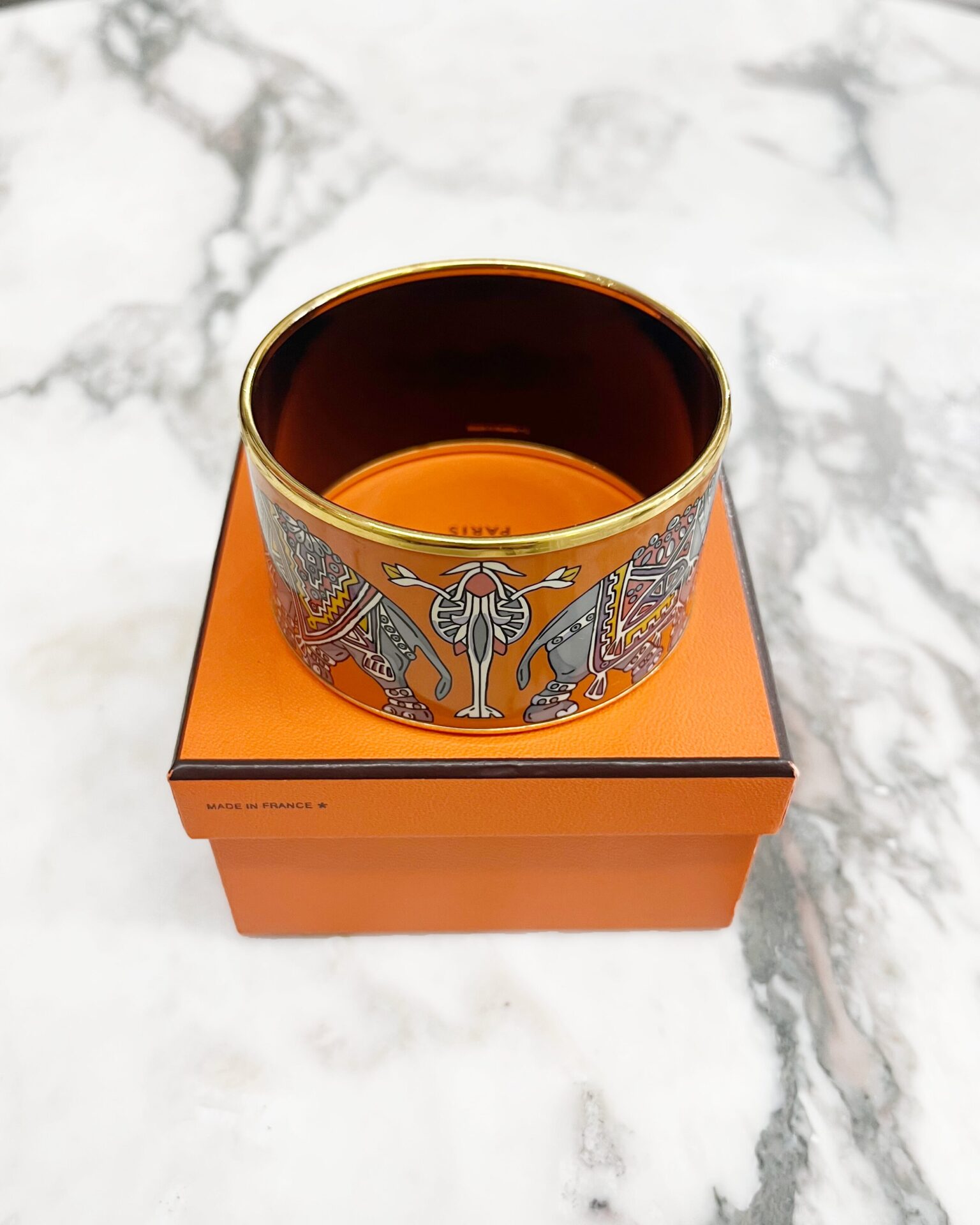 Classic Hermes gold plated orange enamel bangle with gorgeous elephant print, includes box & dustbag.