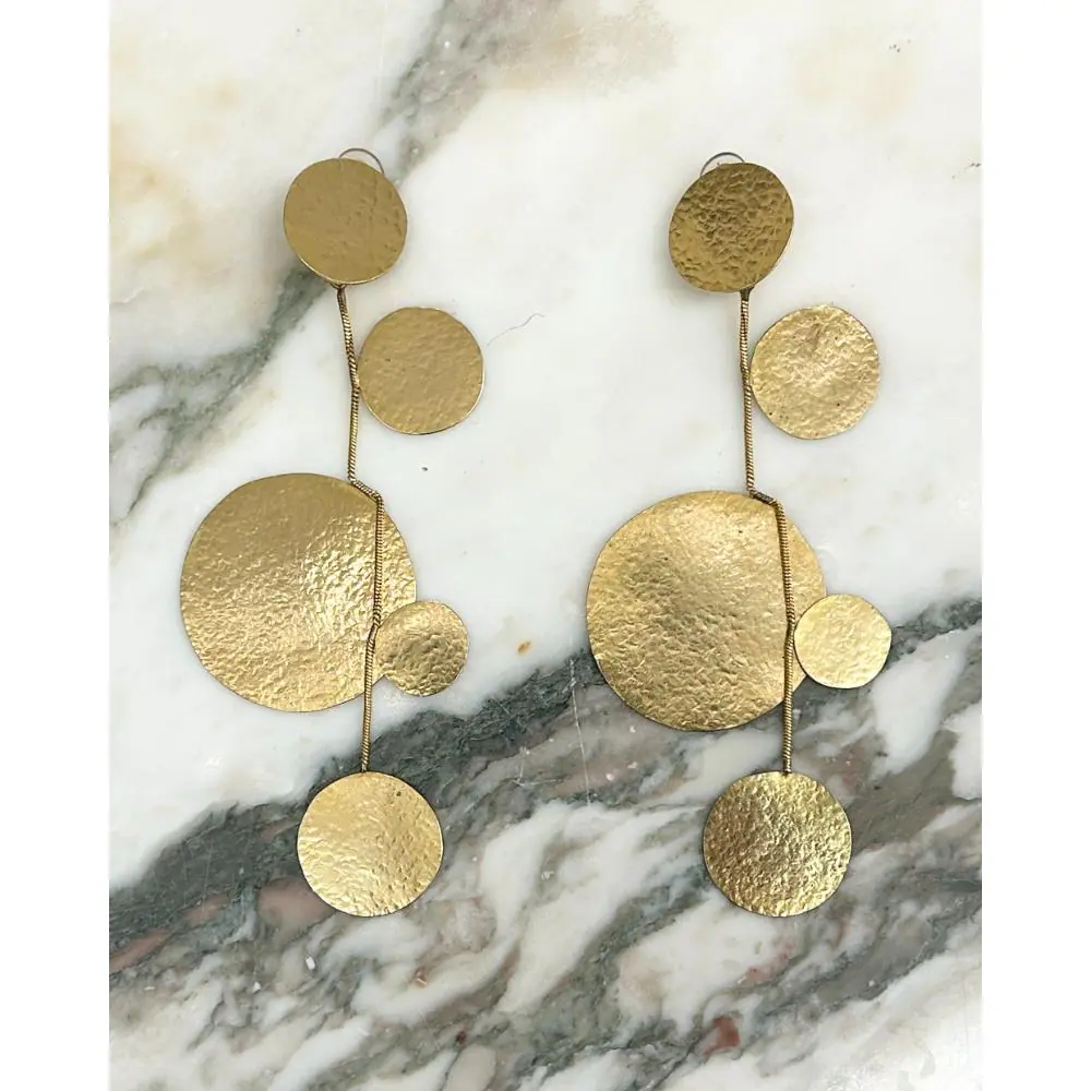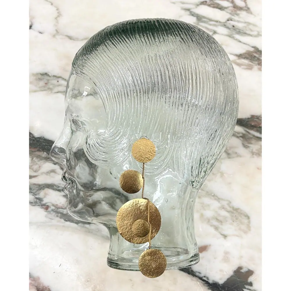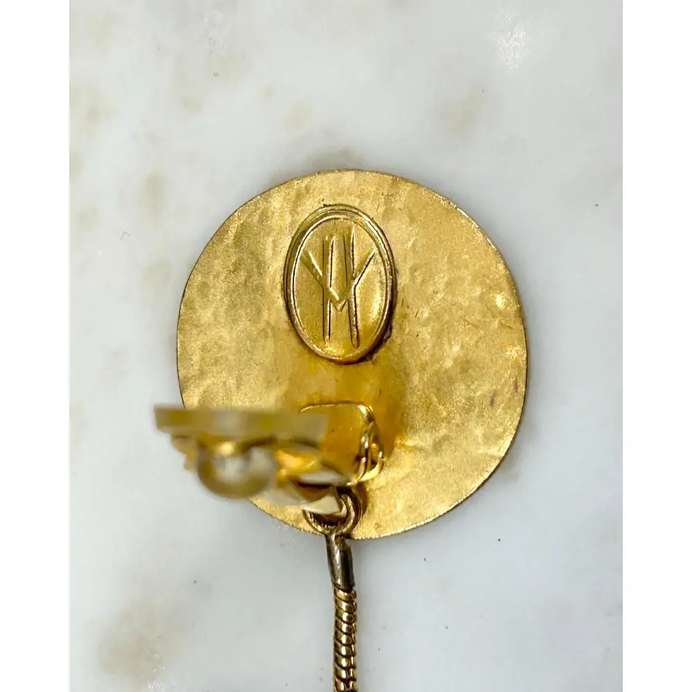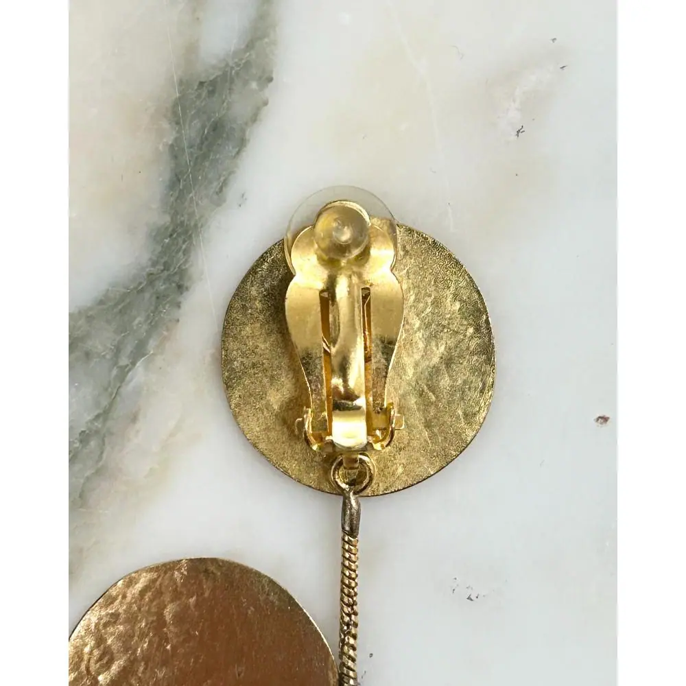 Gold plated drop earrings featuring disks strung on a chain. Light weight and have clip on backings. 5.5″ in length. Condition: Good. The disks have some small spots of oxidization.