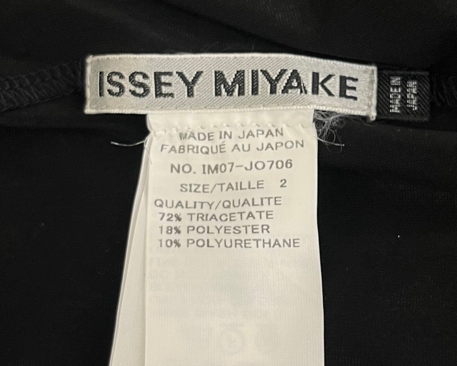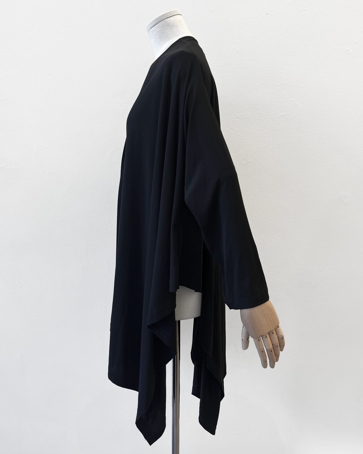 Black wide-cut Issey Miyake 2020 cardigan that gives a wavy appearance when arms are at sides. Features deep V-neck, single button closure and hem that comes up at hips.