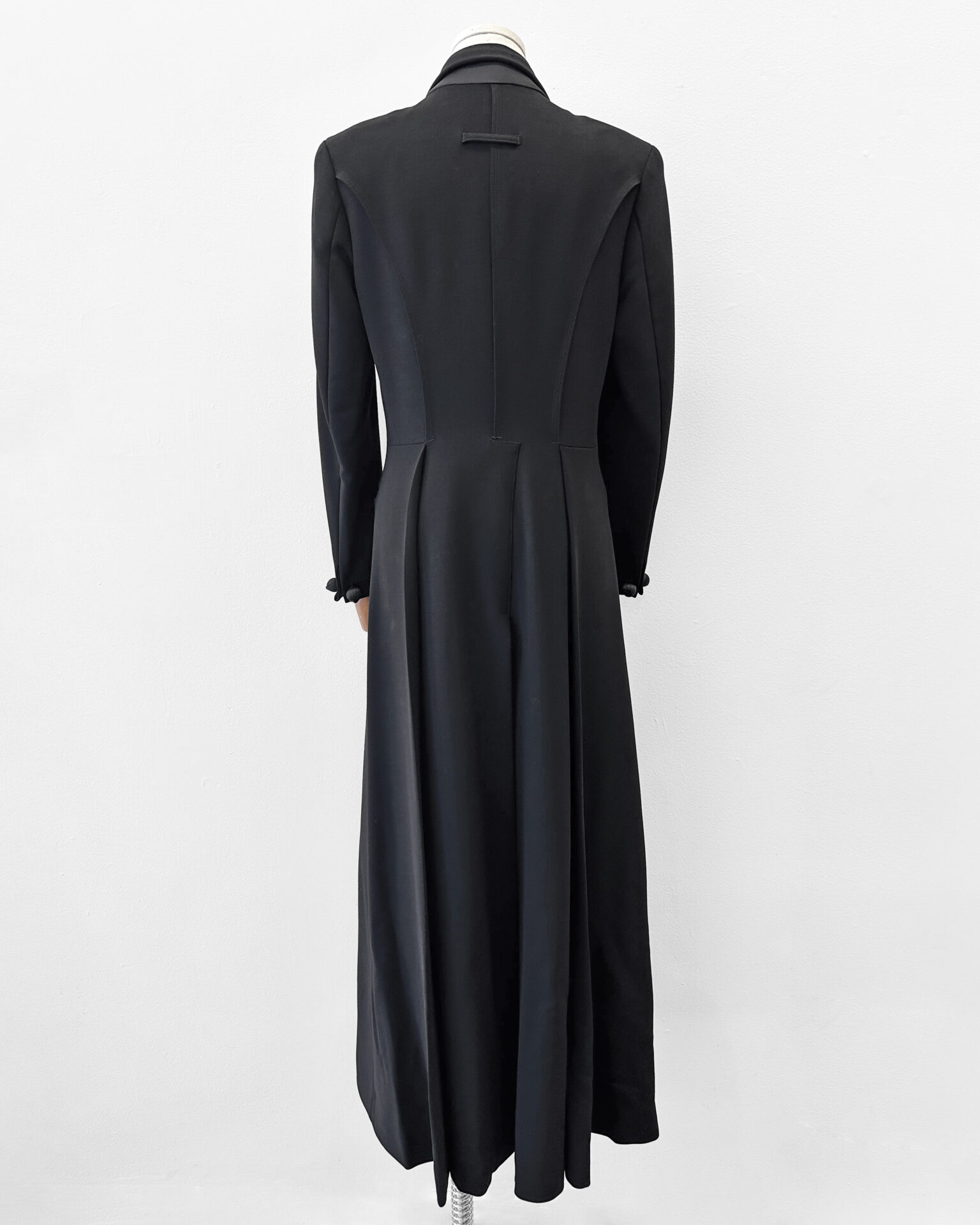 Vintage black tuxedo style long coat, featuring a crystal label pin, single waist closure, and a split back hem that goes up to the hip. Fully lined.