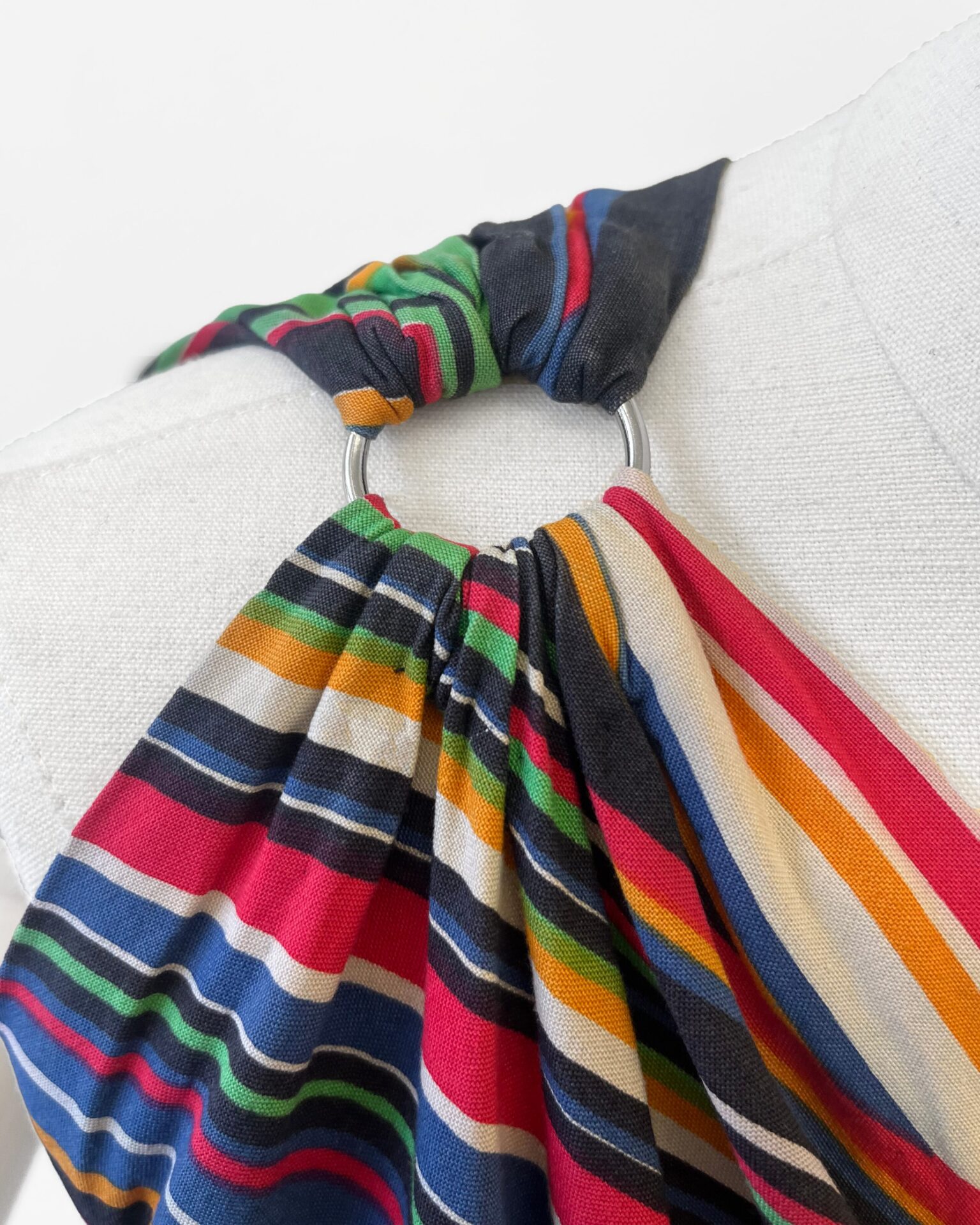 Lanvin vintage SS1972 single shoulder gown with a single shoulder strap joined together at the top with a large silver metal ring. Features a multicolour striped abstract shape print, and extra large metal side zip.