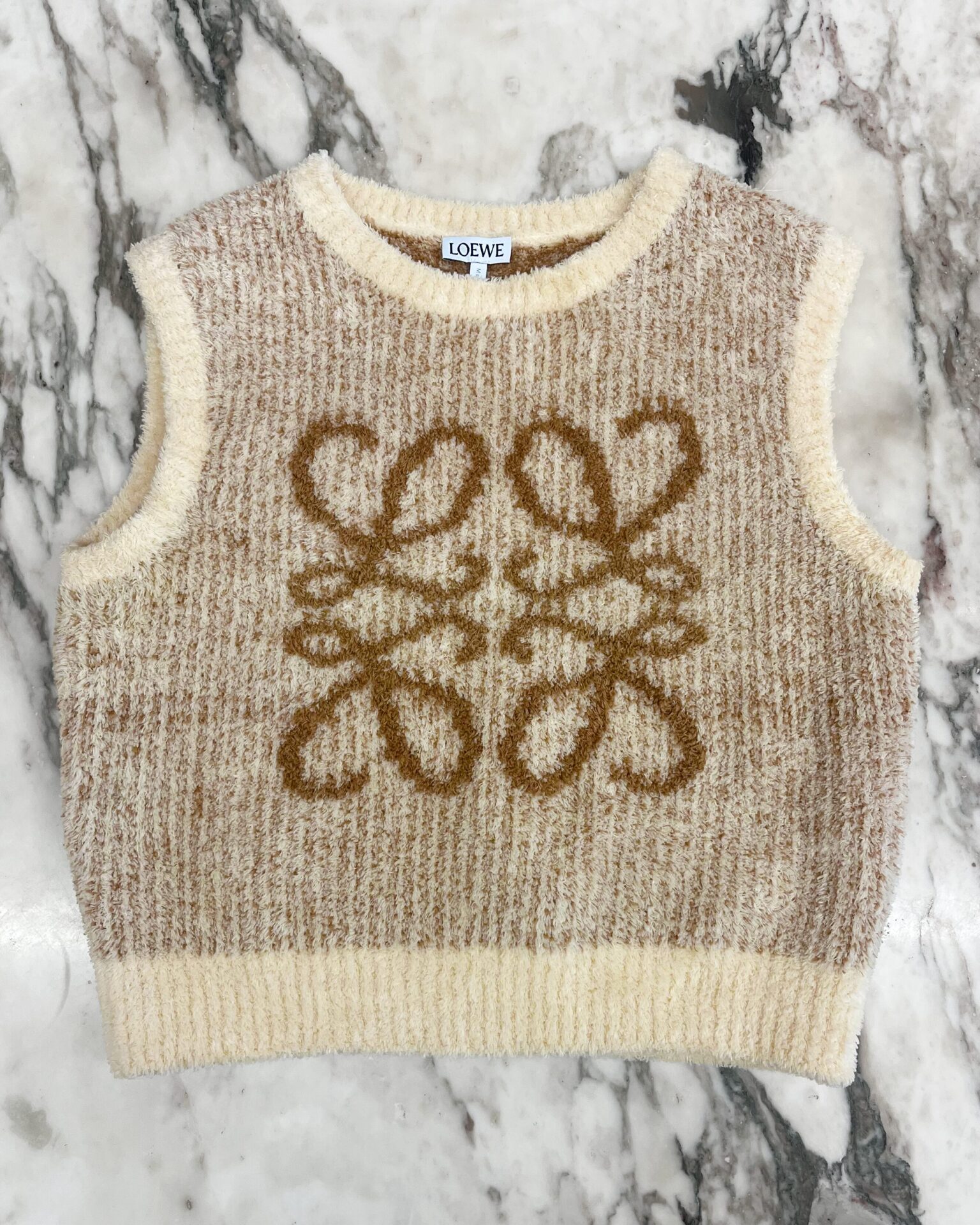 Super cute Loewe fuzzy knit cotton/polyamide blend sleeveless vest with large anagram logo on the front.