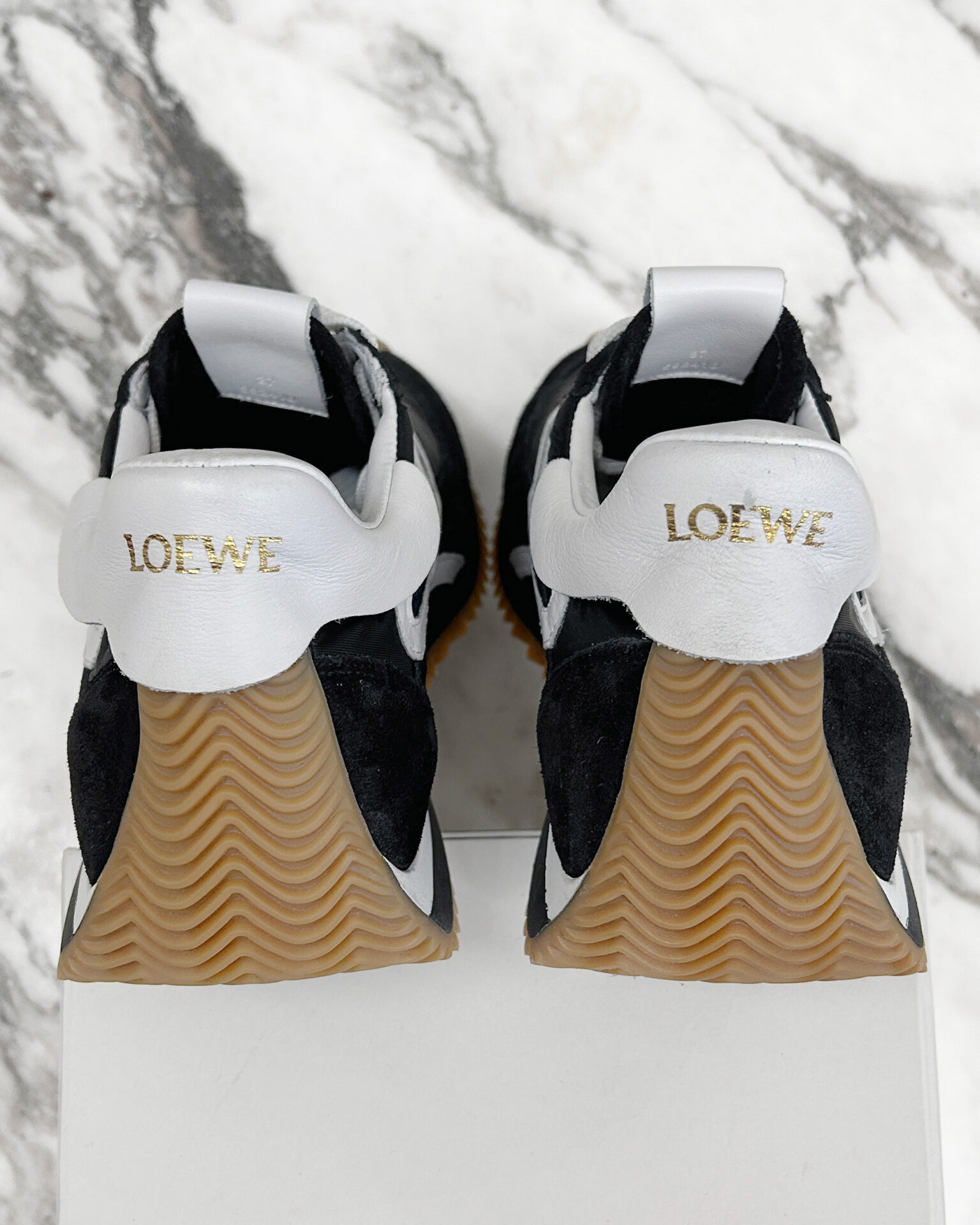 Black and white suede, leather and nylon lace up sneakers, with tan colour rubber sole. Comes with original box, dust bags, and an extra pair of black laces.