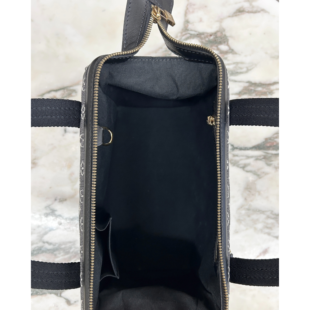 Monogram print canvas bag in dark navy/white with dark navy trim. The bag zippers open to canvas interior with two inner pockets. Comes with a dust bag. Dimensions: 11″ x 7.5″ x 5.5″ (W x H x D). Straps drop: 6.5″. Condition: Very good. Just bit of creasing on the leather trim, and a little wear on the bag feet.