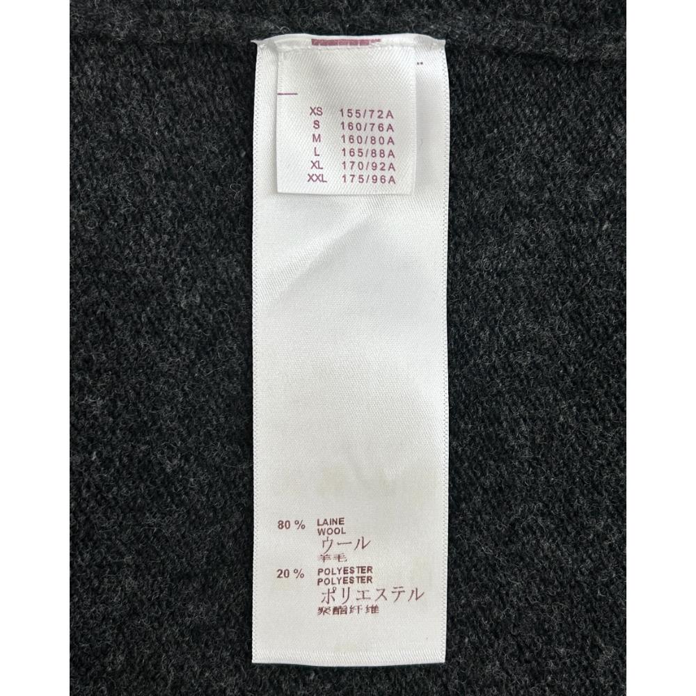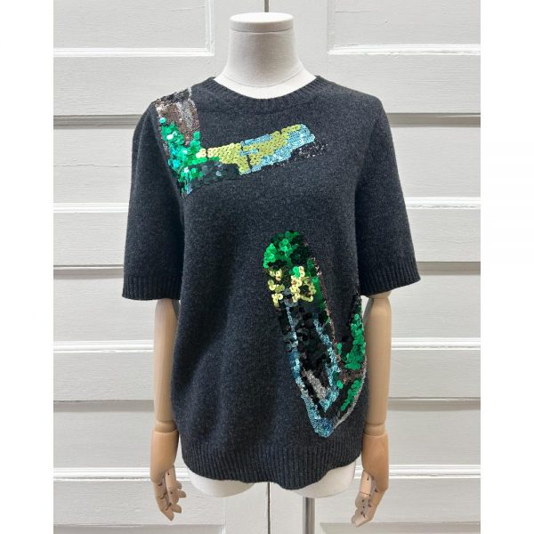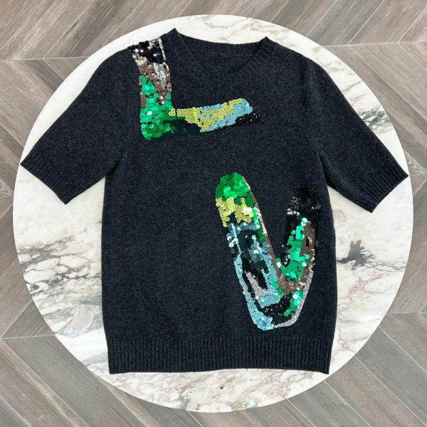 Dark grey, wool blend knit sweater. Features short sleeves, ribbed knit trim, and “LV” sequin appliques. See label image for material content. Condition: Purrrfect. No flaws to garment. Main brand label was removed before arrival in store.