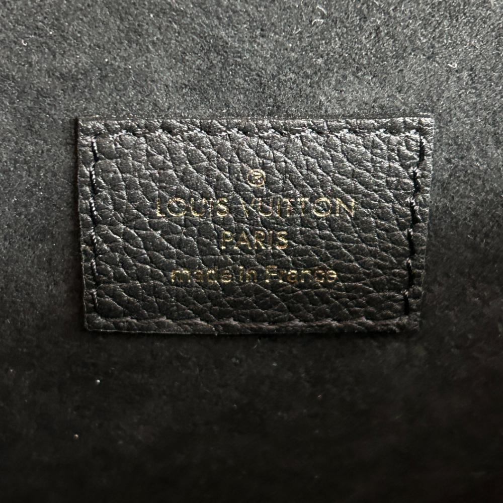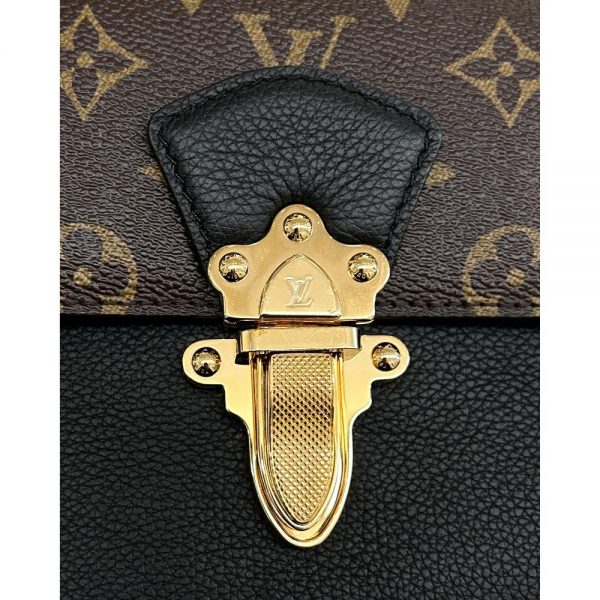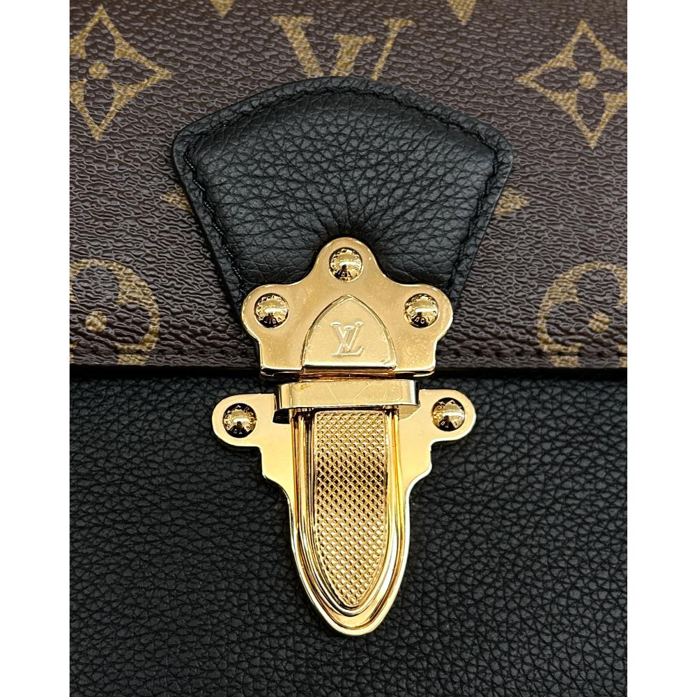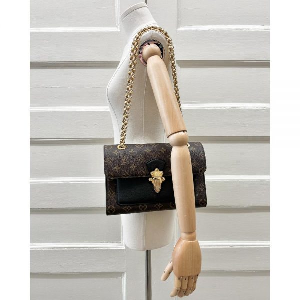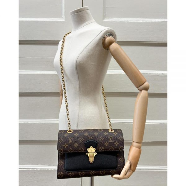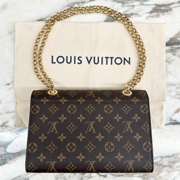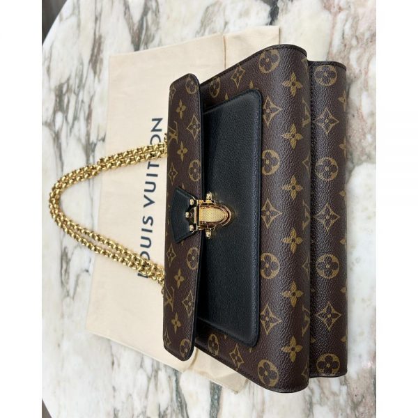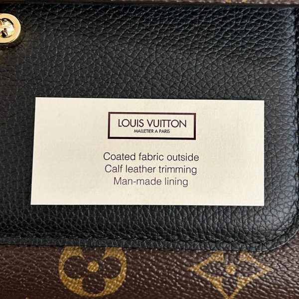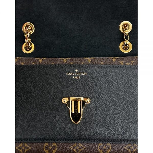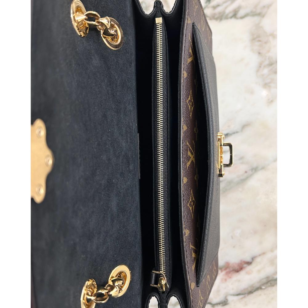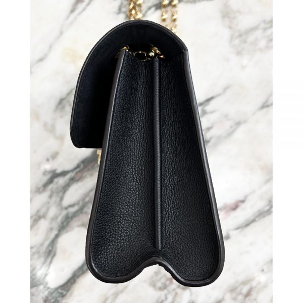 Brown monogram coated canvas and black leather bag, with gold tone hardware. The push clasp opens the bag to a black suede lined interior with multiple inner compartments. The chain strap can be worn long or doubled up to be shorter. Comes with a dust bag and box. Bag dimensions: 10.25″ x 7″ x 3.5″ (W x H x D). Strap drops: 11.5″ & 21″. Condition: Near purrrfect. a couple very light scratches on the front clasp. Some of the other hardware still has the protective plastic on it. No other flaws on the bag.
