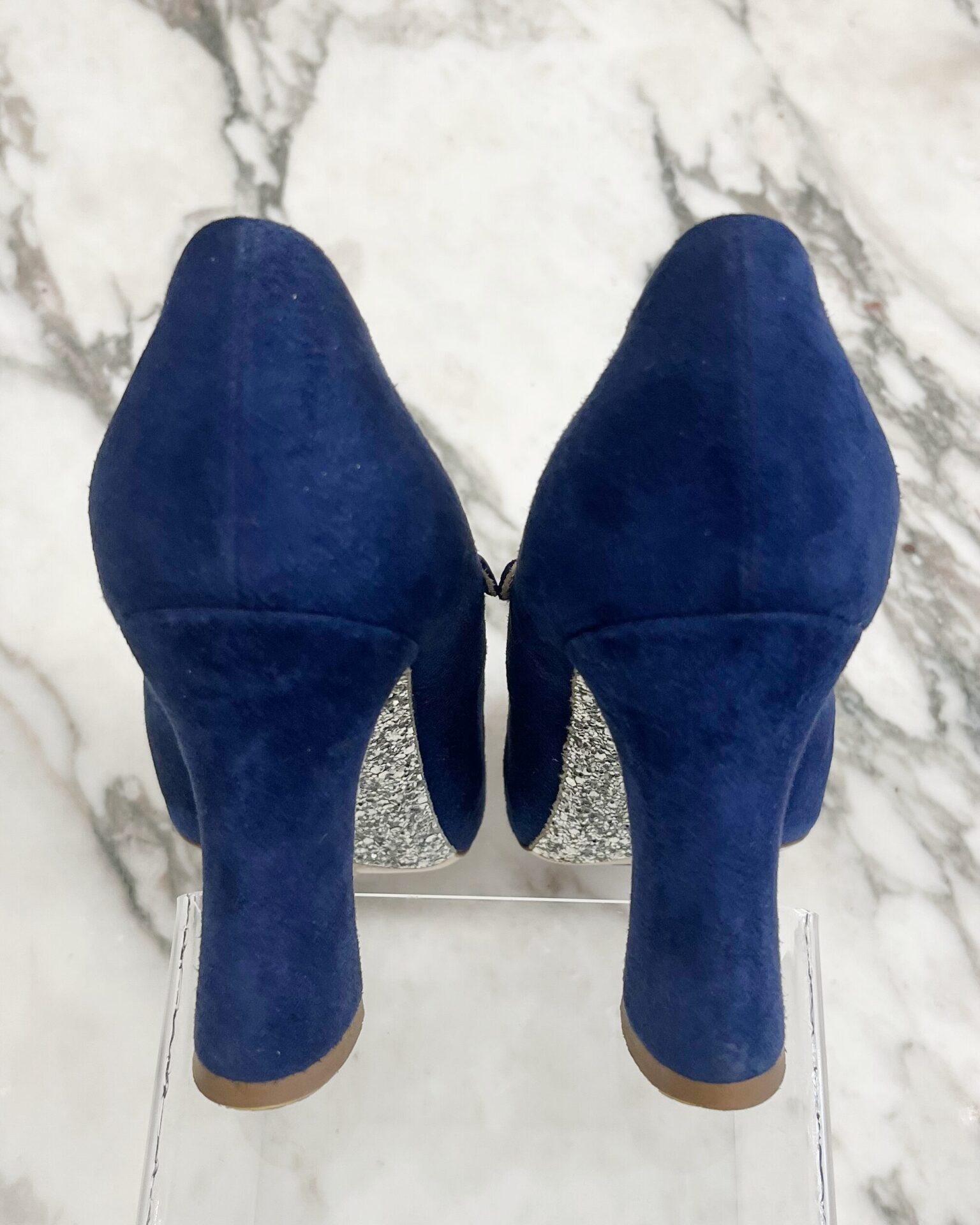 Navy suede leather Miu Miu pumps with pink leather interior, silver metal buckle closure, and silver sparkles on the sole from the shank to the bottom of the heel. Includes dustbag.