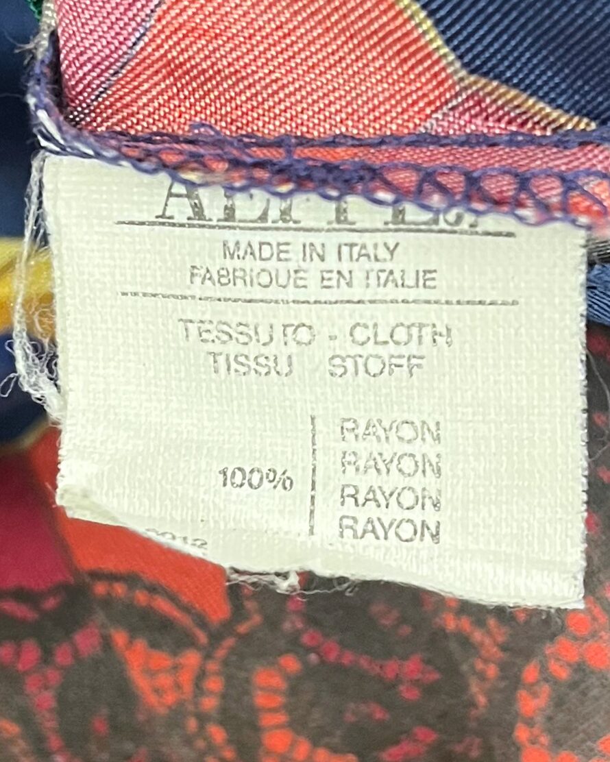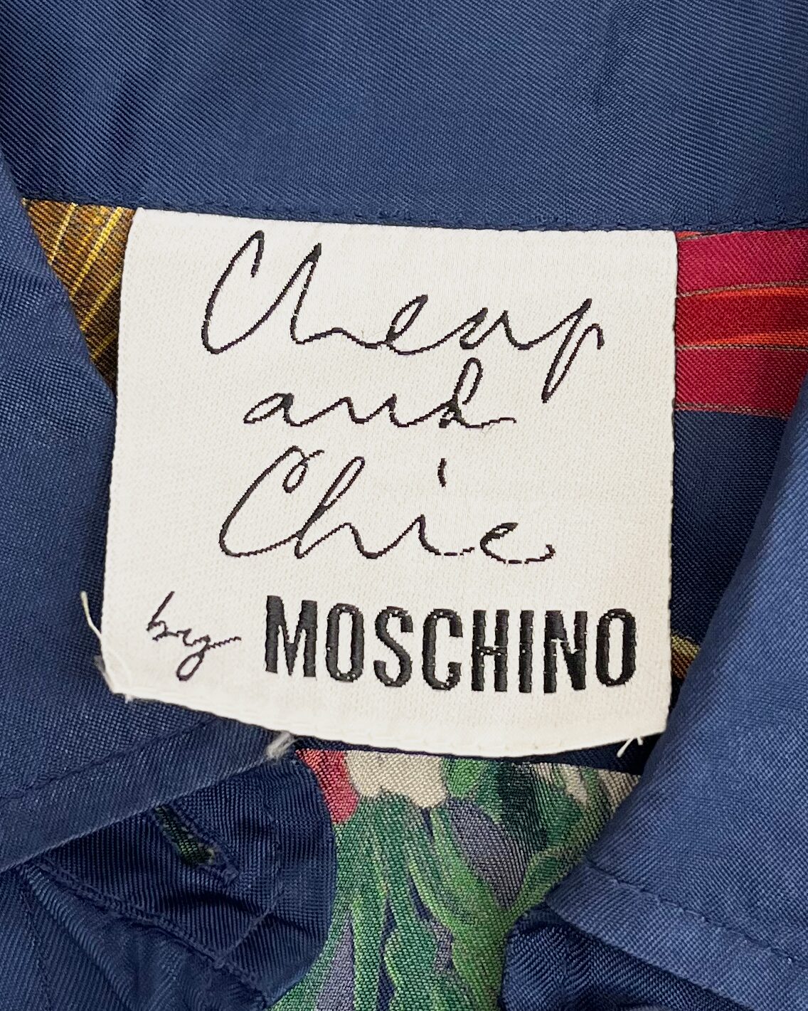 90’s Cheap & Chic Moschino soft rayon blouse with graphics of rope, florals, peace sign and ‘cheap and chic’ spellout.