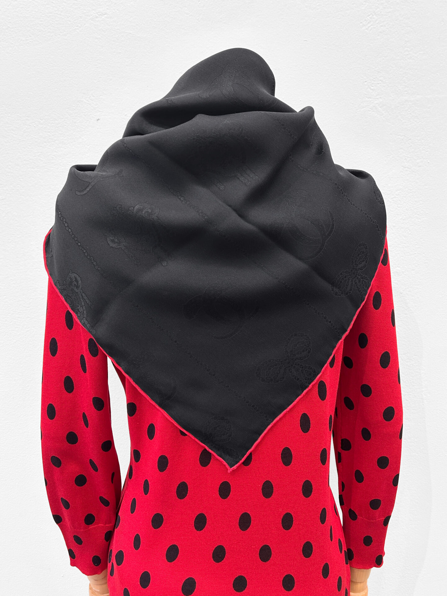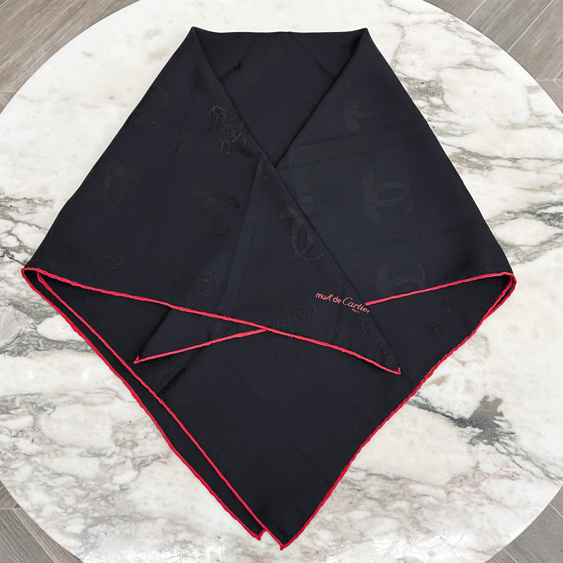 Black silk scarf with faint monochrome pattern, and red rolled edges.