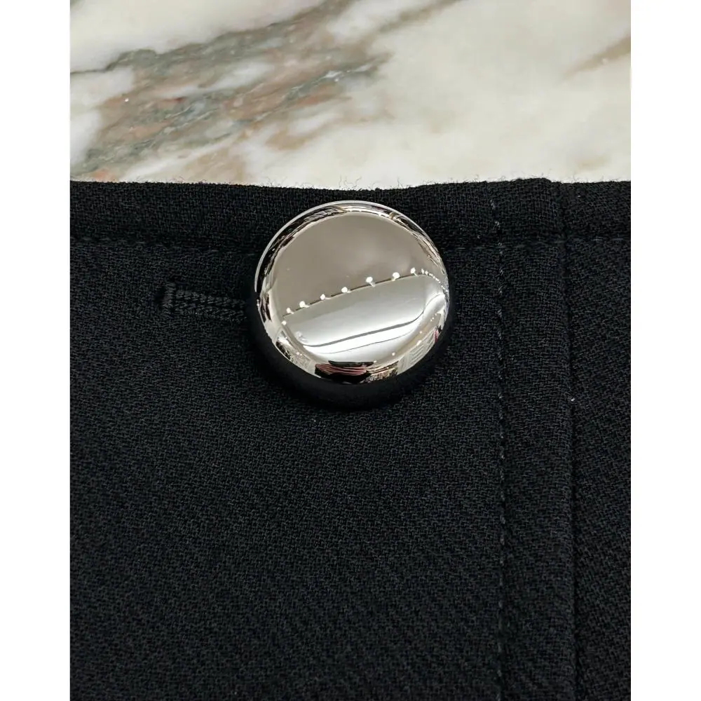 Black wool A-line skirt with large silver buttons at the waist. The skirt has a back zipper to open and is fully lined. Made from 100% virgin wool. Lining is 100% cupro. Condition: Purrrfect. No flaws.