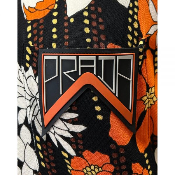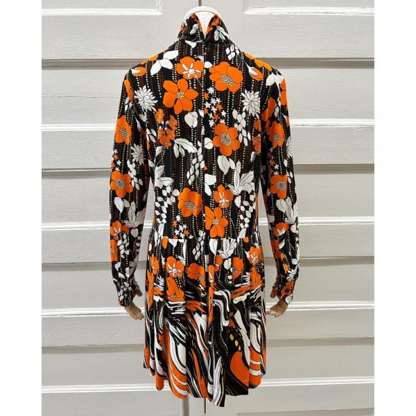 Orange, black, brown, white and yellow psychedelic floral print knit dress. This dress features a high neck, long sleeves, a breast pocket and pleated skirt with a ruched detail. There is a back neck zipper and rubber logo at the breast pocket. See label image for material content. Condition: Purrrfect. No flaws.