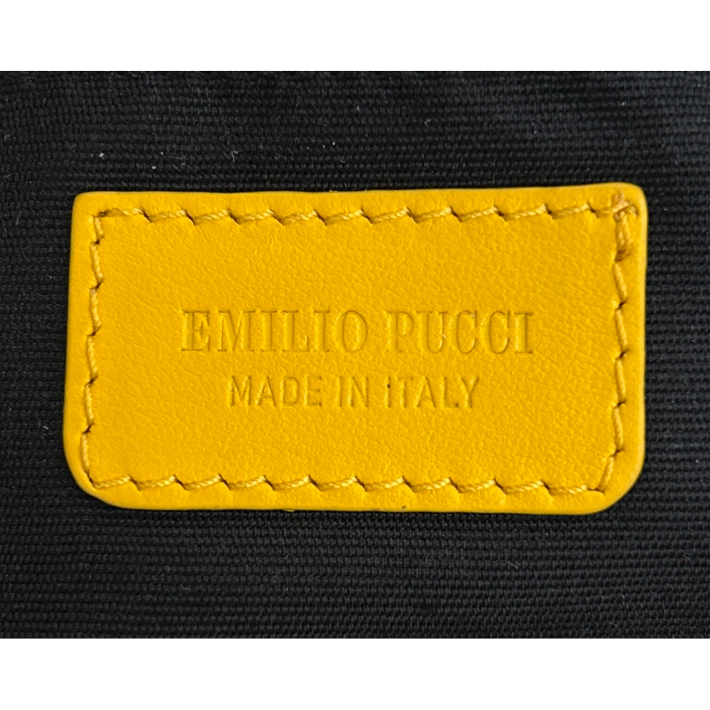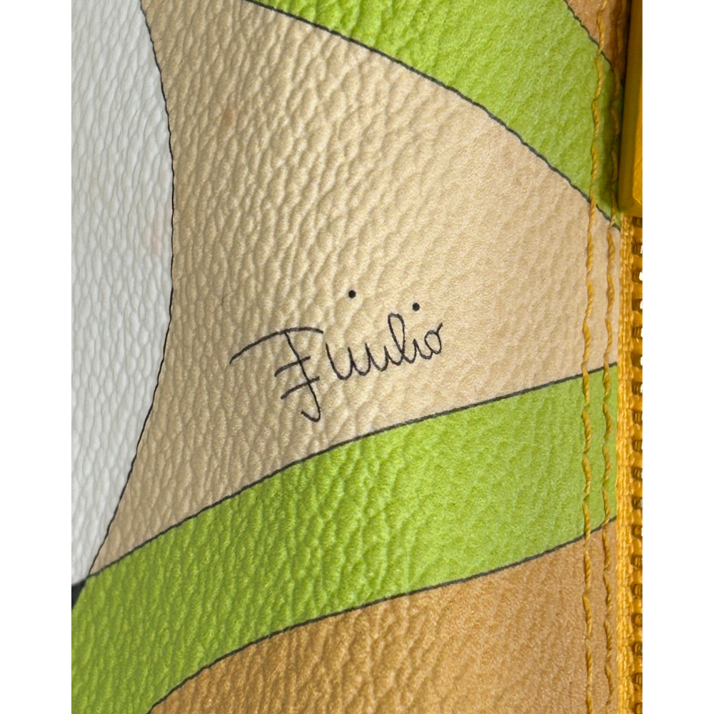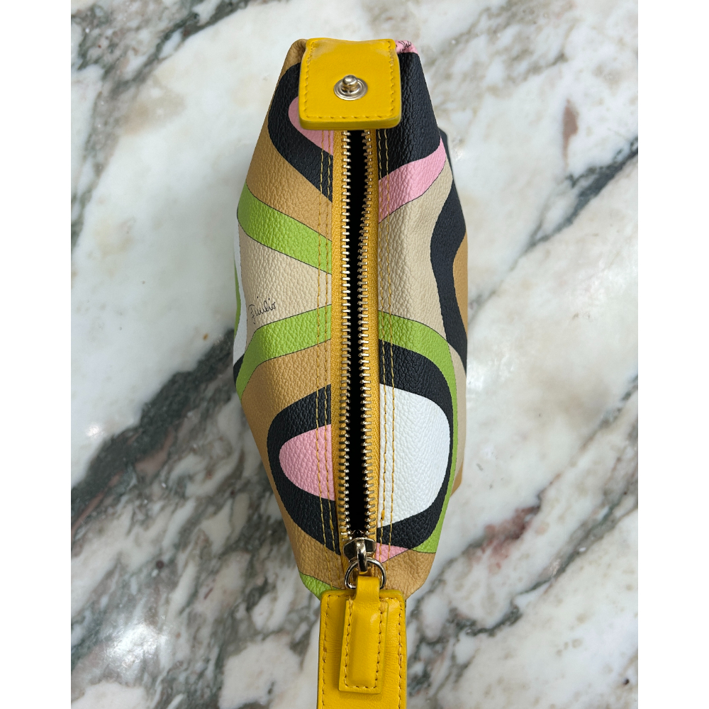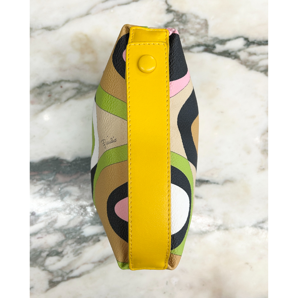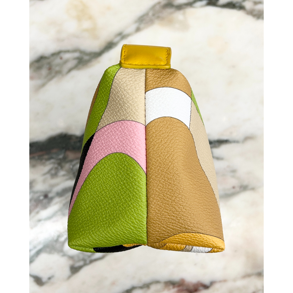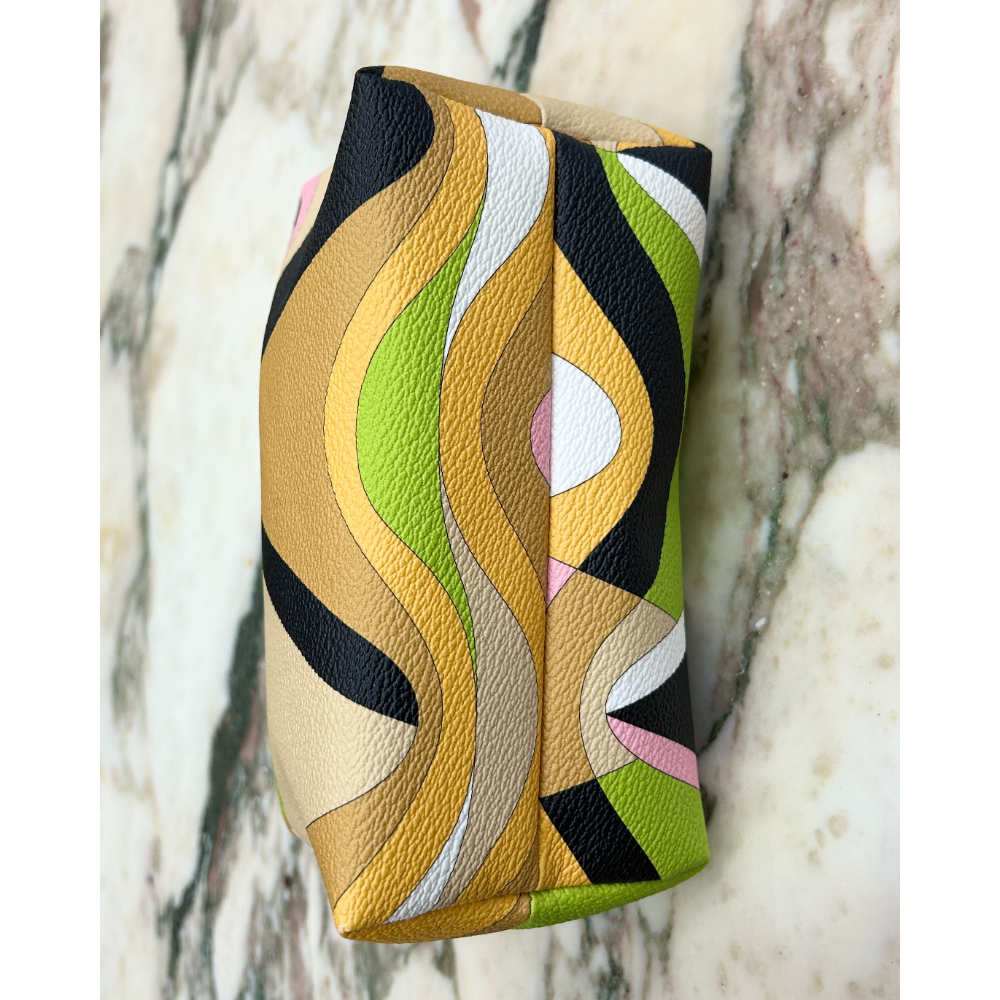 Small, graphic printed pouch/purse in mustard, black, pink and green coated canvas. The bag zippers open to a black canvas interior with a small inner pocket. Dimensions: 7.5″ x 4″ x 3.5″ (W x H x D). Condition: Very good. Only a few small and faint spots of discolouration on the bags outer.