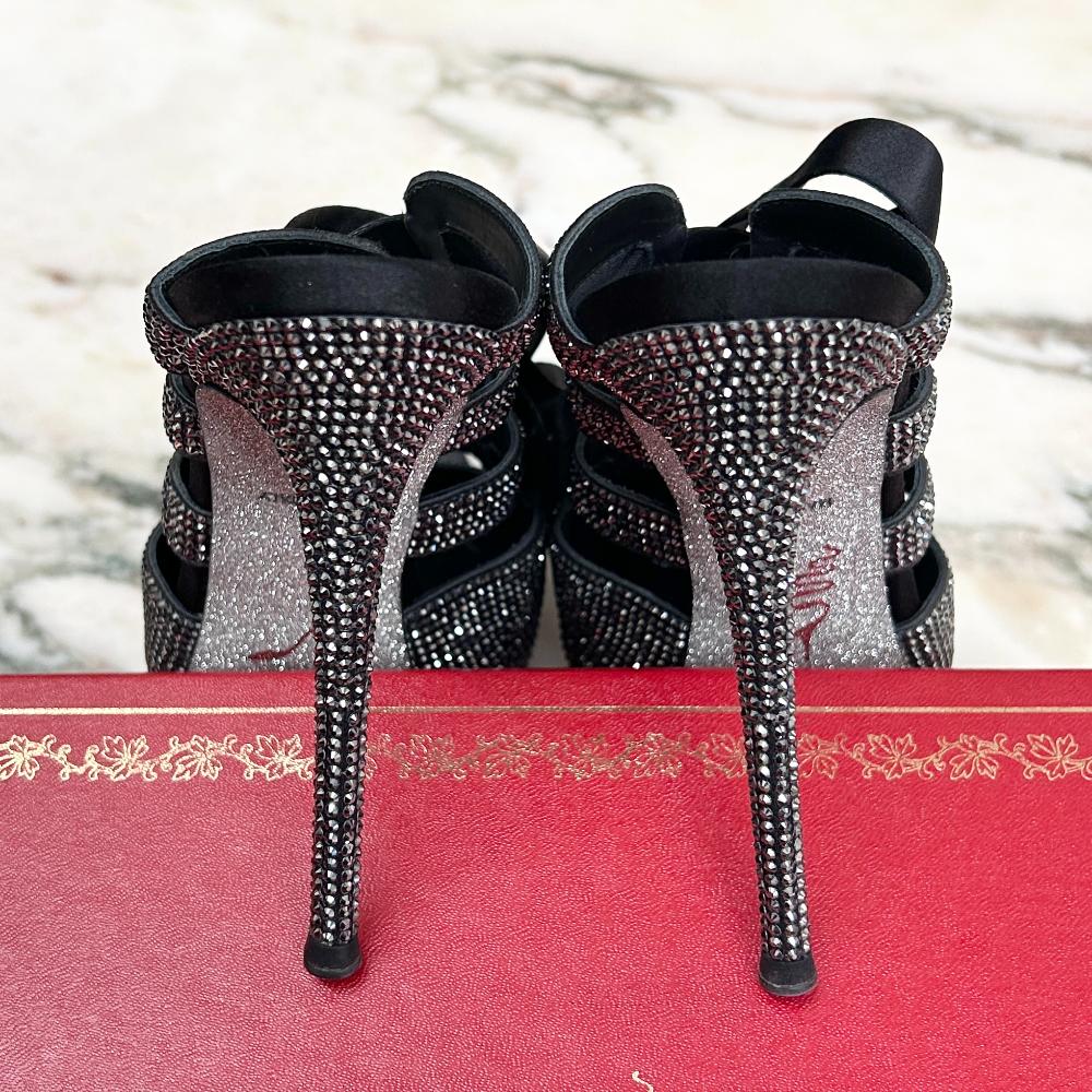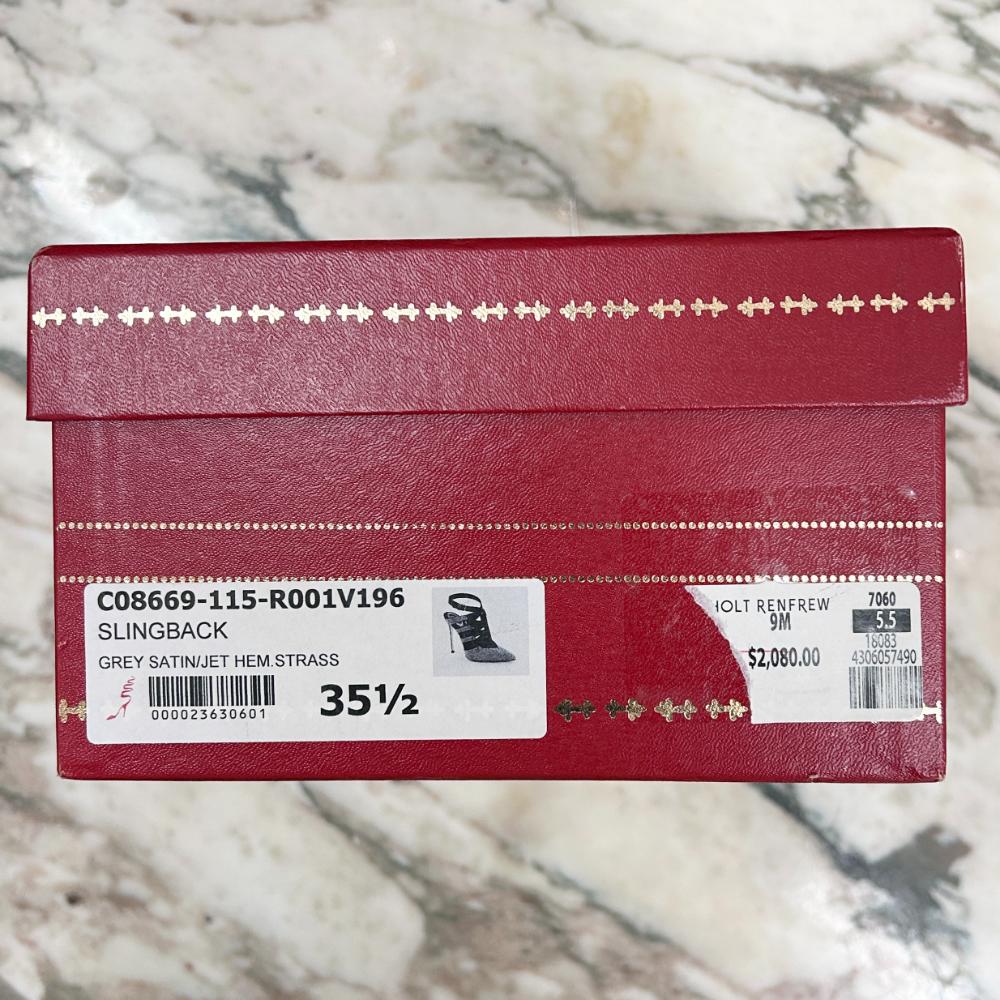 Dark grey crystal covered heels, with ribbon lace up detailing. The ribbon laces up the front and around the ankle, and has an adjustable buckle. 4.5″ heel. Size 35.5 (US women’s 5.5). Comes with their original box and dust bag. Condition: Near purrrfect. One crystal missing on the right shoe. No other flaws or signs of wear.
