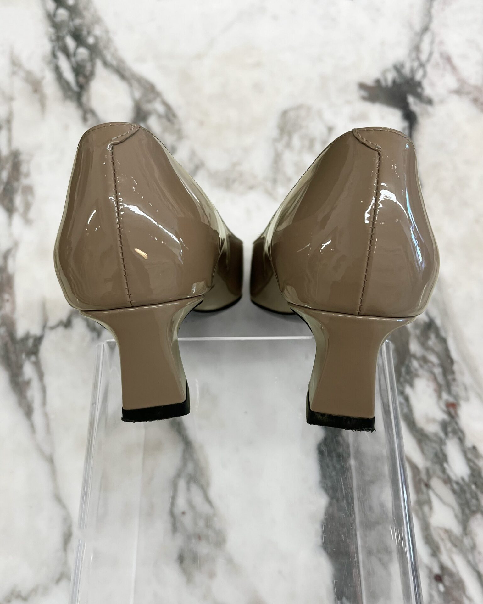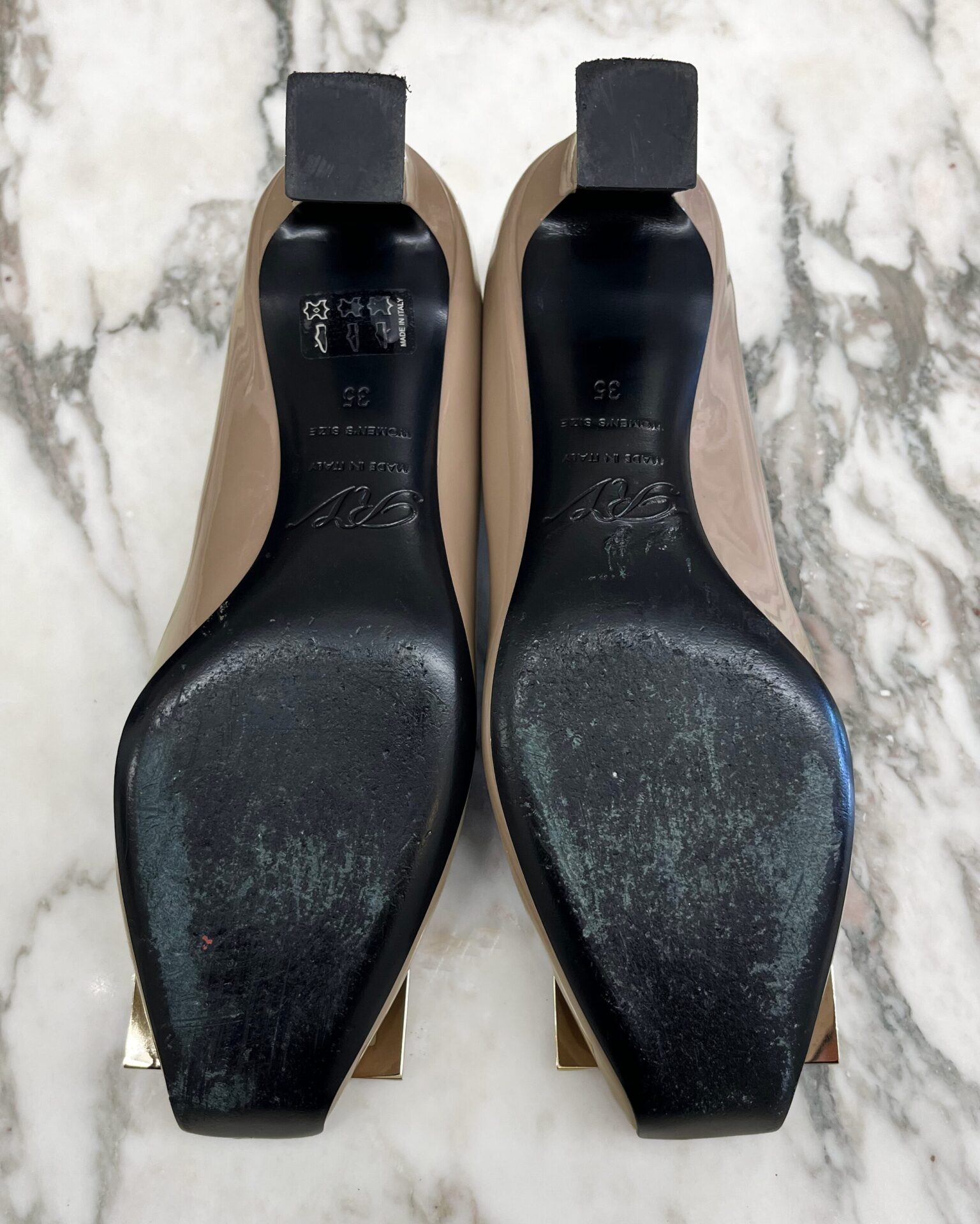 Blush patent leather 45mm heeled shoe with signature Roger Vivier square buckle detail on the toe and black leather interior. Includes dustbag.