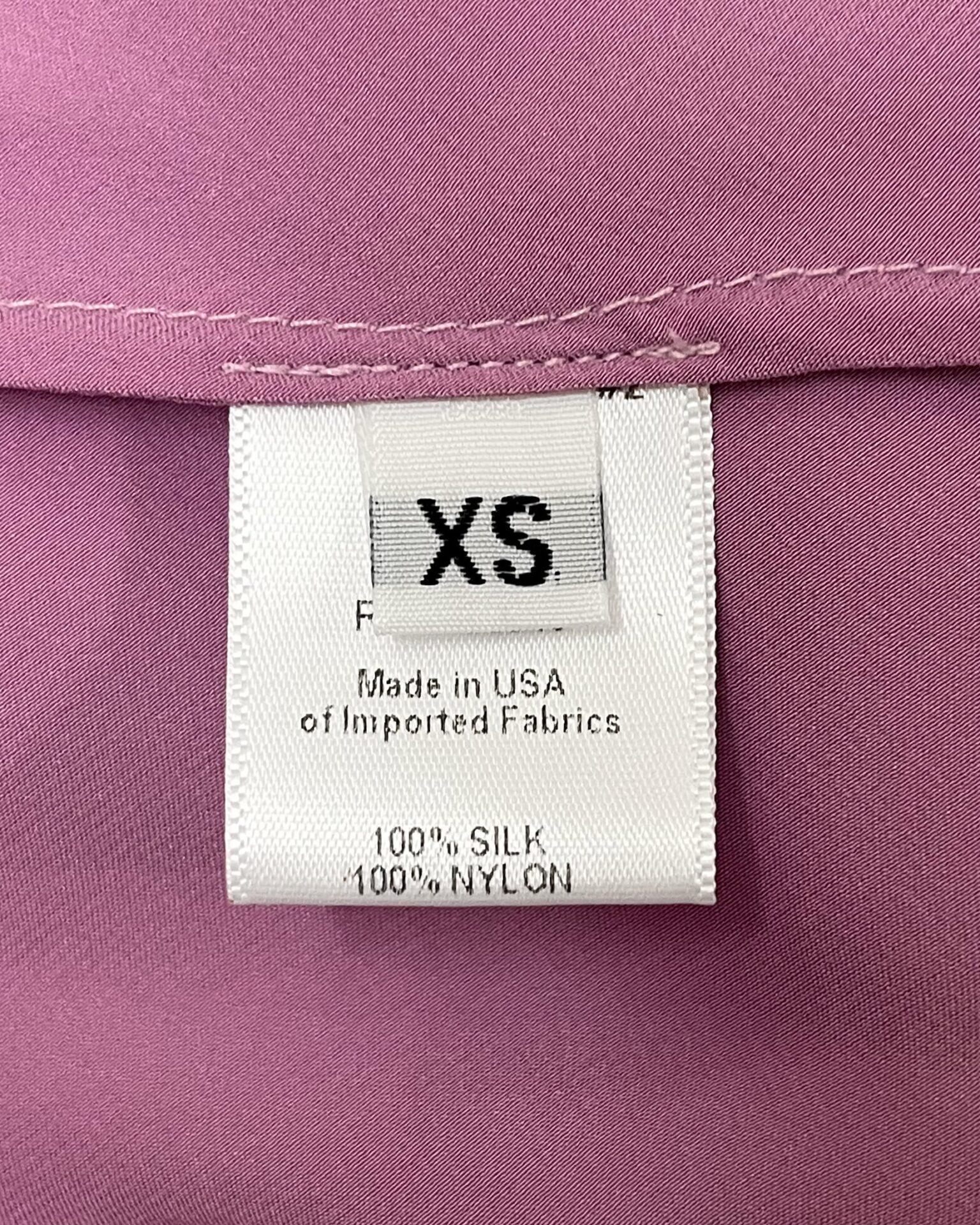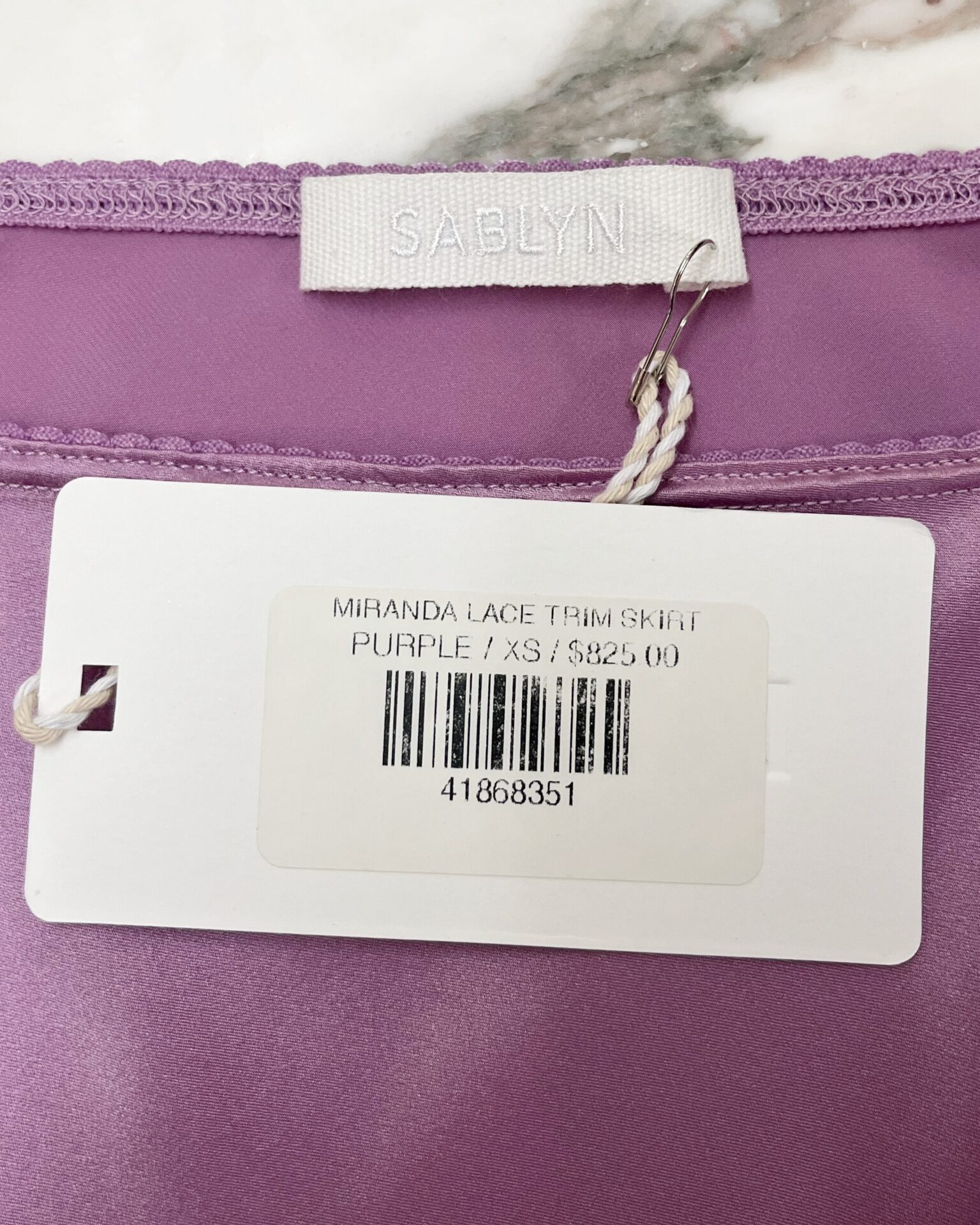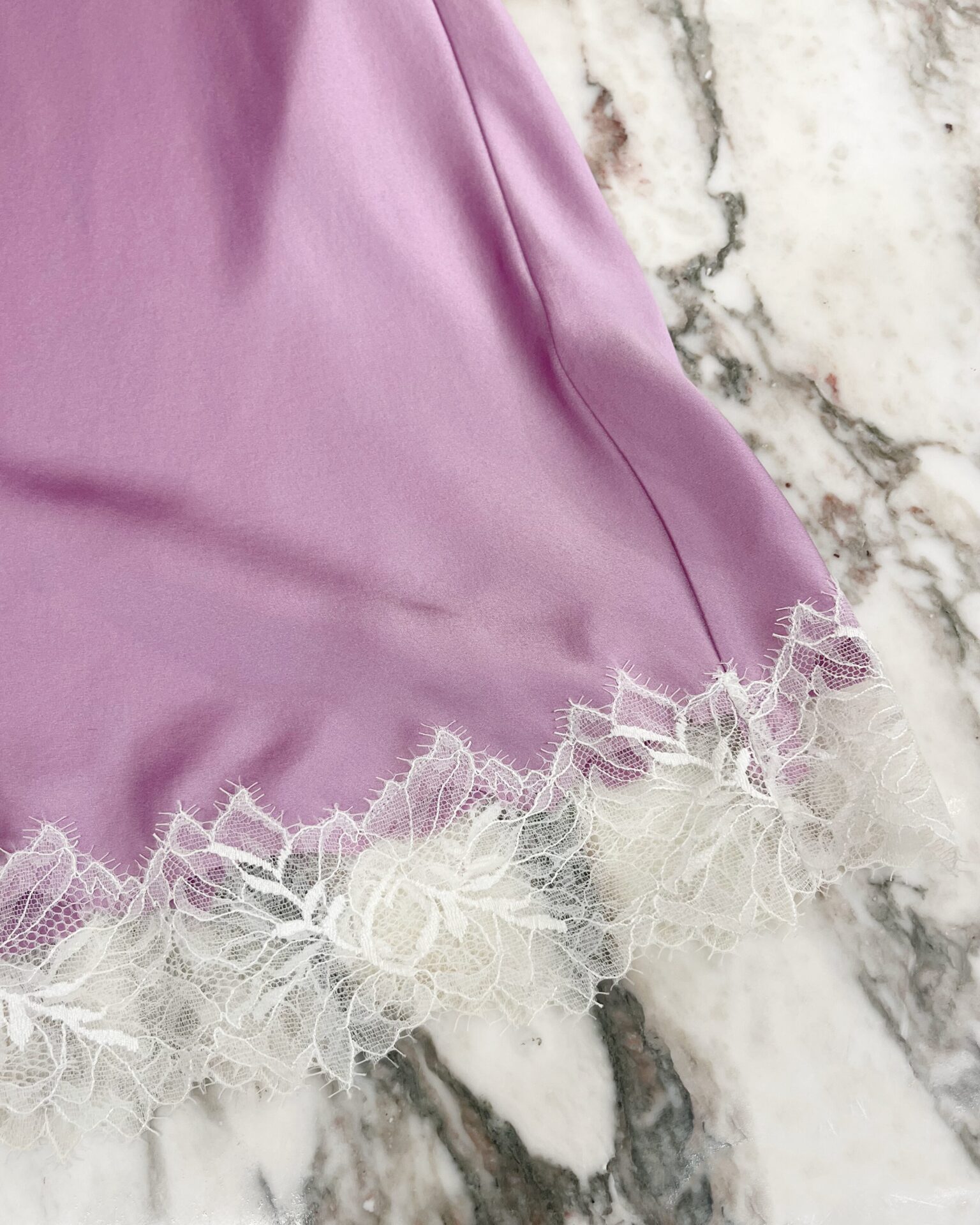 Lilac pink silk bias-cut maxi skirt with white lace trim on the bottom hem and subtle lilac trim on the waistline.