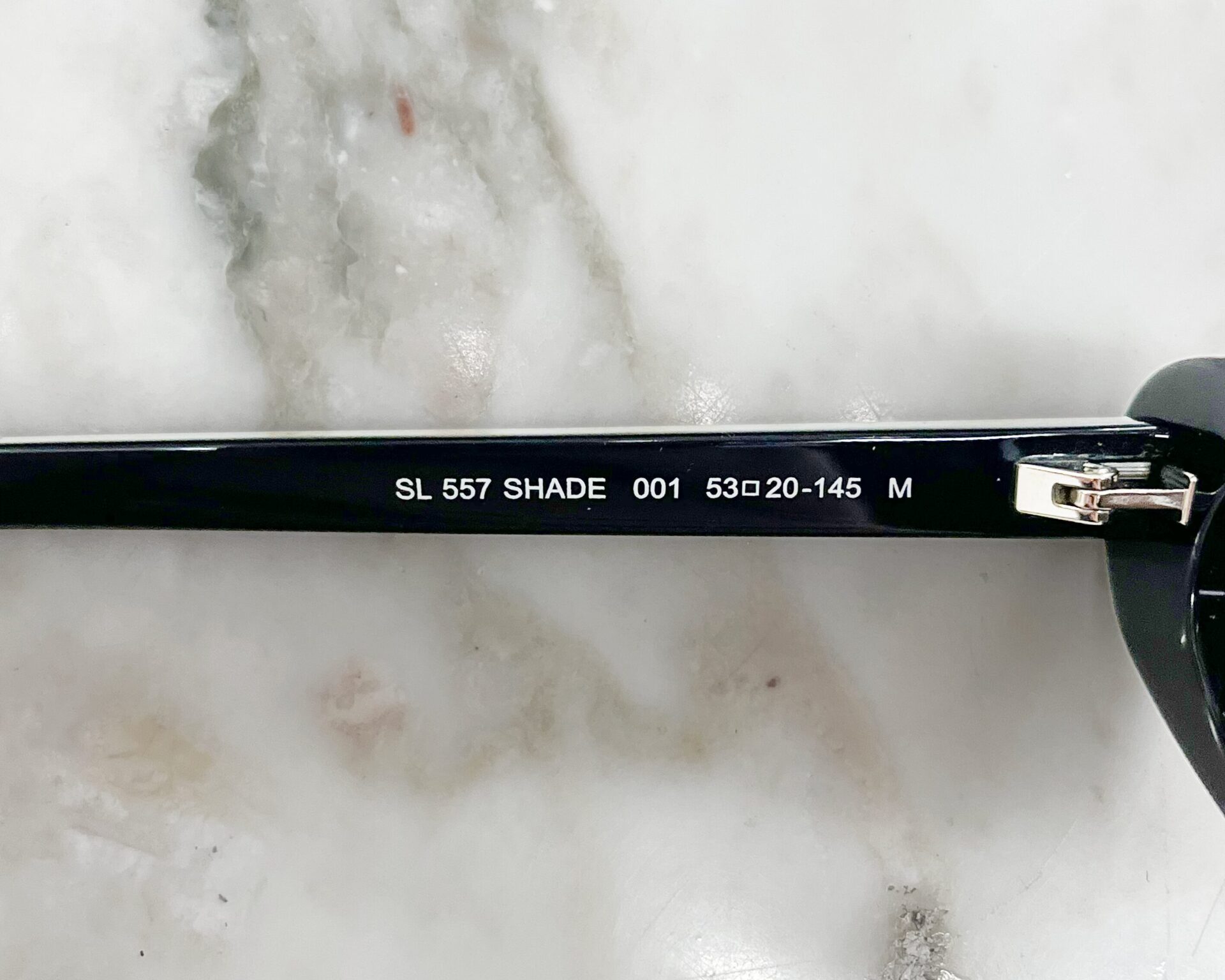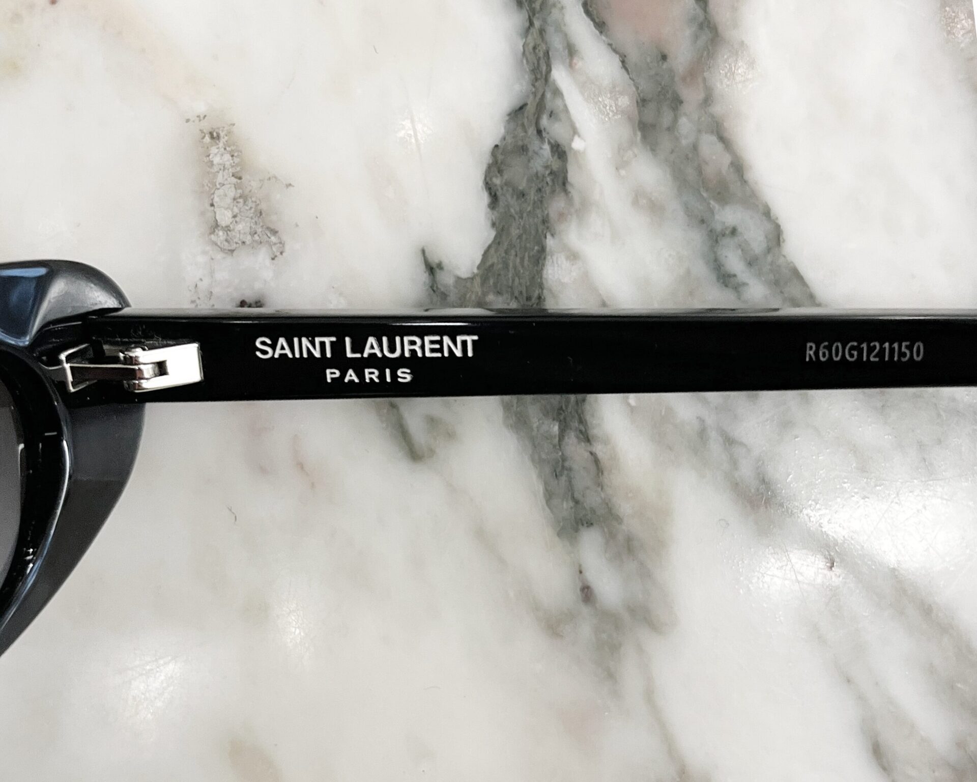 Slim black sunglasses with Saint Laurent logo spellout on the arms, includes leather case.