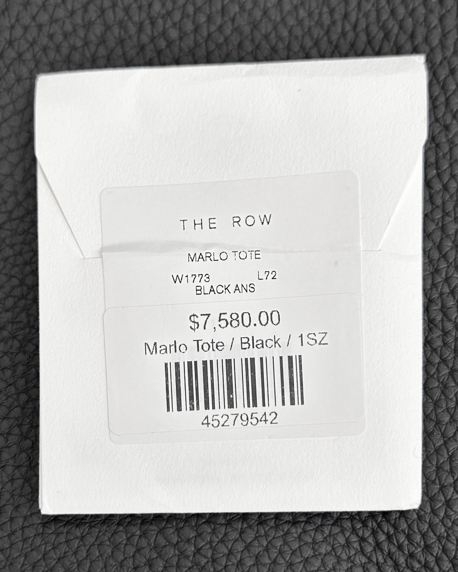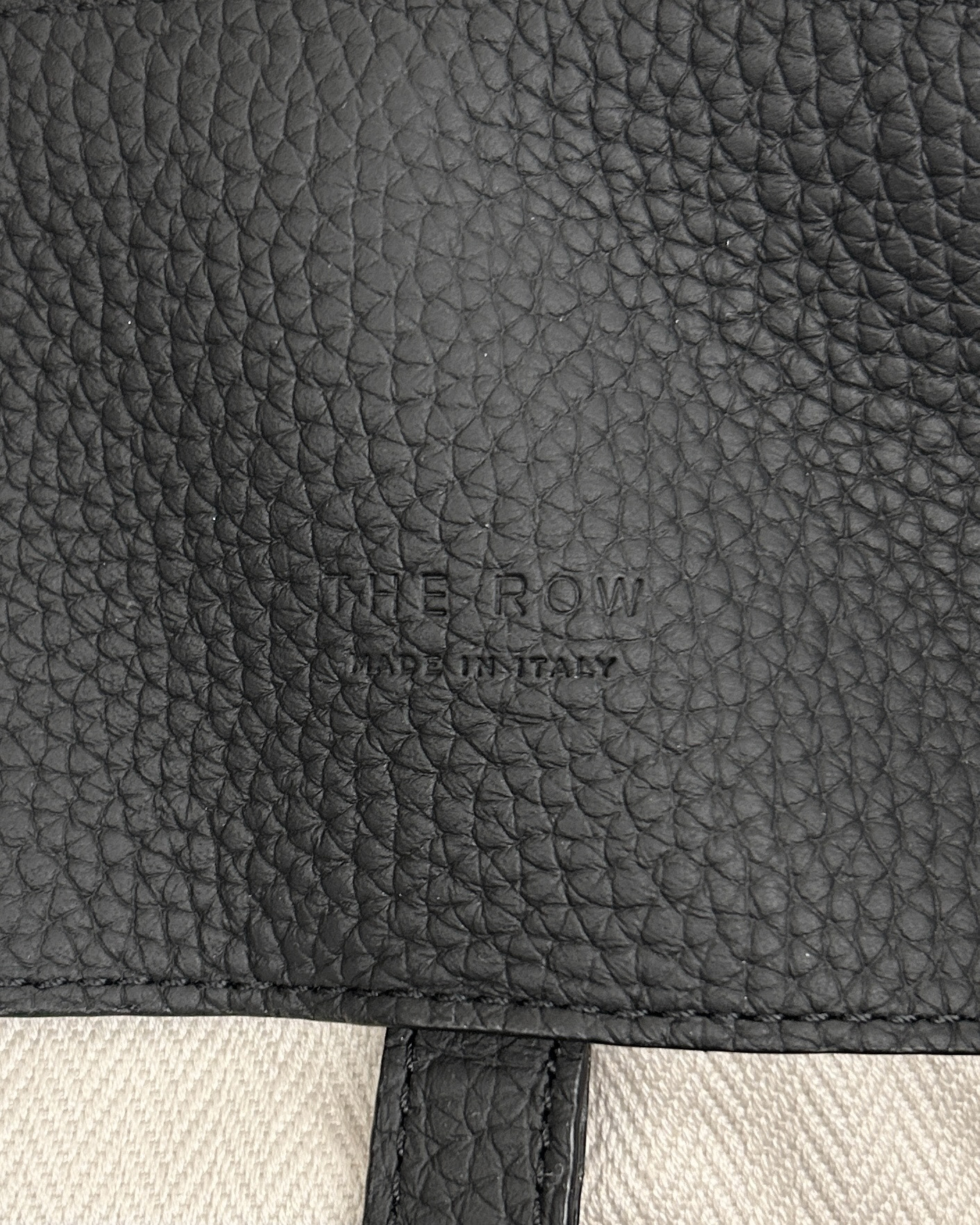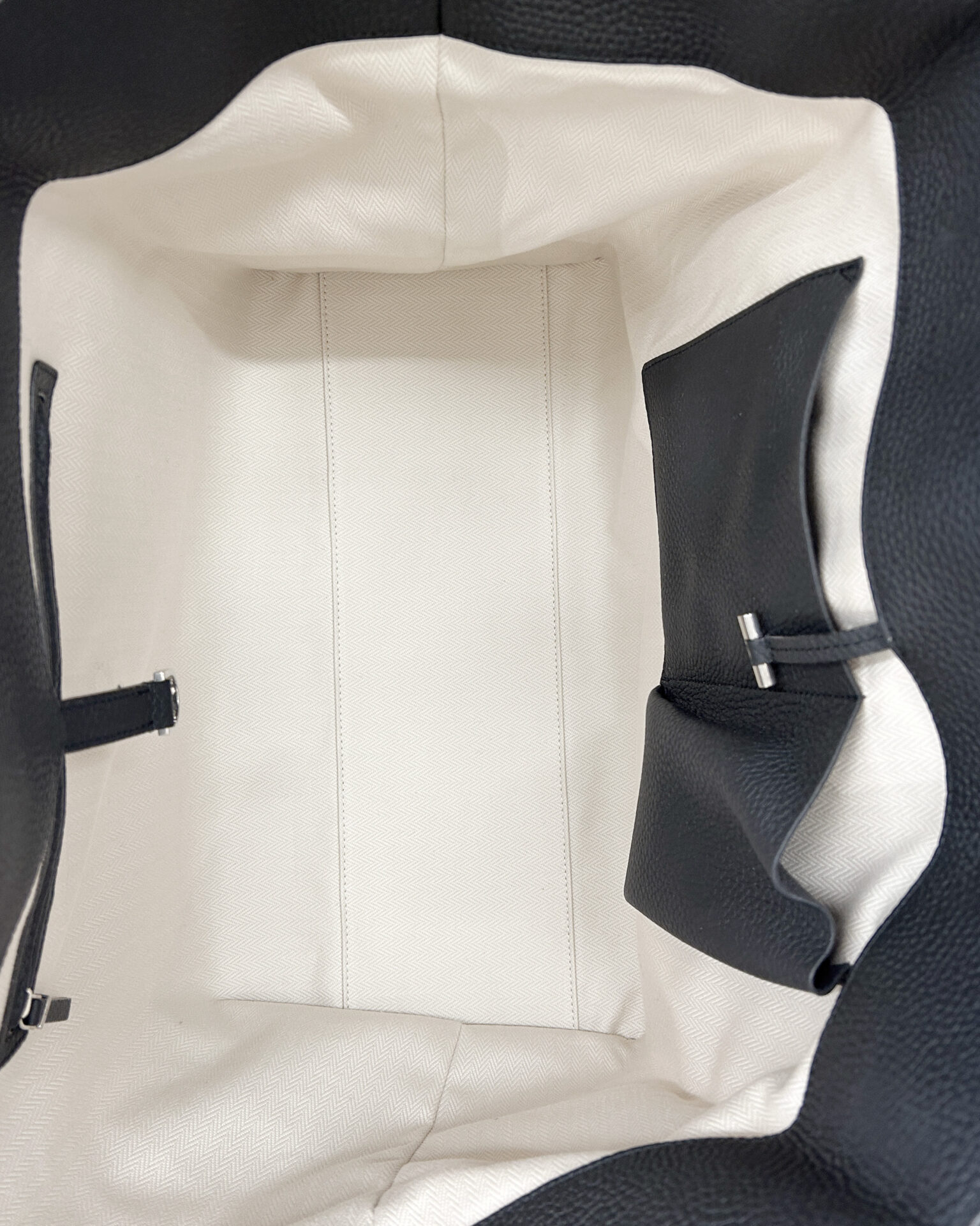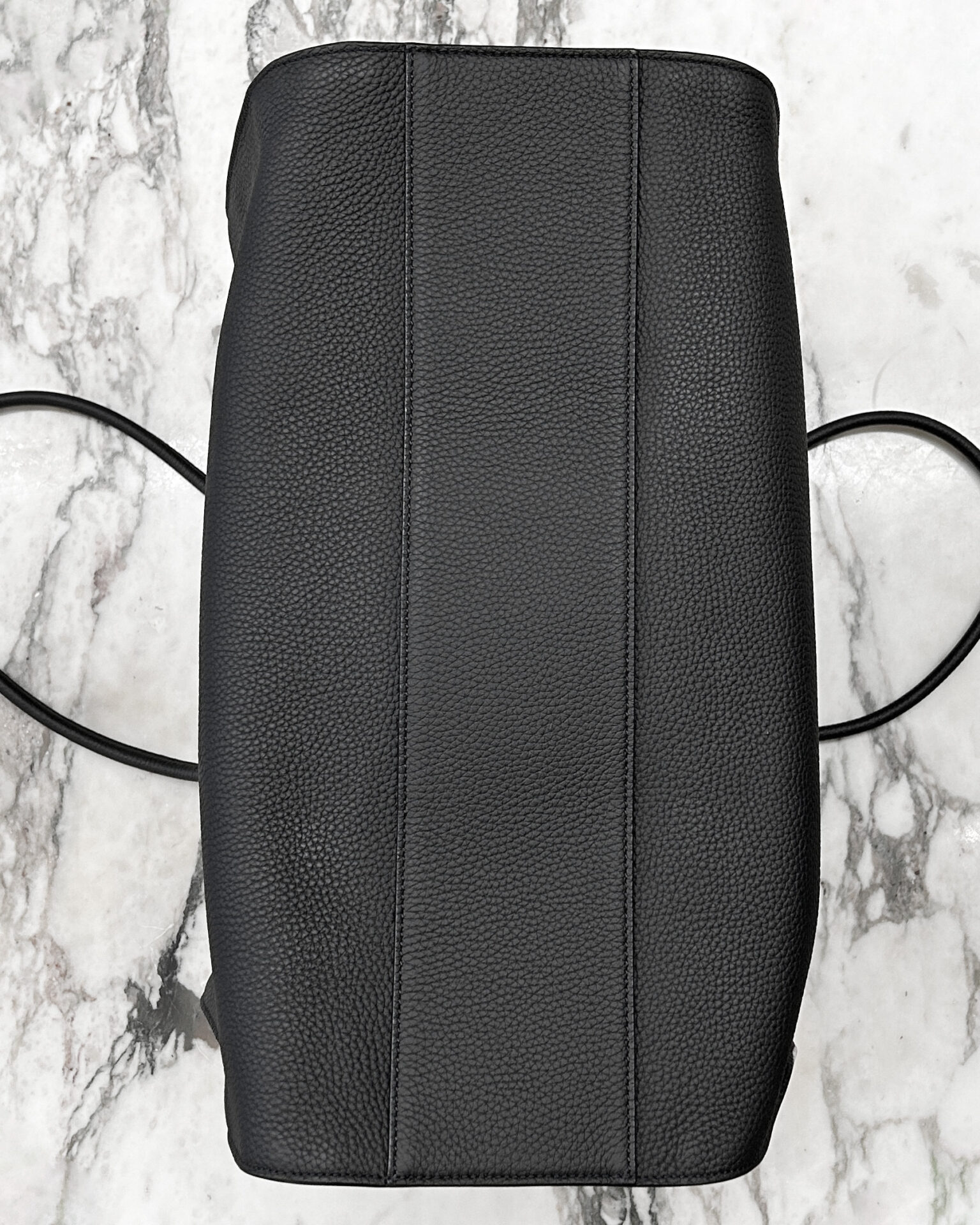 Pebbled leather tote featuring beige canvas lining, metal hardware closure, three inner pockets, and branding stamped on the bottom of the side and inside. Includes dustbag & original store tag.