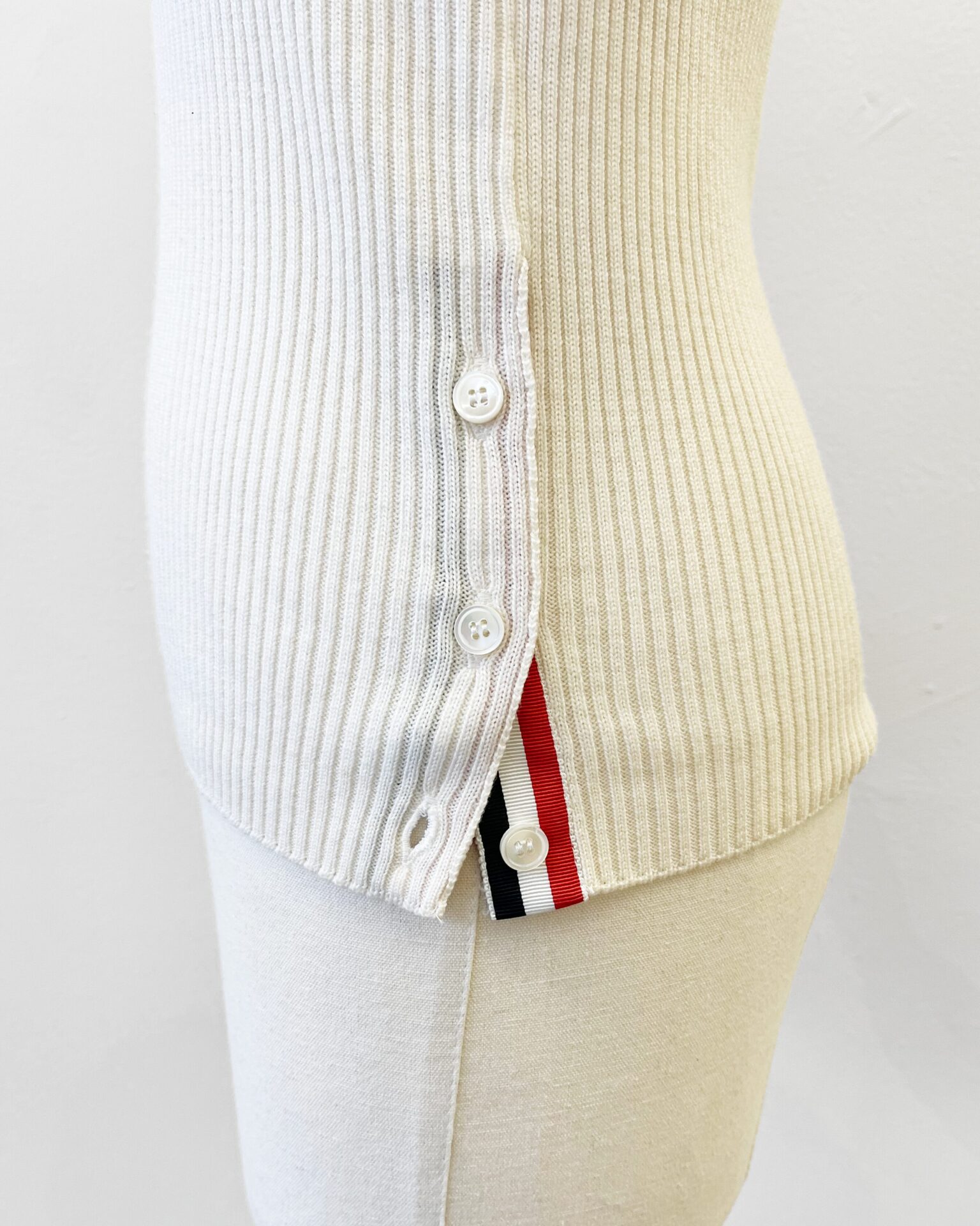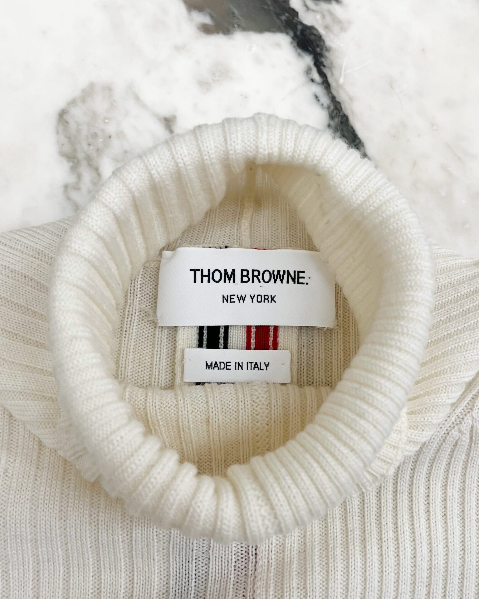 Camel hair rib-knit short sleeved turtleneck sweater featuring the signature Thom Browne tri-colour stripe panel running down the back and bottom of sides.