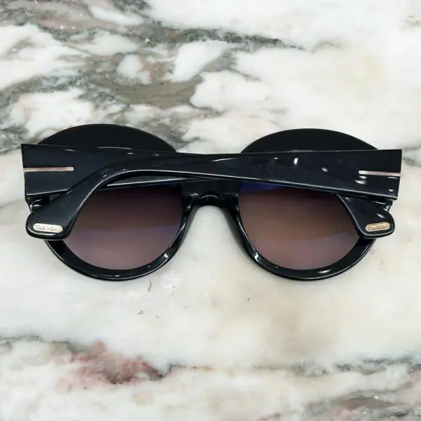 Black round sunglasses with ombre purple/peach lenses and gold tone hardware. Comes with original case. Dimensions: Lens width: 54 mm. Bridge width: 21mm. Temple length: 140mm. Condition: Fair. Some general wear on the frame with small light scratches throughout.