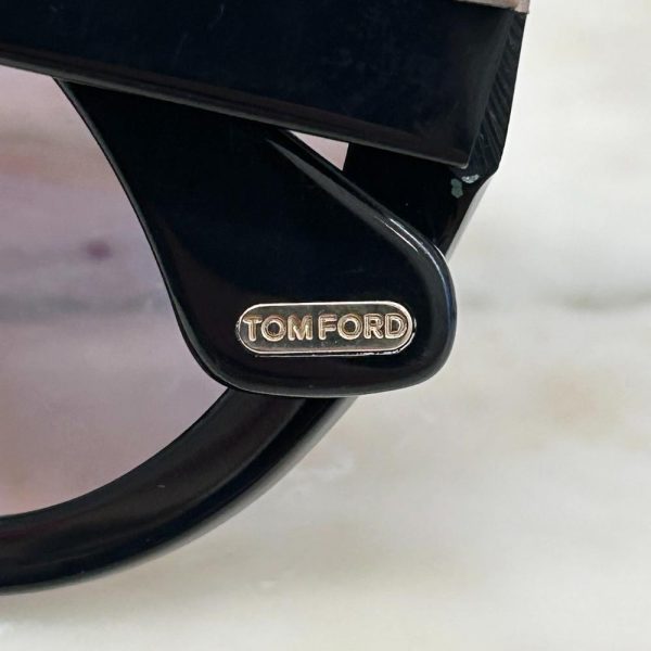 Black round sunglasses with ombre purple/peach lenses and gold tone hardware. Comes with original case. Dimensions: Lens width: 54 mm. Bridge width: 21mm. Temple length: 140mm. Condition: Fair. Some general wear on the frame with small light scratches throughout.