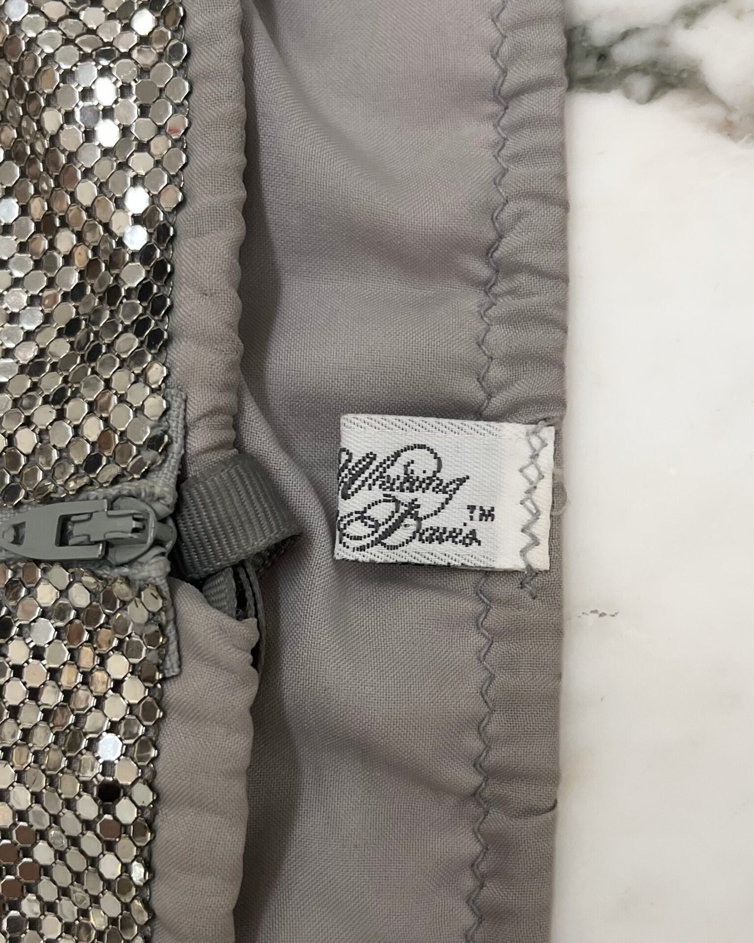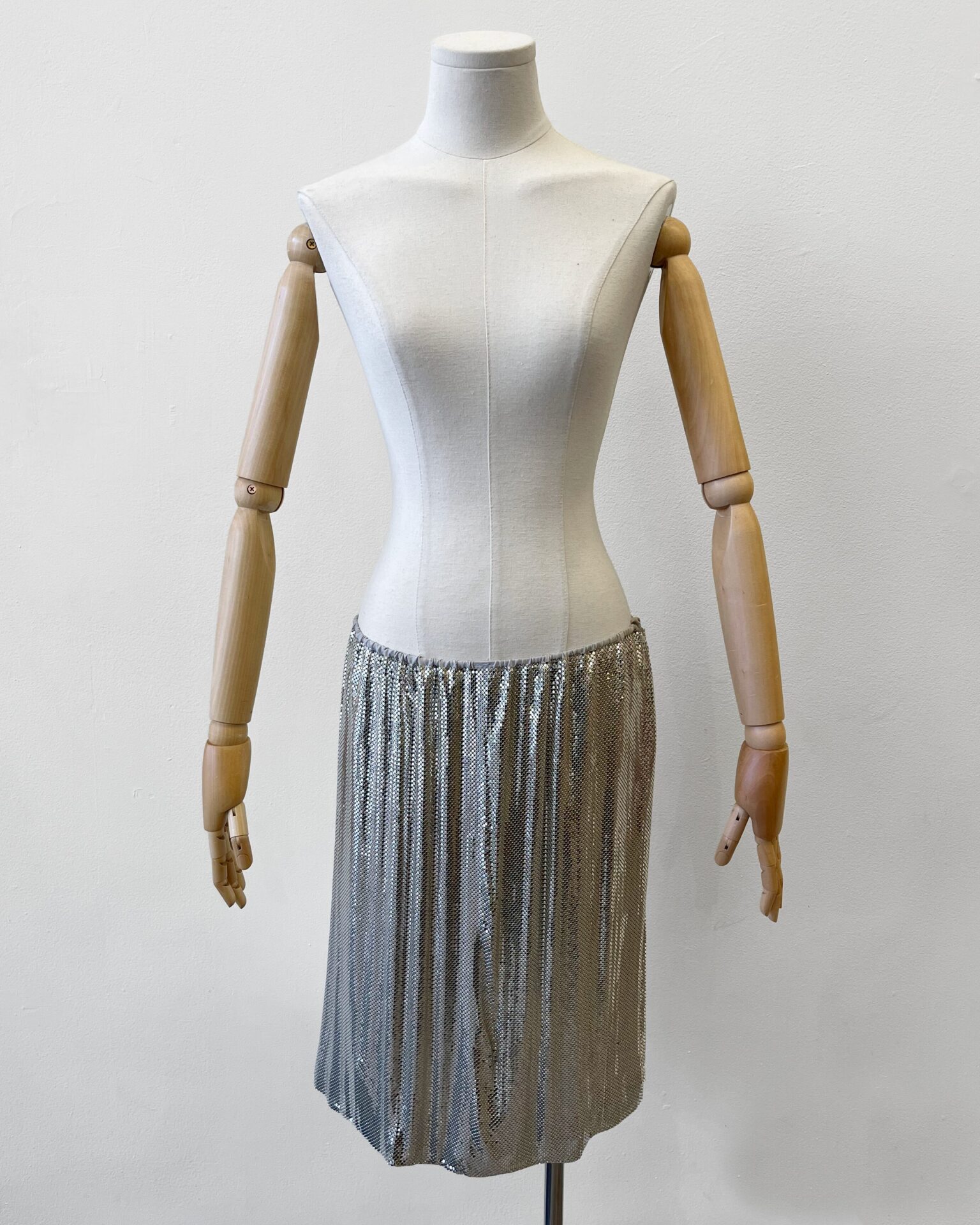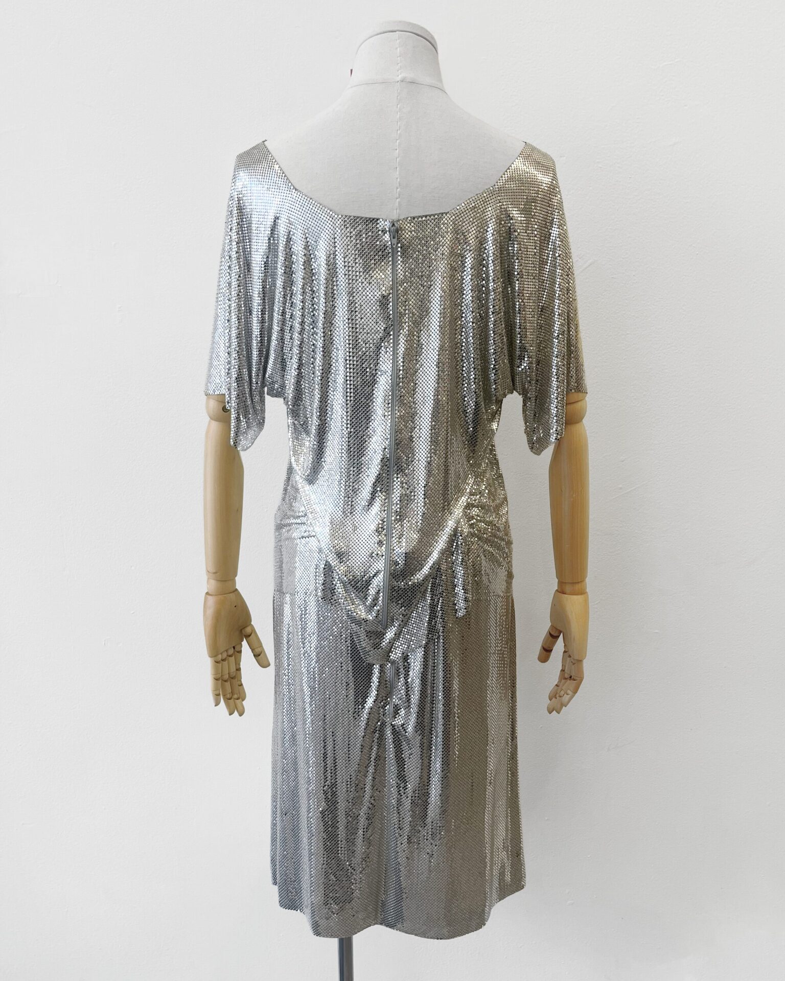 Whiting & Davis 1980’s silver coloured metal mesh 2 piece set with a backzip blouse featuring a silver leather snap-up shaping belt in the back and gathered sides. Skirt is lined and features a backzip and waistband string that ties in the back.