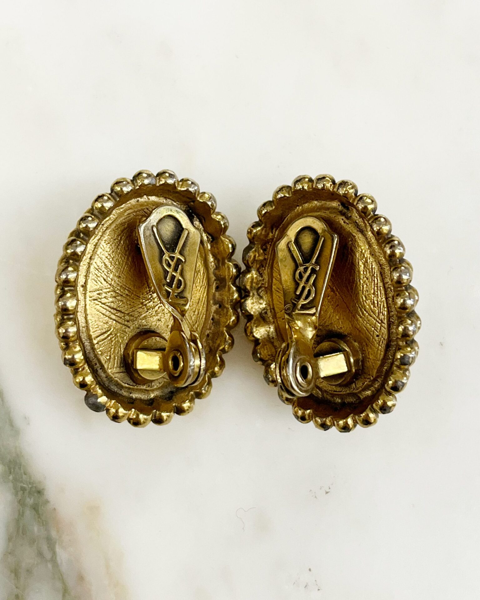 Vintage 1980’s Yves Saint Laurent clip-on gold-tone metal with pearl-style trim & purple glass earrings with ‘YSL’ branded clips.