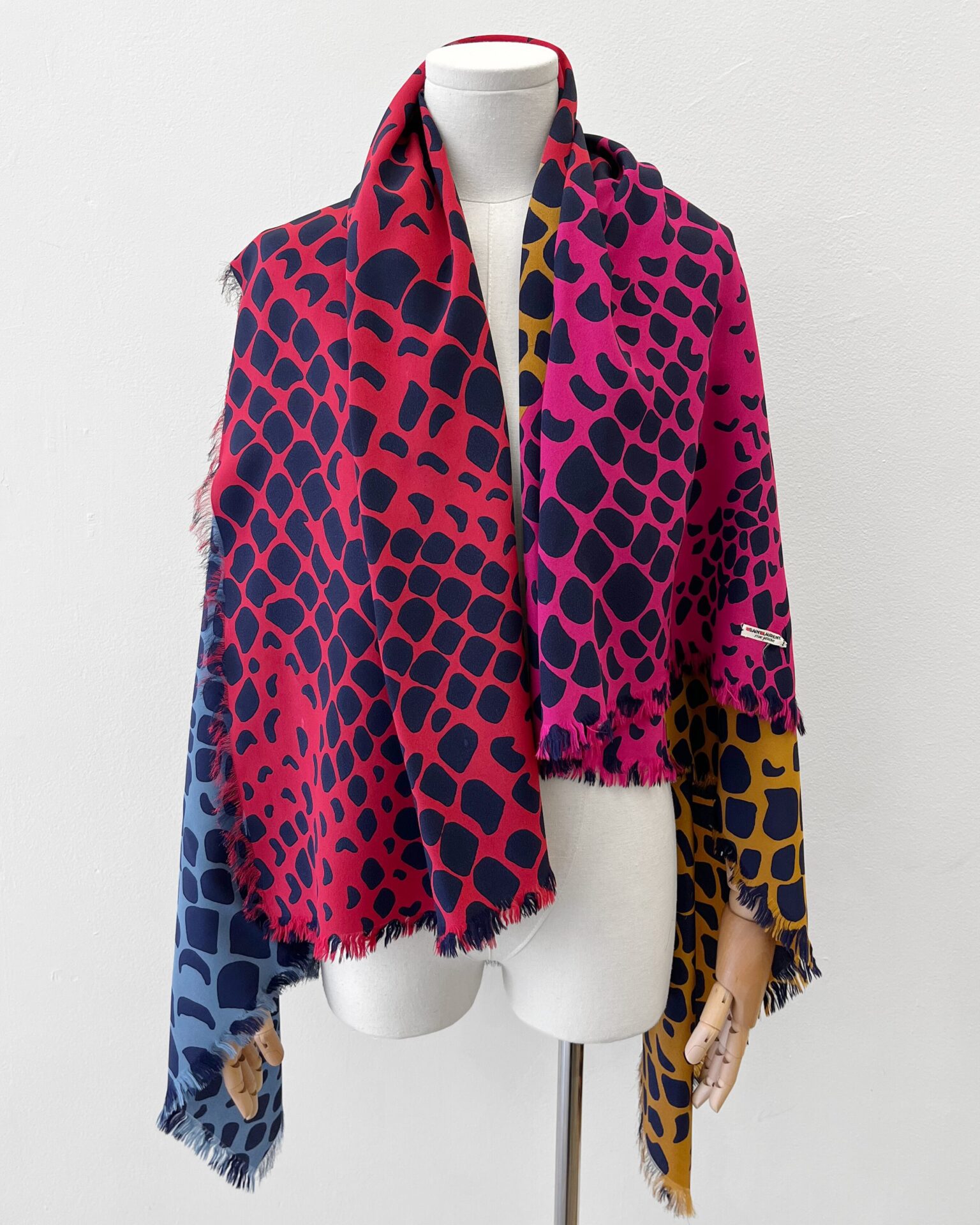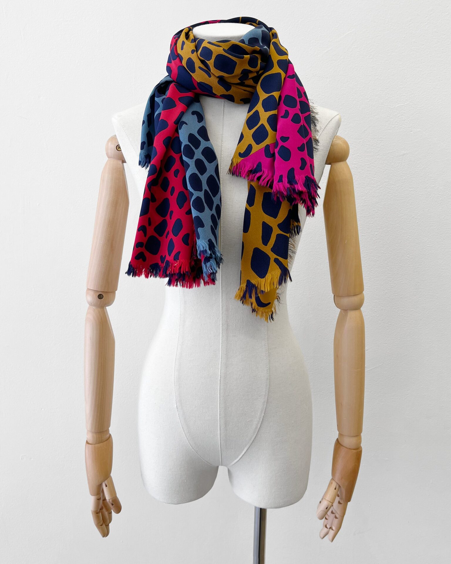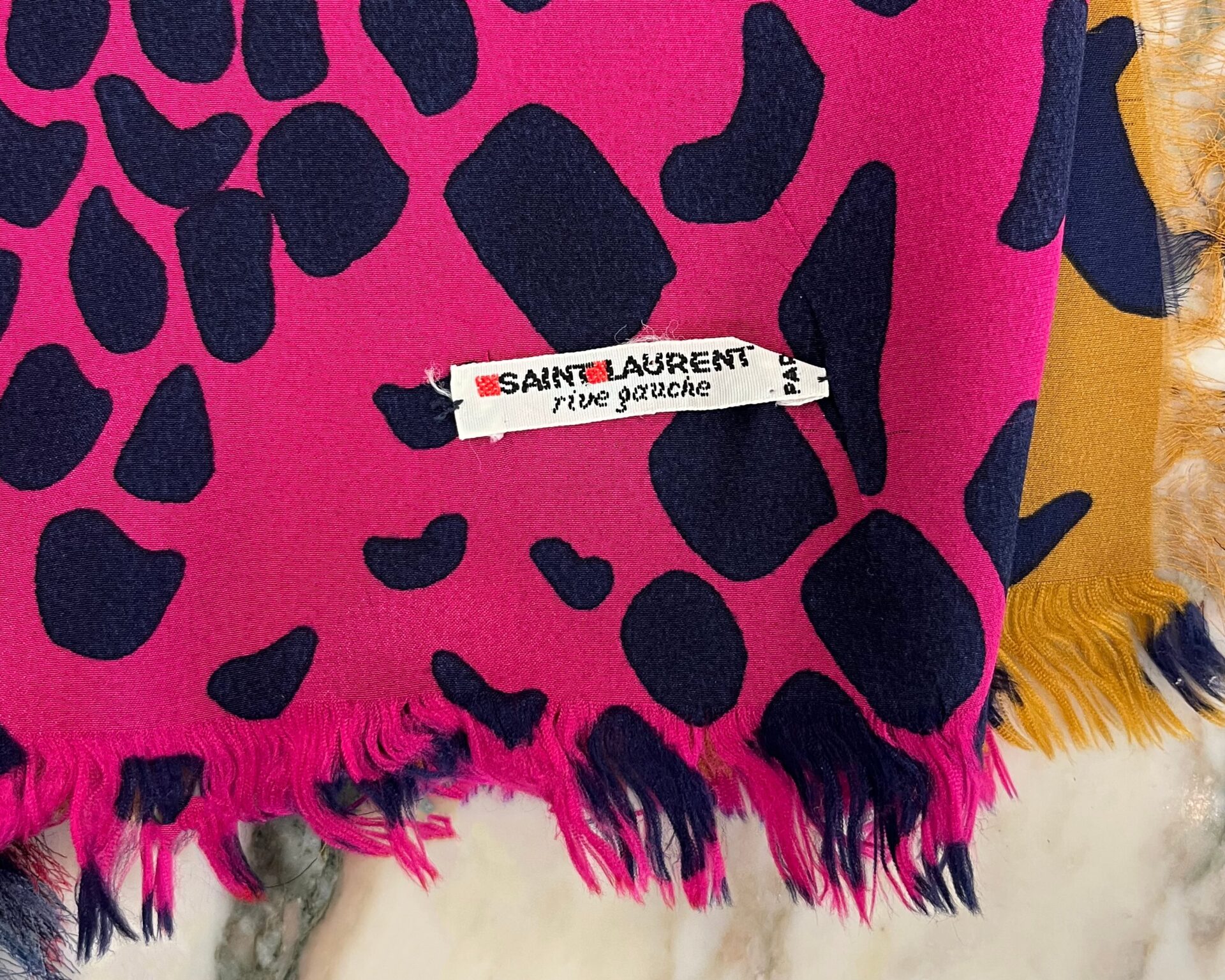 Vintage 1980’s Saint Laurent Rive Gauche blue, red, yellow & magenta scale print raw fringe scarf