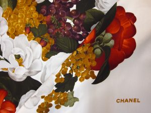Chanel 1990’s fruit and camellia print scarf. Measures 38″². Sold